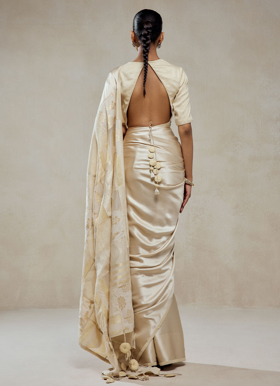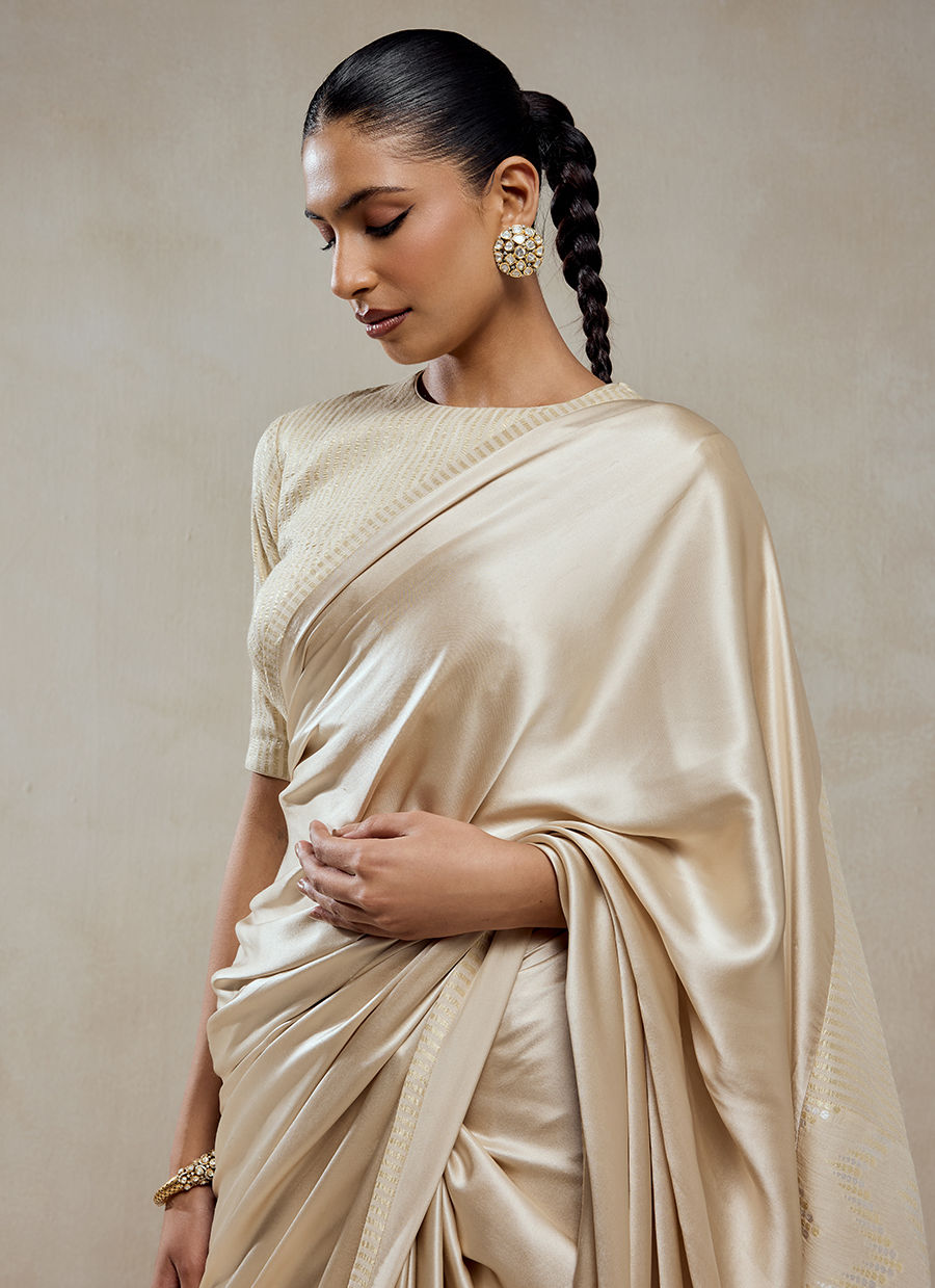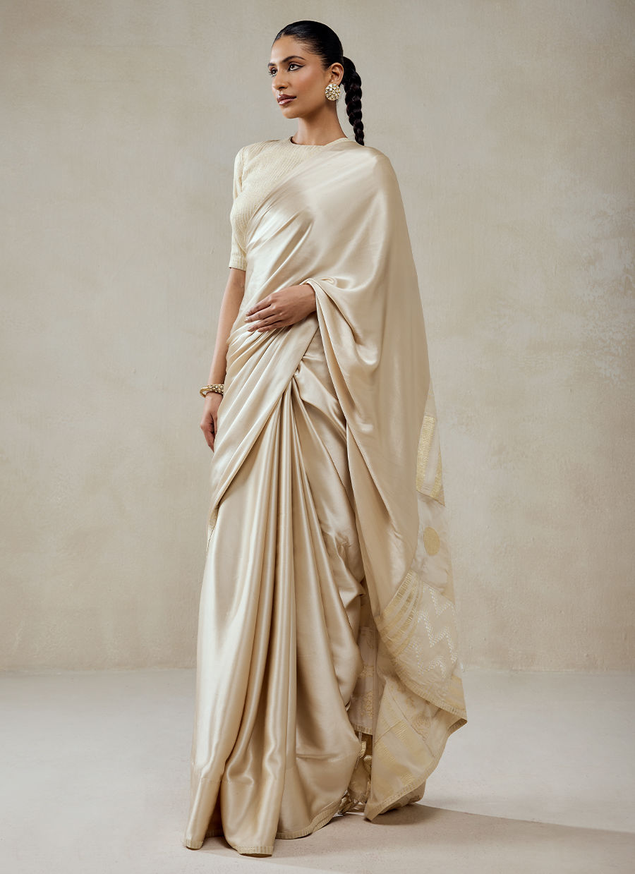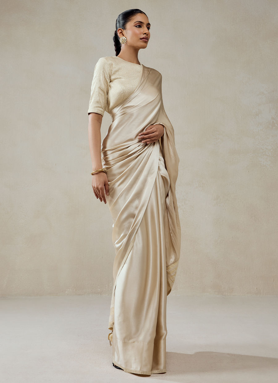 A timeless saree ensemble that embodies understated elegance and fluid grace, crafted in a luxurious blend of monga tissue and shantoon. The saree is intentionally kept minimal and clean, allowing the richness of the fabric to shine. A subtle woven texture and soft sheen across the surface. A delicately finished border with fine detailing, adding just the right touch of definition. The blouse complements with Fine linear texture or subtle patterning, maintaining harmony with the saree’s understated elegance.