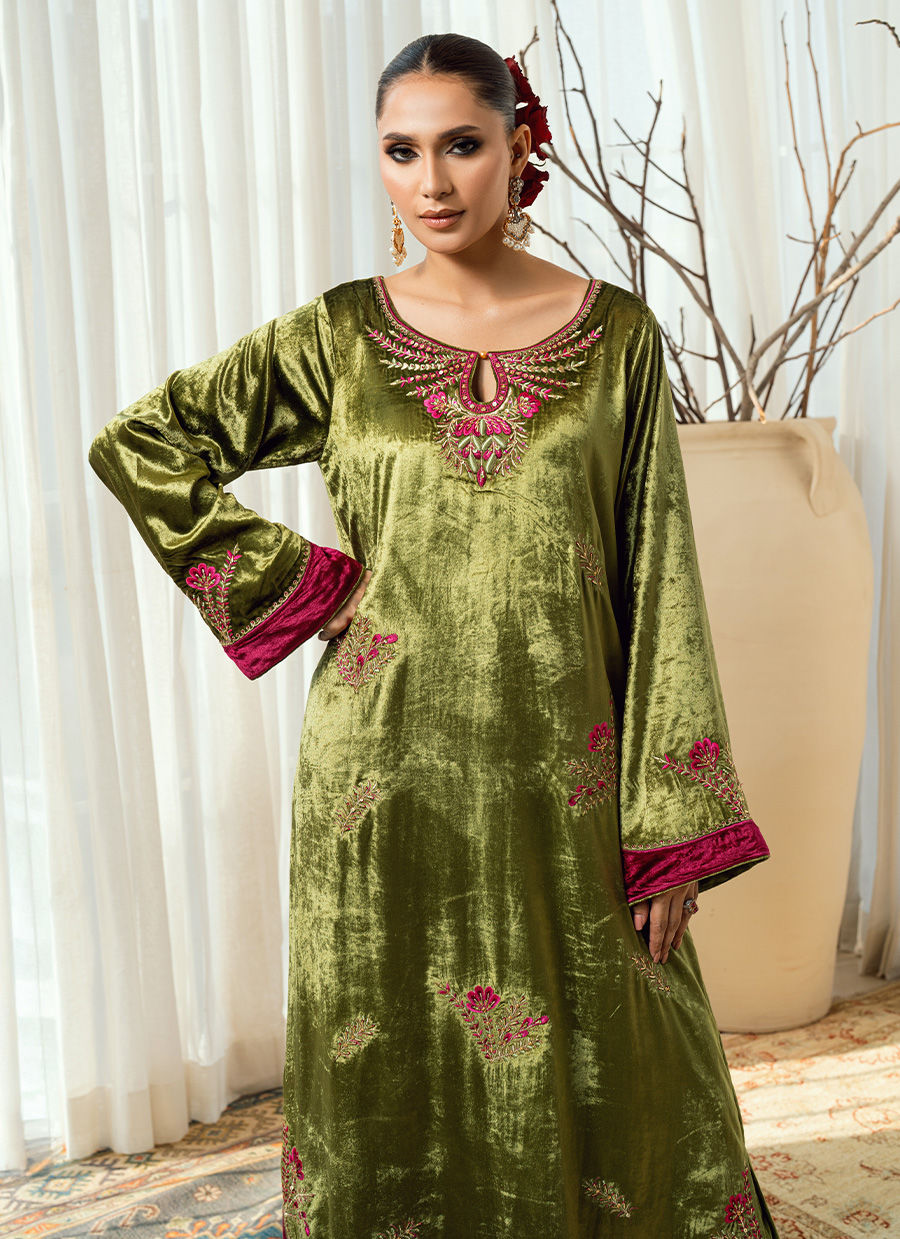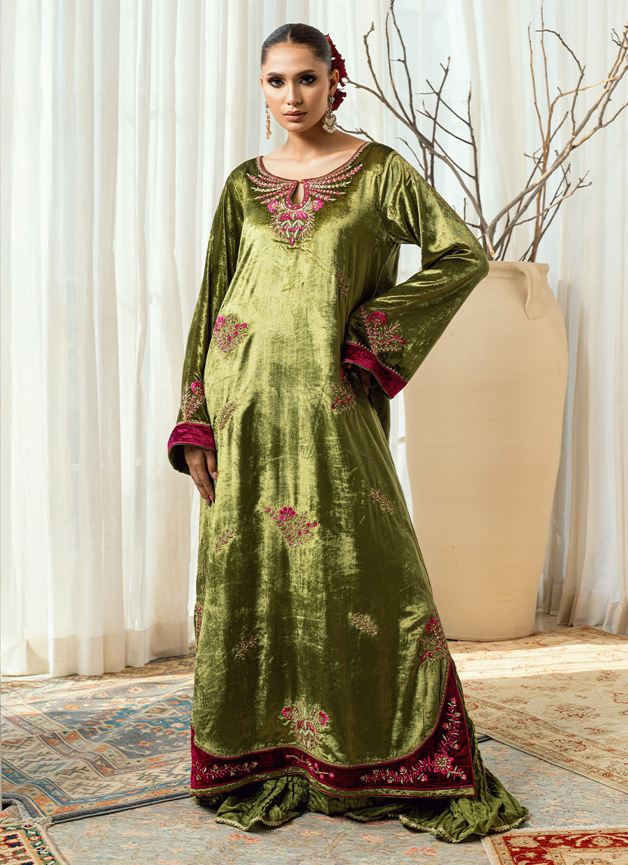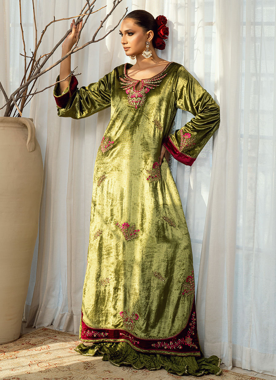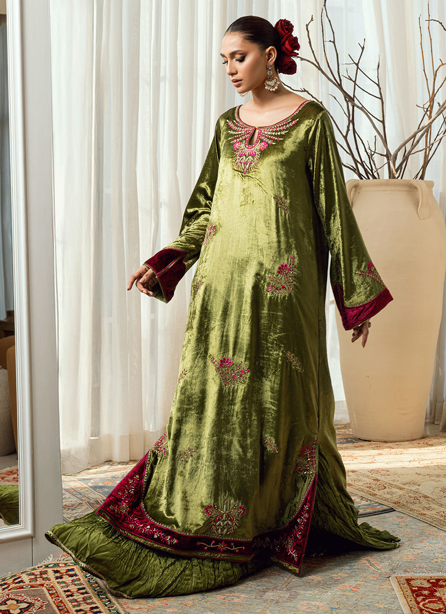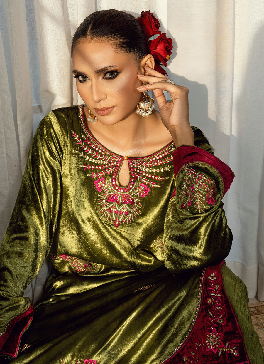 A symphony of color and craftsmanship, Jade Whisper brings together the calm richness of jade with the allure of magenta artistry. The shirt features delicate embroidery and intricate handwork detailing, accentuated with magenta velvet appliqués that add depth and distinction to the serene green base. Paired with a beautiful crushed gharara, the silhouette flows with effortless movement, exuding grace and confidence. Each element—from the hand-embellished motifs to the luxurious texture—is designed to create a timeless ensemble that feels both modern and eternal. Elegant, ethereal, and exquisitely balanced, Jade Whisper is a statement of refined sophistication—perfect for evenings that demand subtle grandeur.