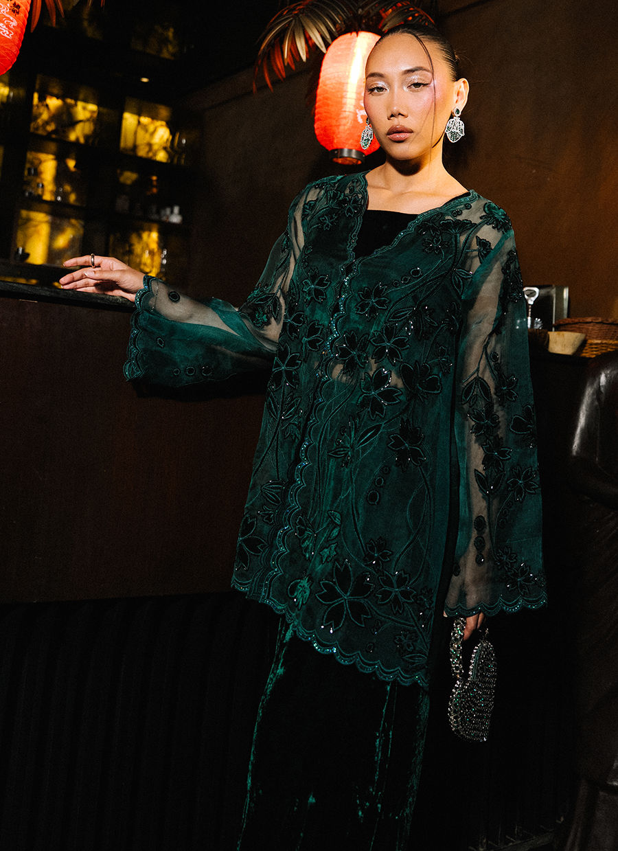 A luxurious front-open organza jacket featuring soft scalloped edges, enriched with velvet appliqués and intricate hand-embellished detailing. The shimmering cutdana and sequin work add a refined sparkle, elevating the jacket’s airy elegance. It is paired with a rich velvet bandeau and matching wide-leg velvet pants, creating a striking contrast of texture and sophistication. A contemporary yet opulent ensemble perfect for evening glamor.