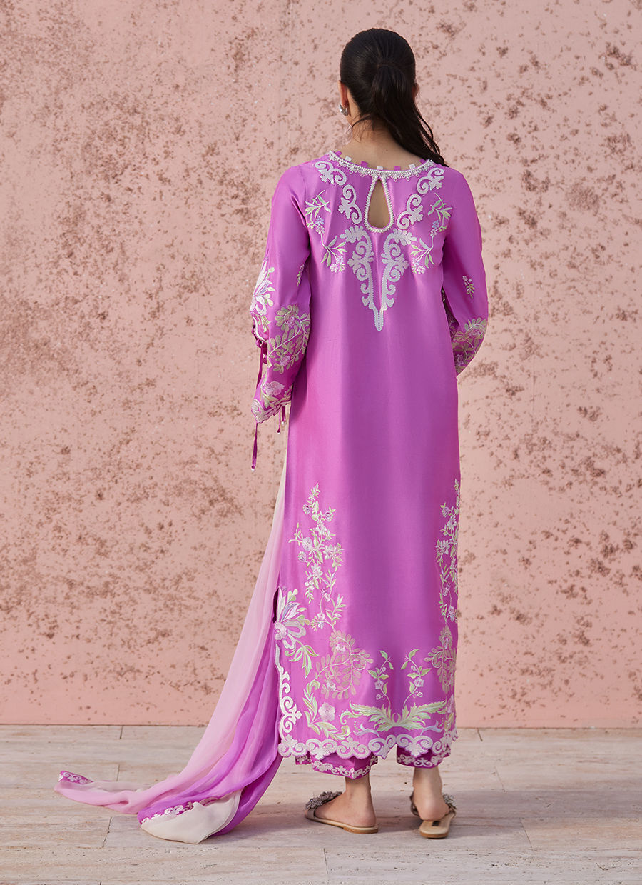 Paired with a flowing pure chiffon dupatta in soft tonal hues and a raw silk izaar finished with an embroidered border, the ensemble moves with a light, graceful rhythm — striking the perfect balance between bold color and delicate detailing.