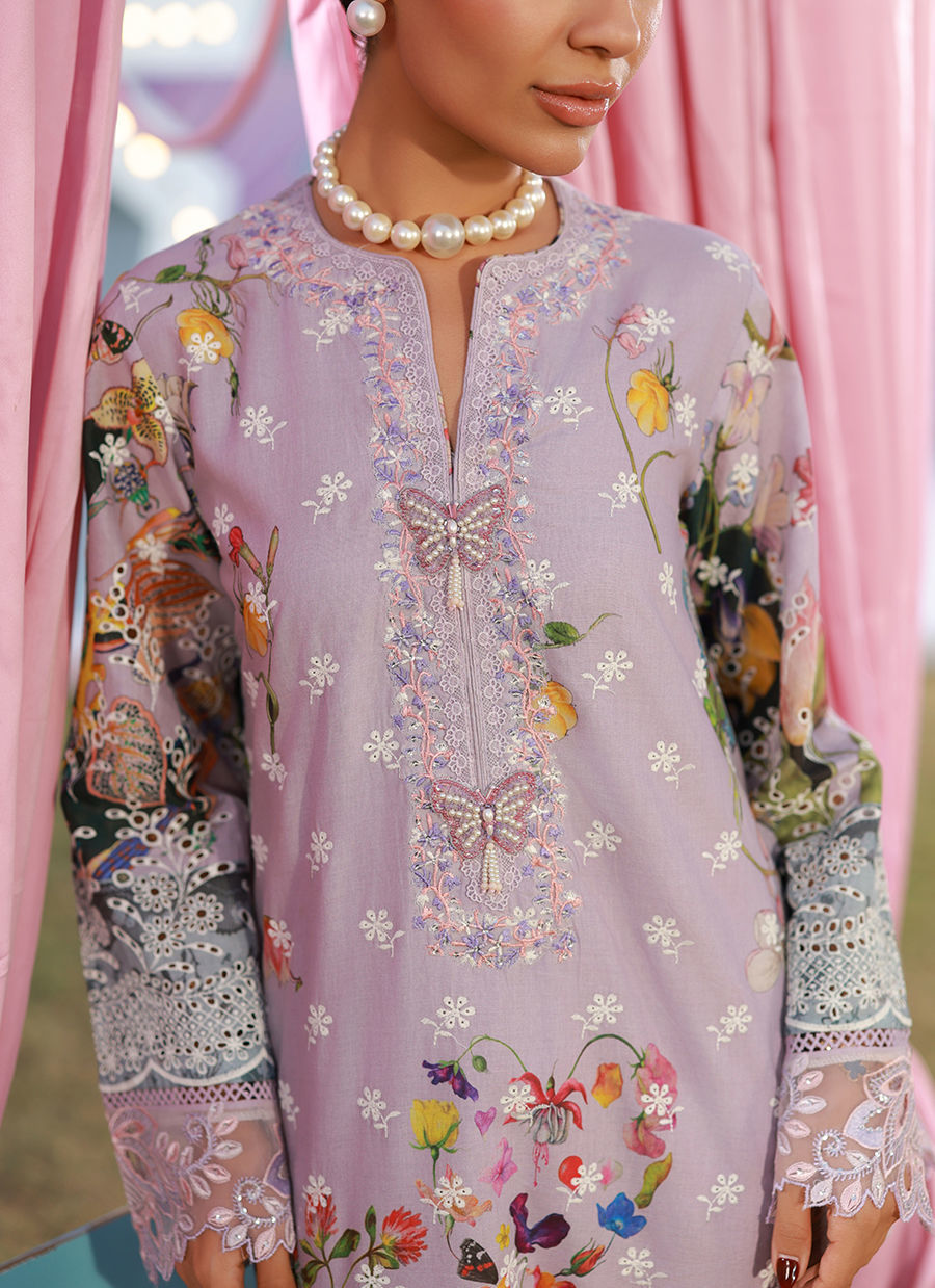 A lilac printed schiffli kaftan featuring elegant cutwork and lace detailing on the sleeves and hem, complemented by butterfly embellishments at the neckline. Comes with an attached lining for added comfort