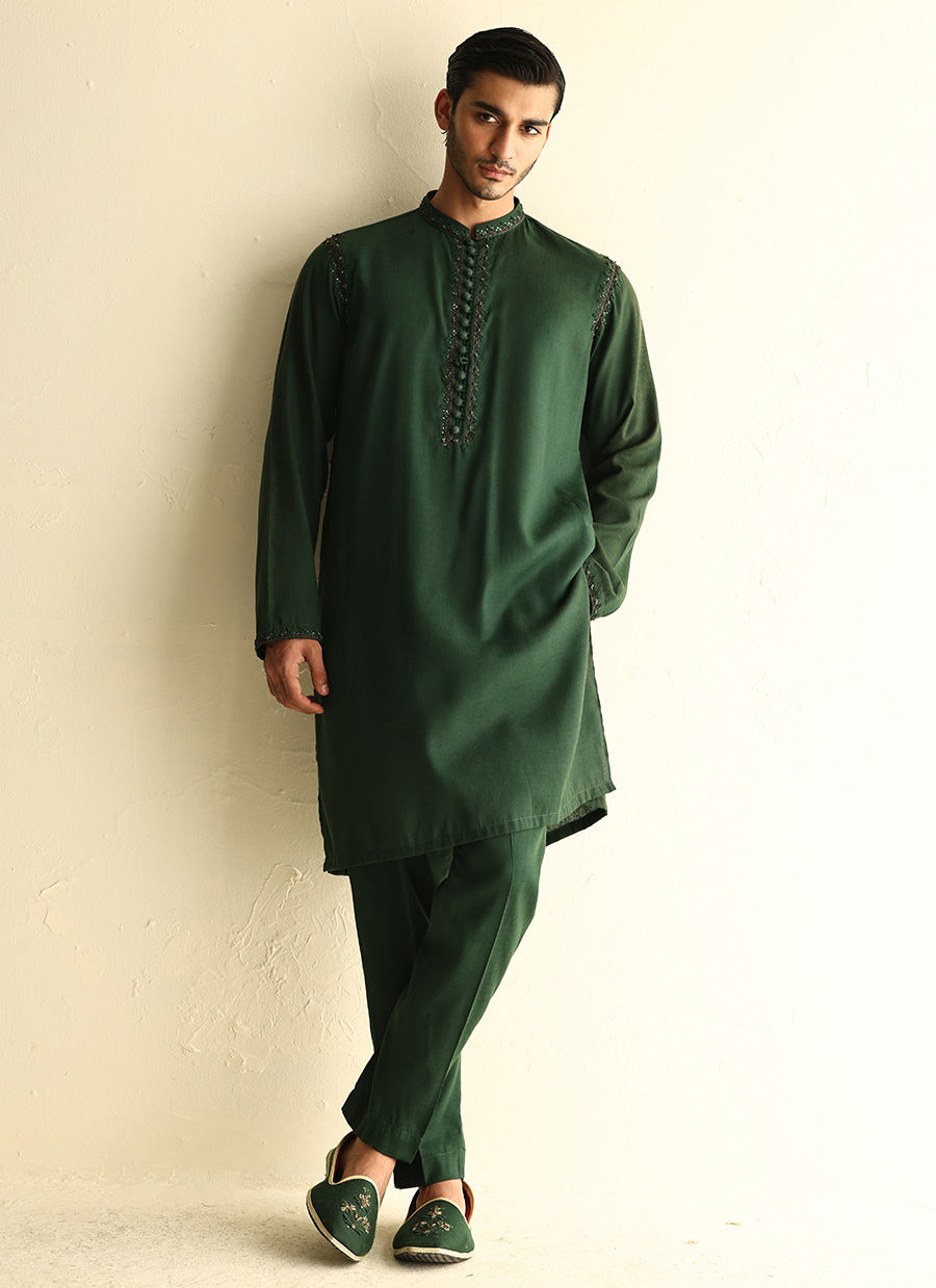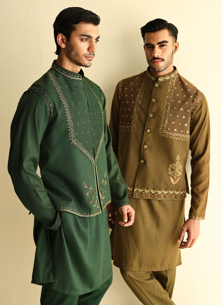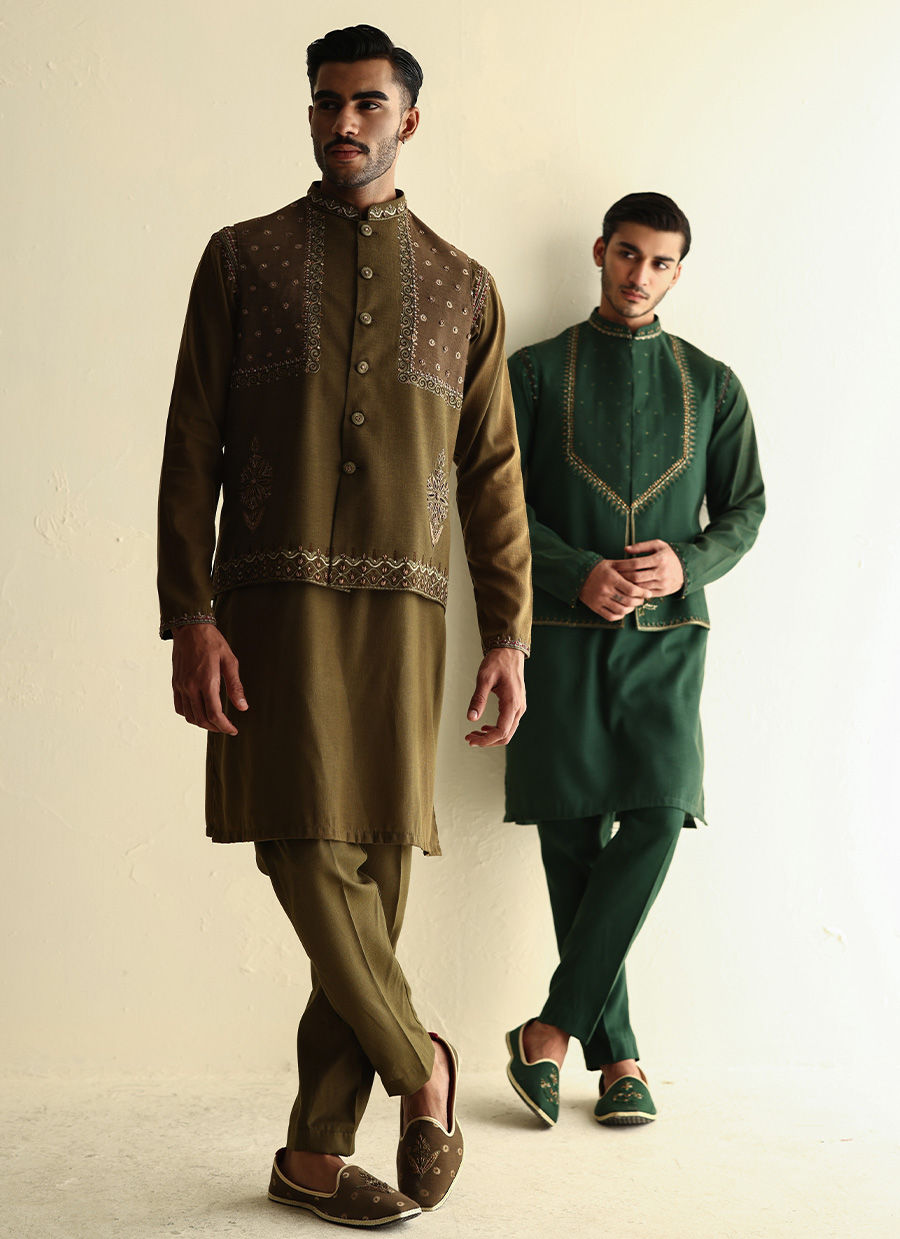 Linen kurta with hand-embroidered collar, sleeves, and shoulders, paired with a heavily embroidered linen waistcoat for a refined yet contemporary look
