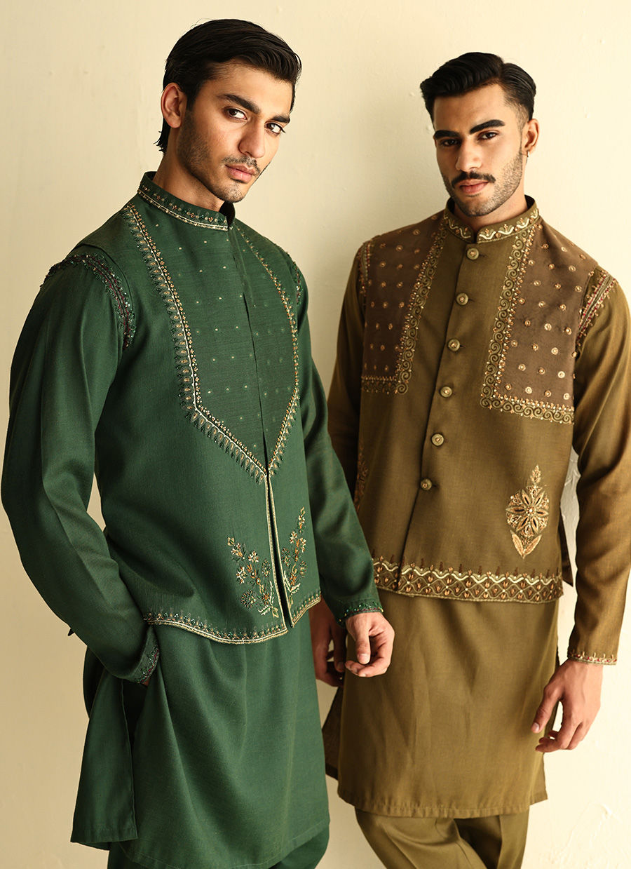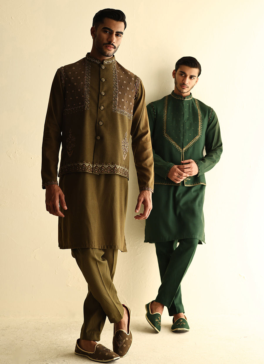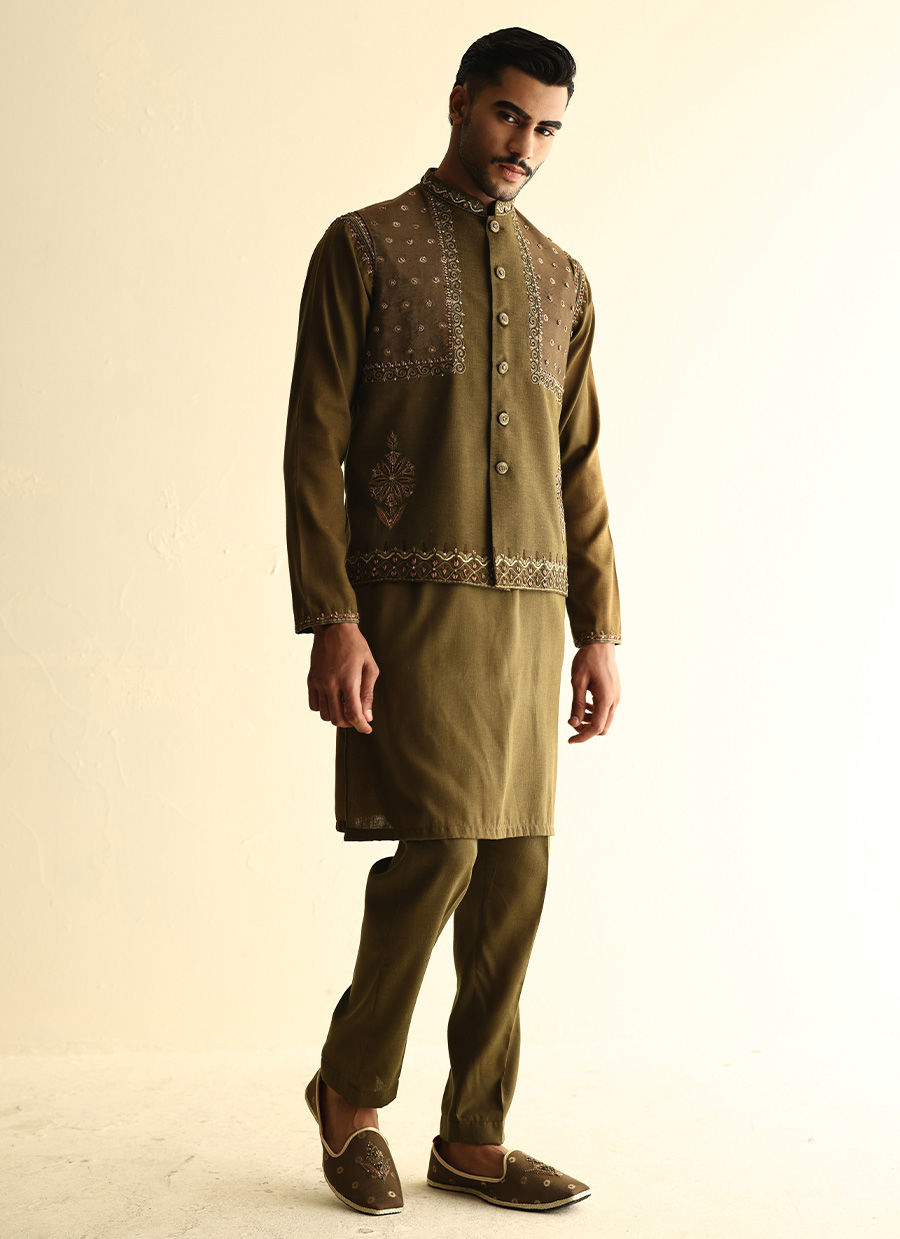Linen kurta with hand-embroidered collar, sleeves, and shoulders, paired with a heavily embroidered linen waistcoat for a refined yet contemporary look