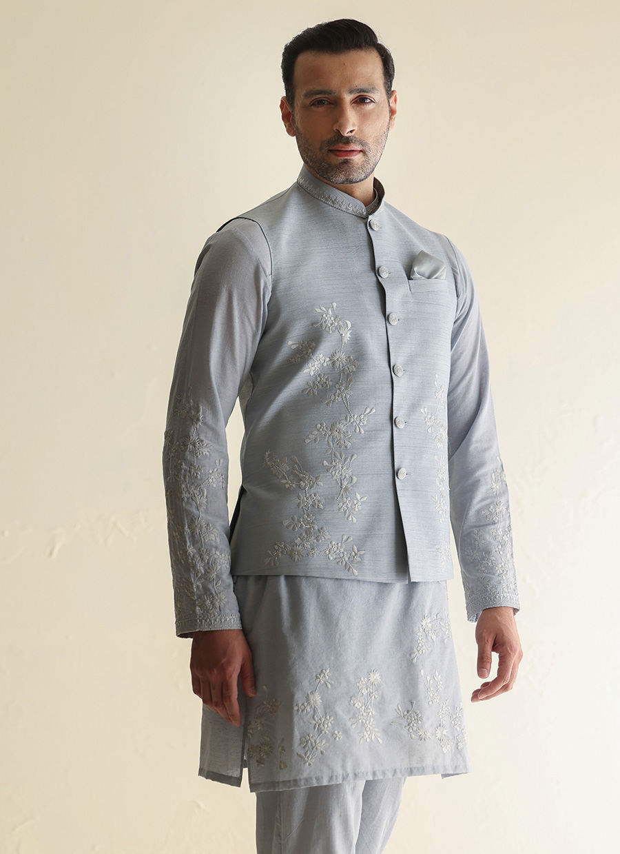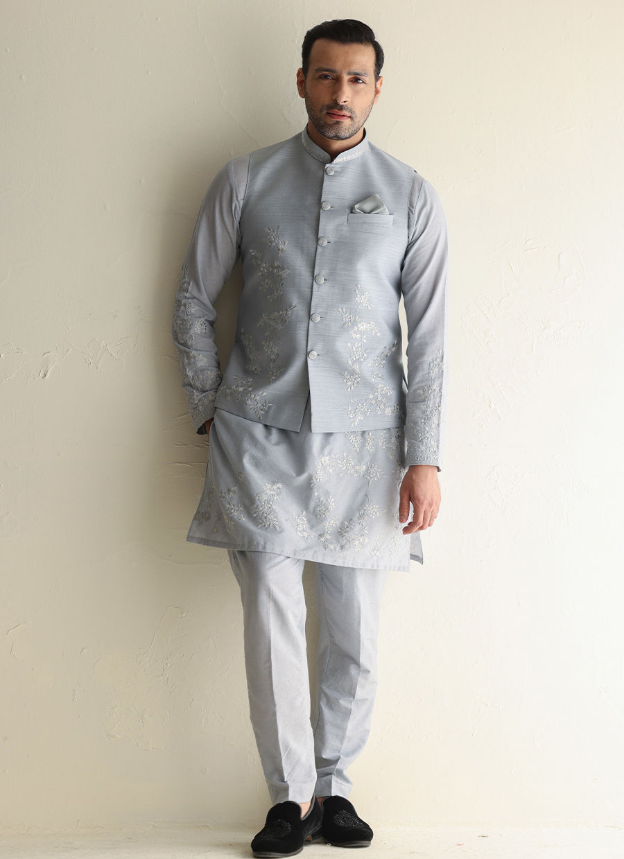 An embroidered raw silk waist coat paired with a khaddi silk kurta pajama