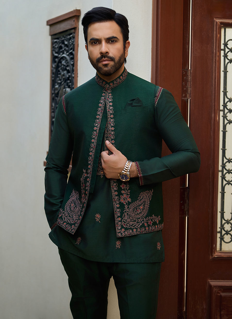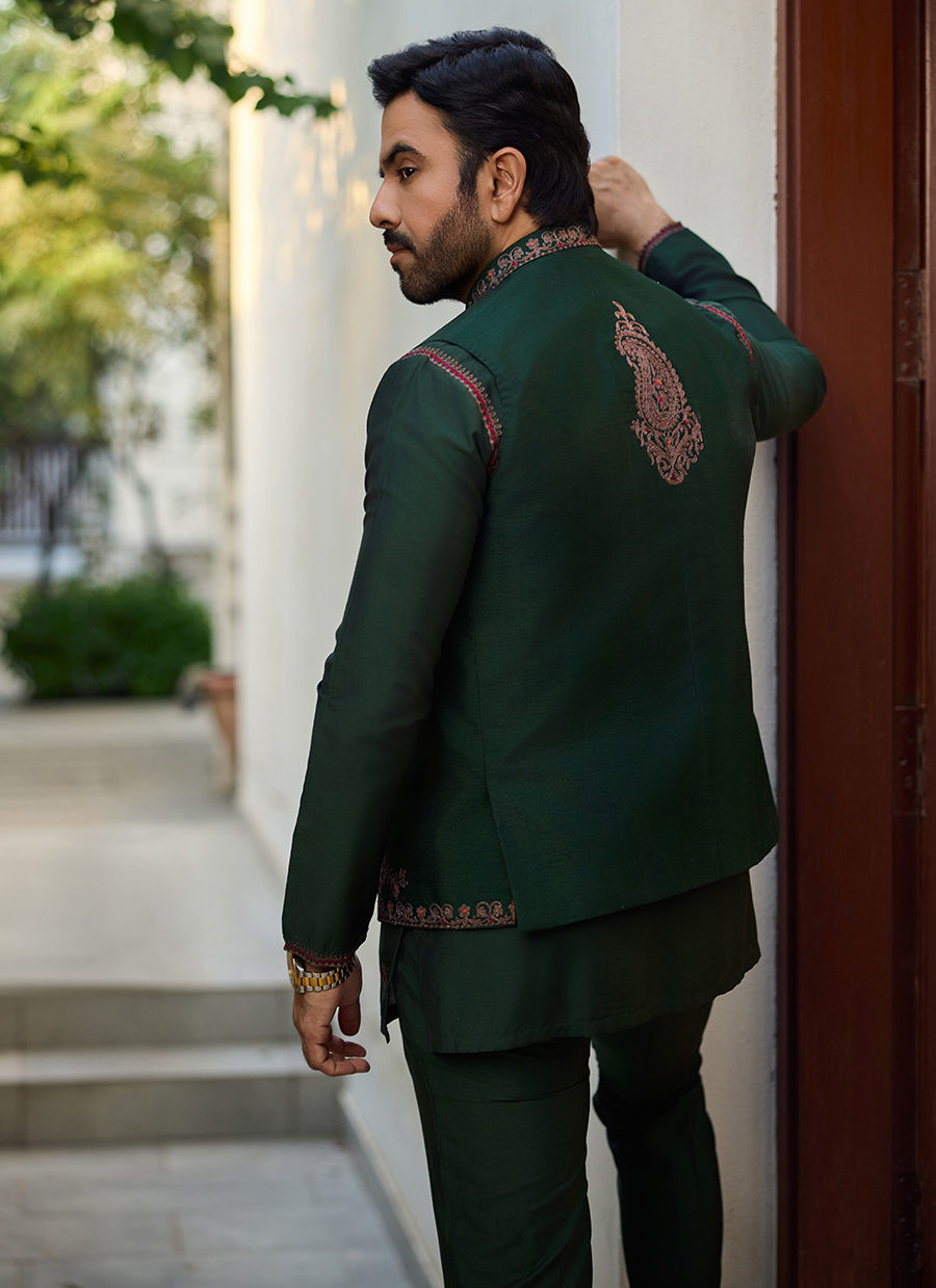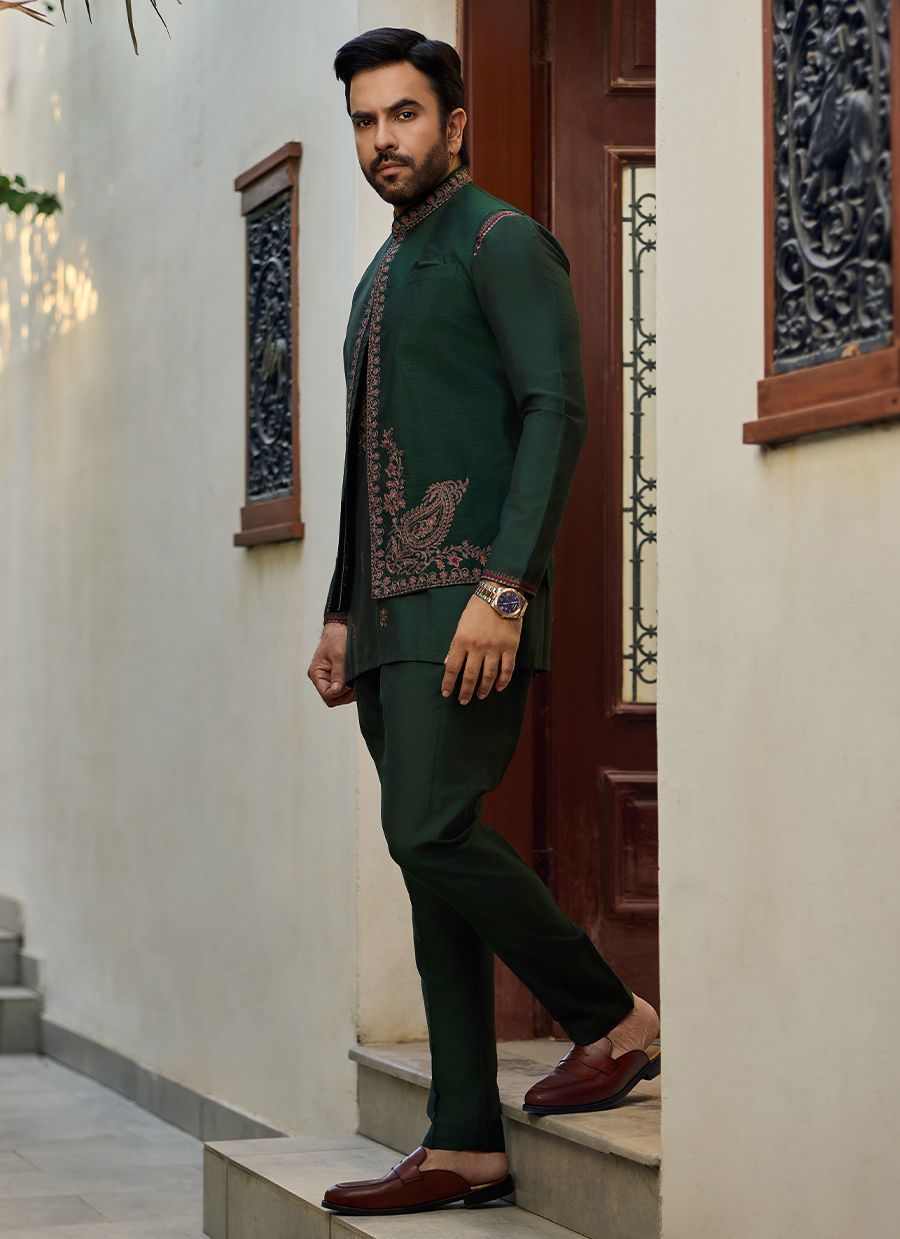 A masterpiece of Pakistani ceremonial wear, this waistcoat is crafted from rich Raw Silk in a lustrous shade embrald green. The entire front surface, the structured Band collar, and the hem are completely enveloped in intricate, high-density Resham and Zari hand-embroidery. The repeating geometric and floral motifs create a rich, tactile tapestry that reflects light and provides depth. Paired effortlessly over an embrald green matching kurta, this waistcoat is the ultimate investment piece for a groom's sibling, a wedding guest, or any high-end festive occasion.