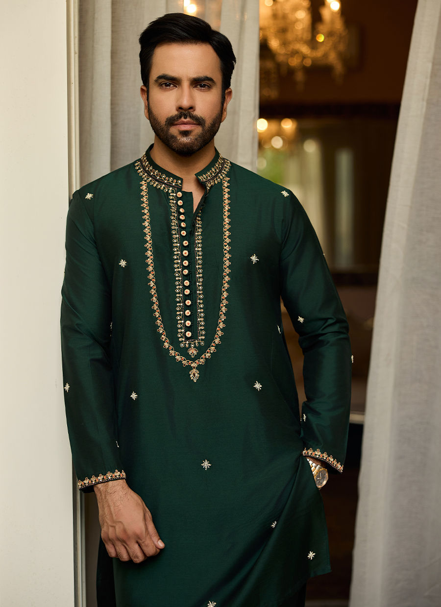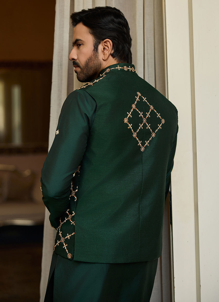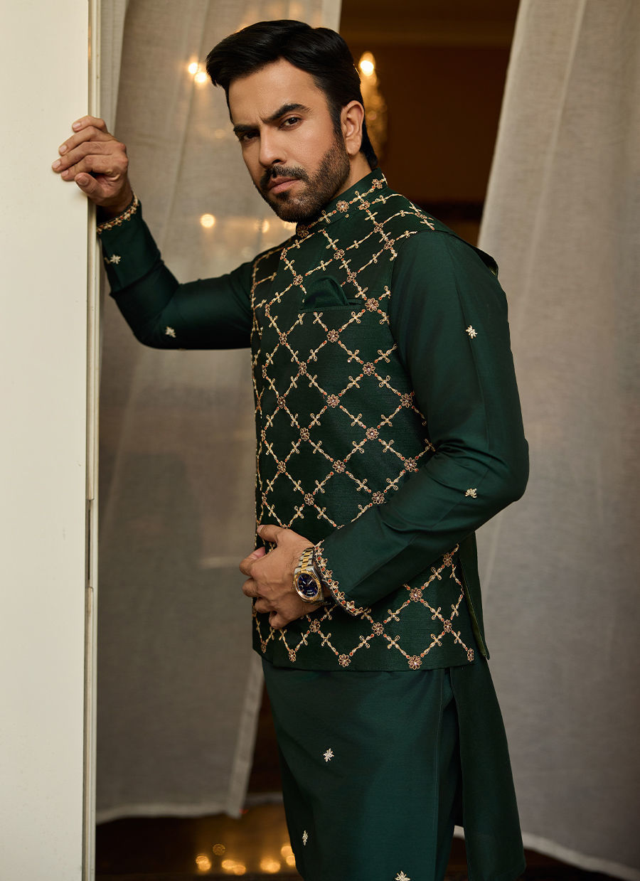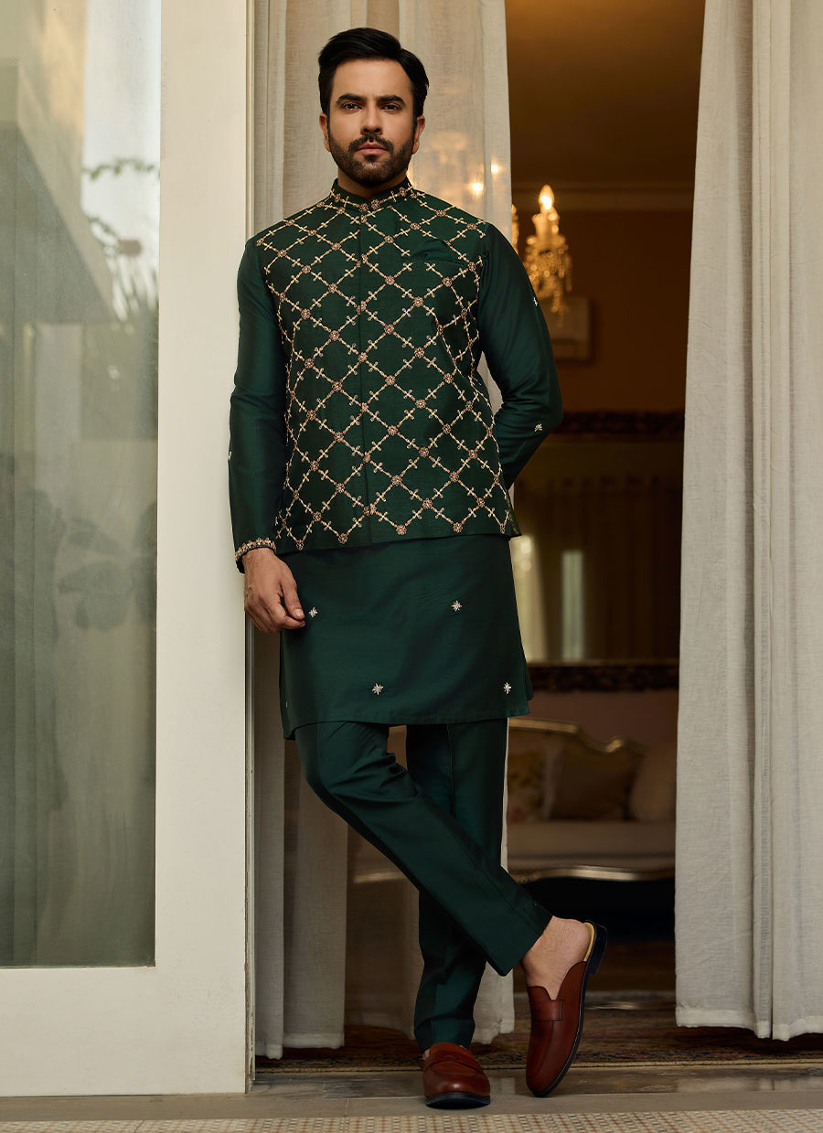 Perfectly balancing tradition with modern structure, this ensemble features a clean, tailored Deep Emerald Green Kurta and Trouser set. The highlight is the Structured raw silk Waistcoat, crafted in the same rich hue. The waistcoat is meticulously embroidered with a striking, all-over diamond lattice (jali) pattern in contrasting hand embroidery. This geometric embroidery adds a contemporary texture and visual pop, making the waistcoat the commanding centerpiece of the outfit. An ideal choice for Mehndi events, festive dinners, or sophisticated daytime celebrations.