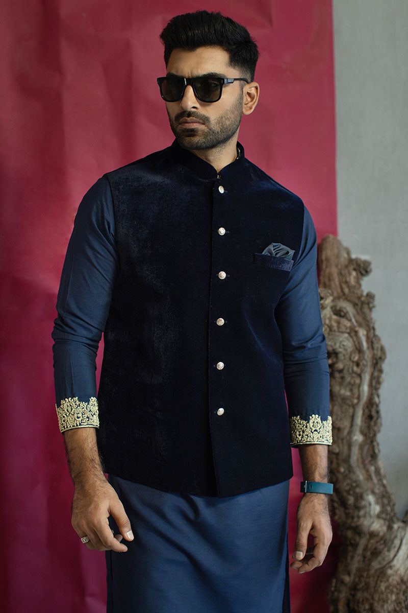 Color: Navy Blue Fabric: Velvet Work Details: Button Detailing