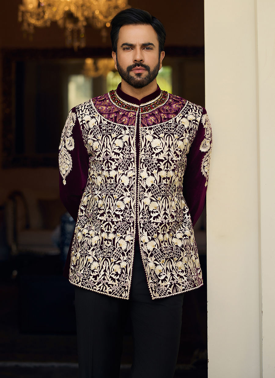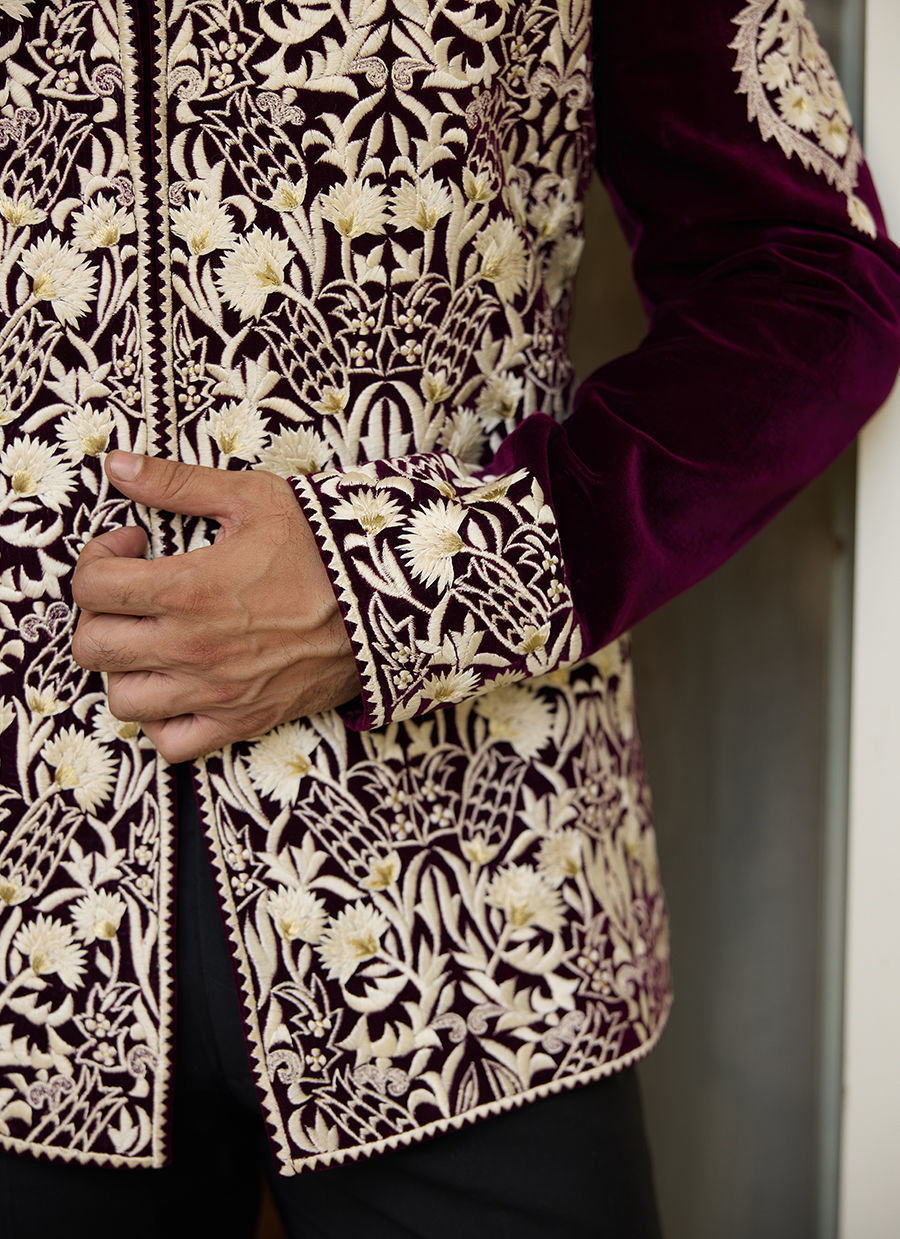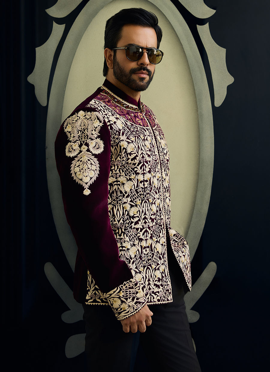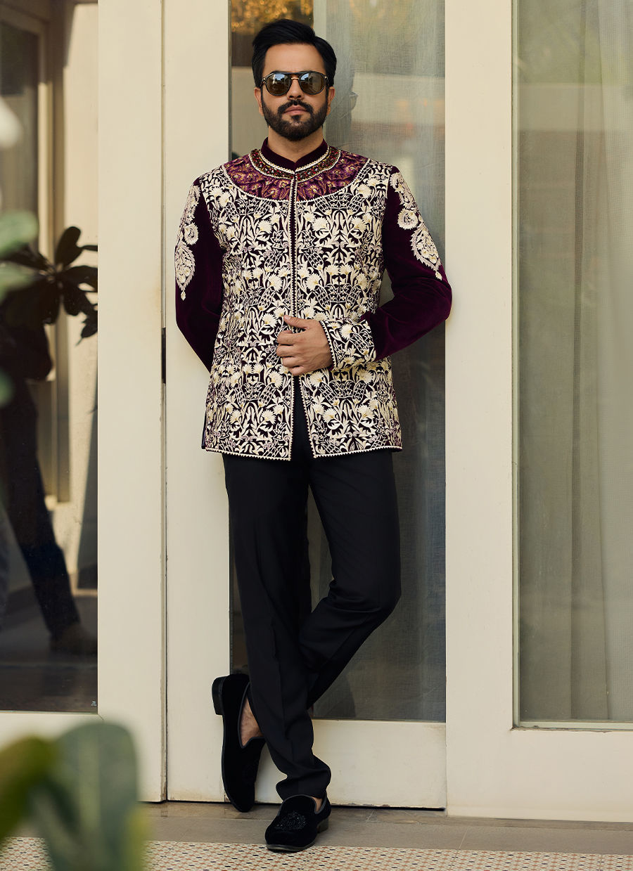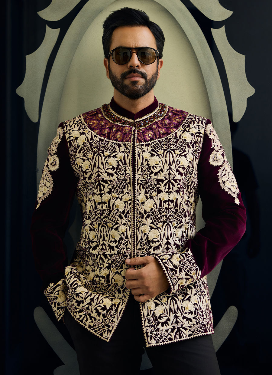 Step into sartorial royalty with this opulent Bandhgala jacket. Crafted from deep Maroon Velvet, the jacket features breathtaking, dense Aari and Zardozi work . The intricate, swirling motifs cover the entire front and high jewelled collar, creating a stunning visual contrast that exudes power and tradition. Paired effortlessly with impeccably tailored black dress trousers, this jacket is designed for the modern gentleman who commands the spotlight at weddings, formal dinners, or cultural galas.