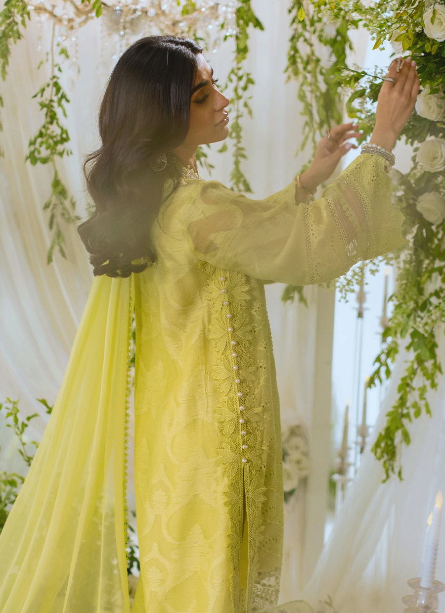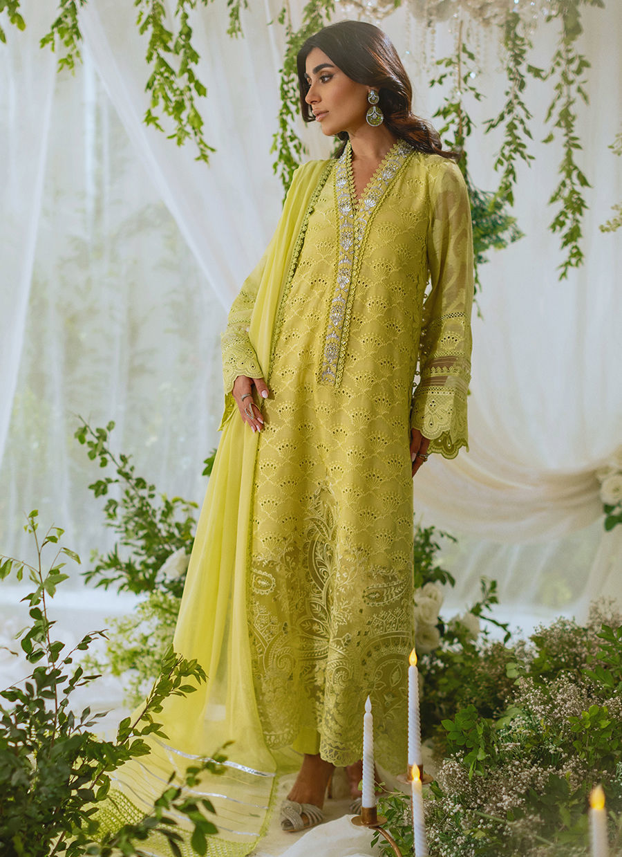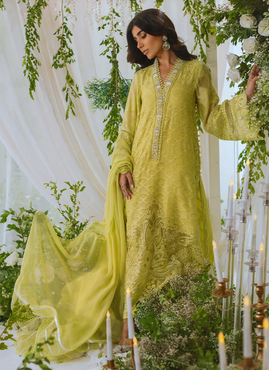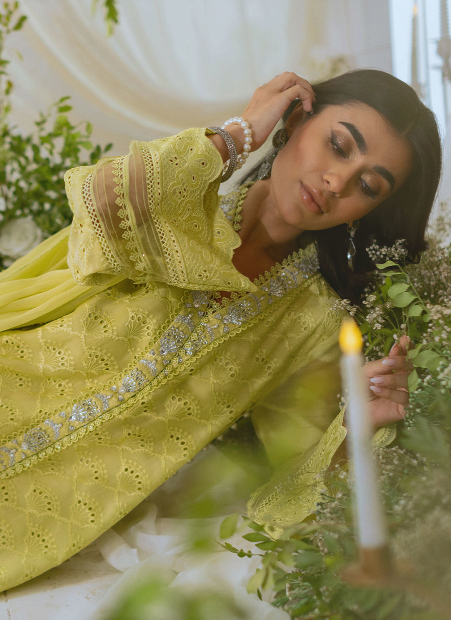 Color: Kiwi Green Fabric: Schiffli Work Details: Zardozi Detailing