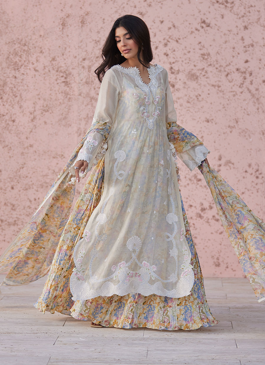 The shirt, crafted in khaddi silk, is adorned with intricate embroidery that adds texture without overpowering the softness of the design. Paired with a flowing inner maxi in khaddi silk, the silhouette gains movement and depth, creating a gentle, fluid fall with every step. The interplay of layers gives the outfit a soft, ethereal presence.