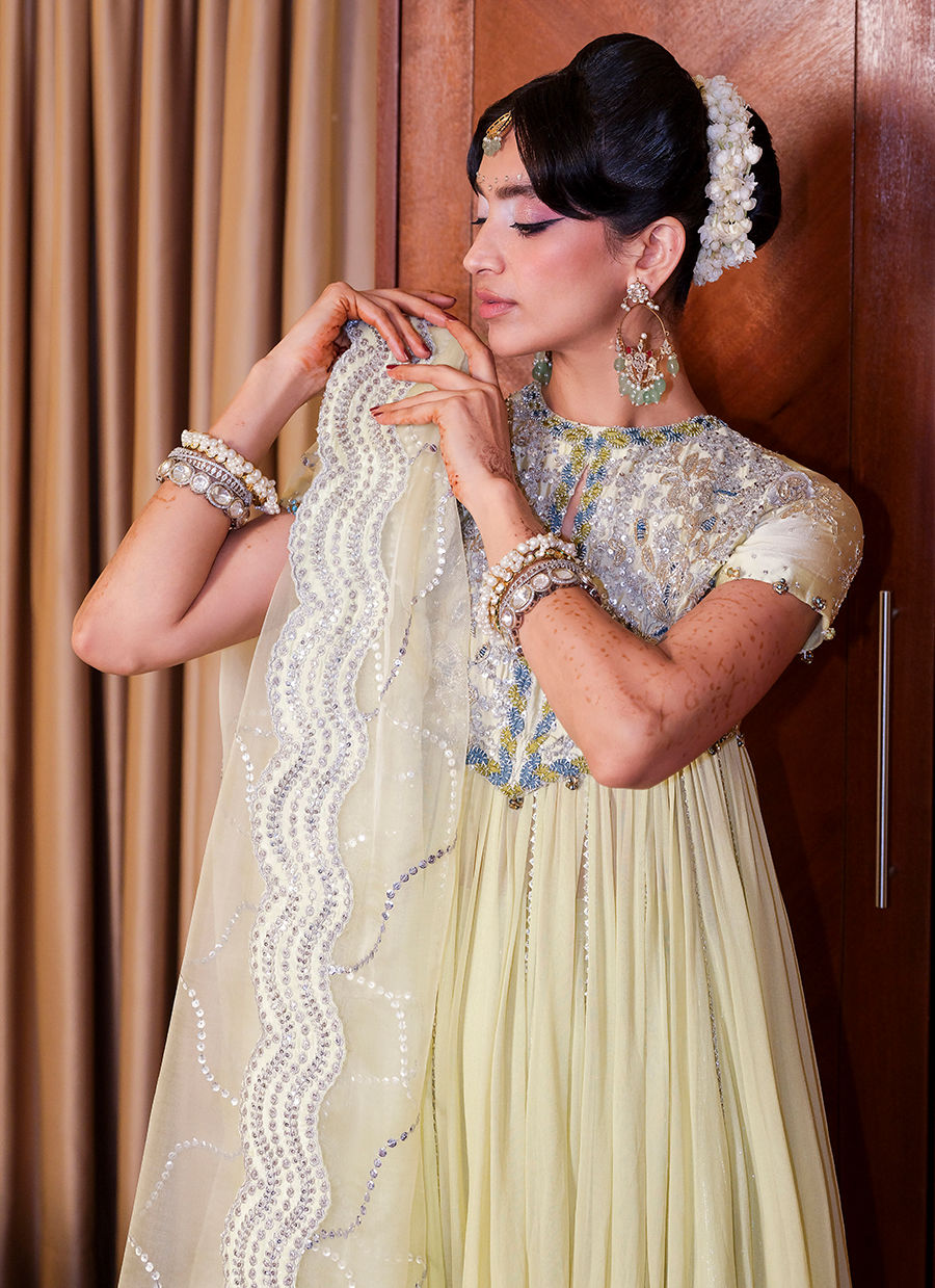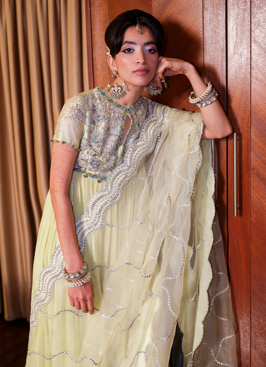 Includes: Pishwas with Lehenga Jugnu Pari - In a radiant butter yellow hue, Jugnu Pari captures the essence of festive grandeur with a floor-length pishwas crafted in chiffon and tissue silk. Boasting an impressive fourteen yards of flare, the silhouette is enhanced with gathered detailing, a block-printed border, and hand-embellished sequins. The bodice is richly adorned with intricate embellishments and features a graceful front keyhole, paired with delicate embellished cap sleeves. A shimmer lehnga adds depth and glamour to the ensemble, while the organza dupatta, finished with scalloped sequin lines, borders, lappa, and gleaming accents, completes this luminous look made to dazzle.