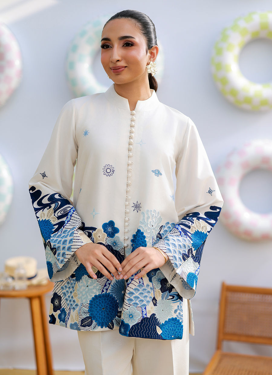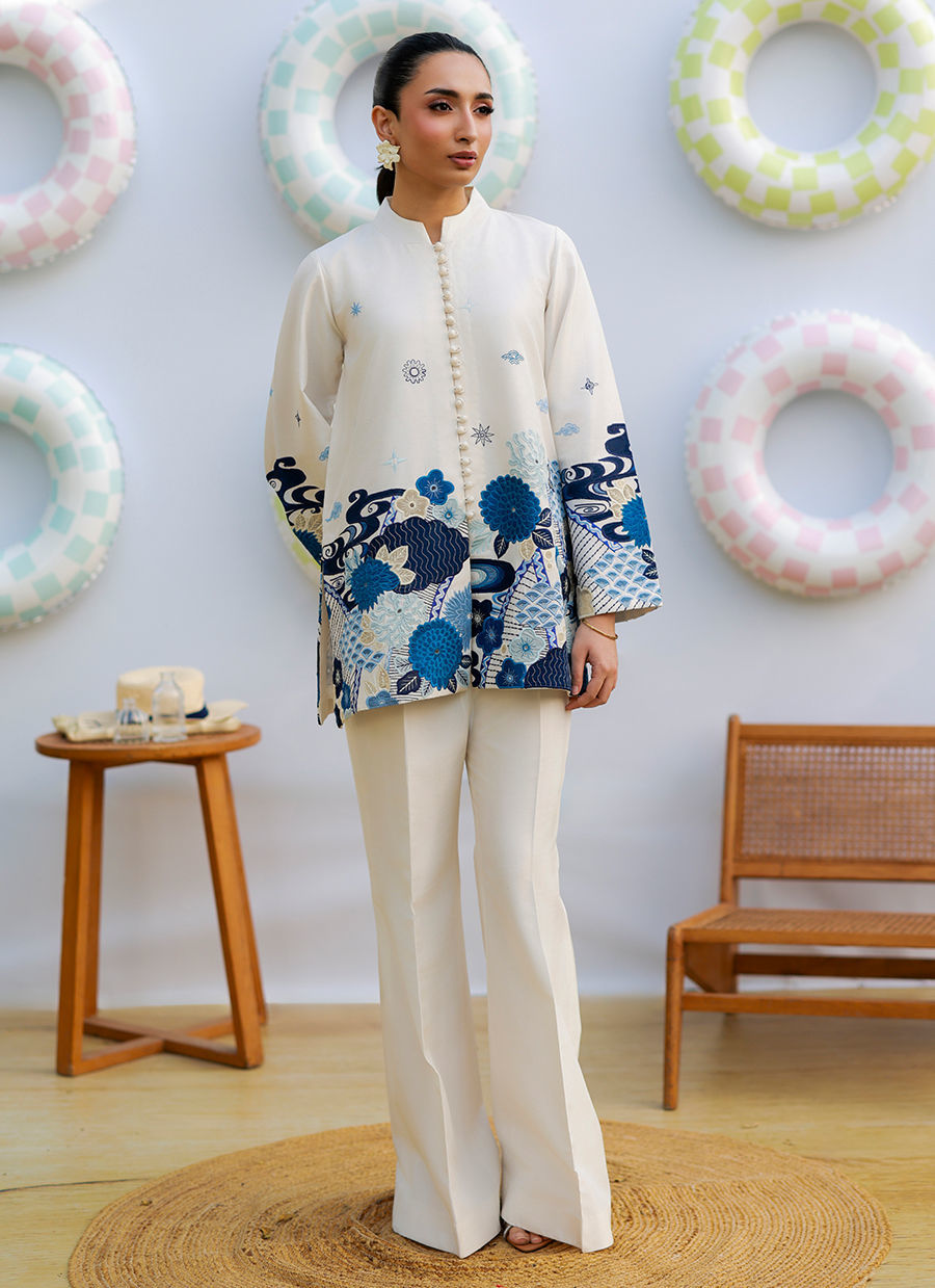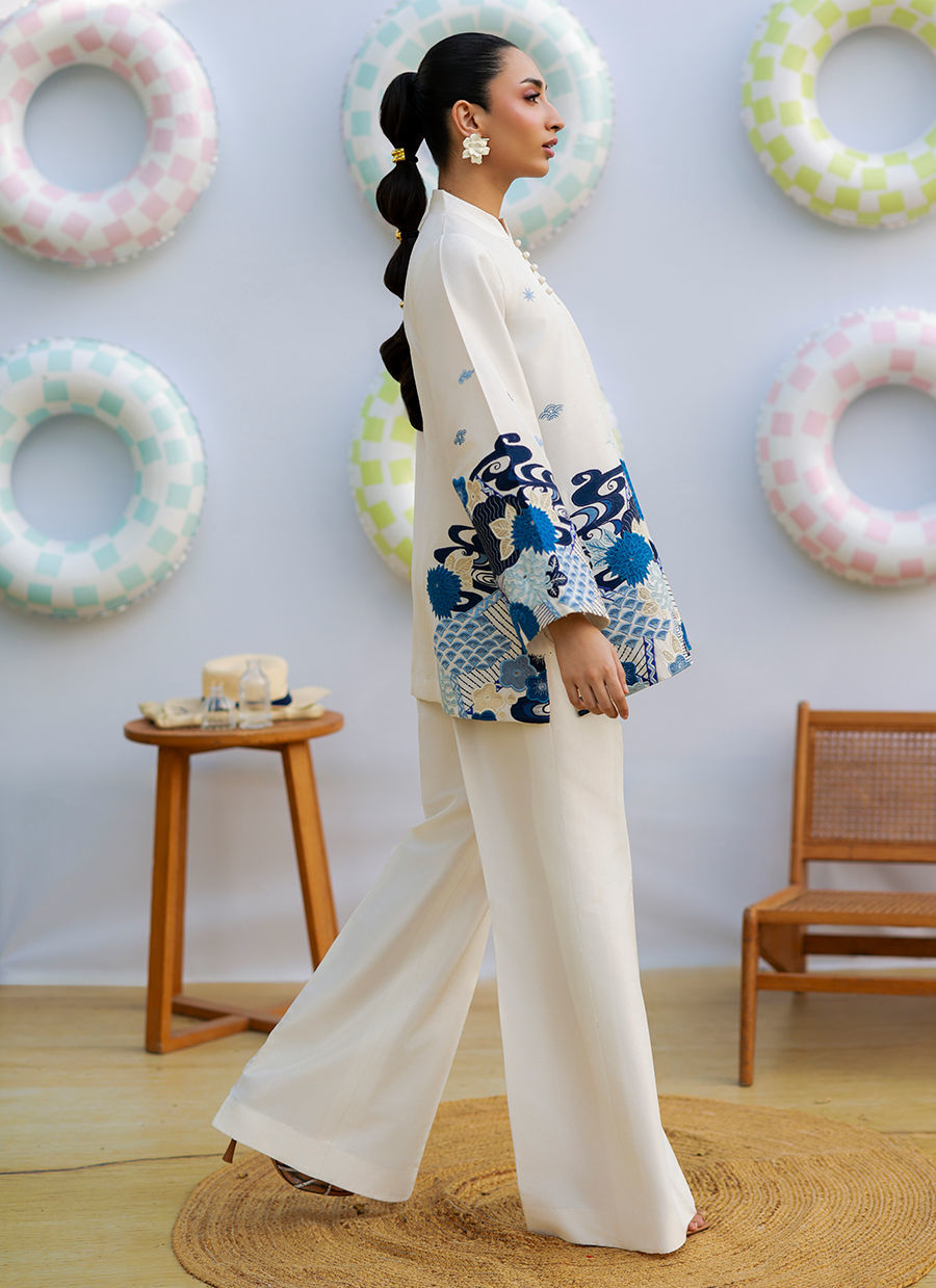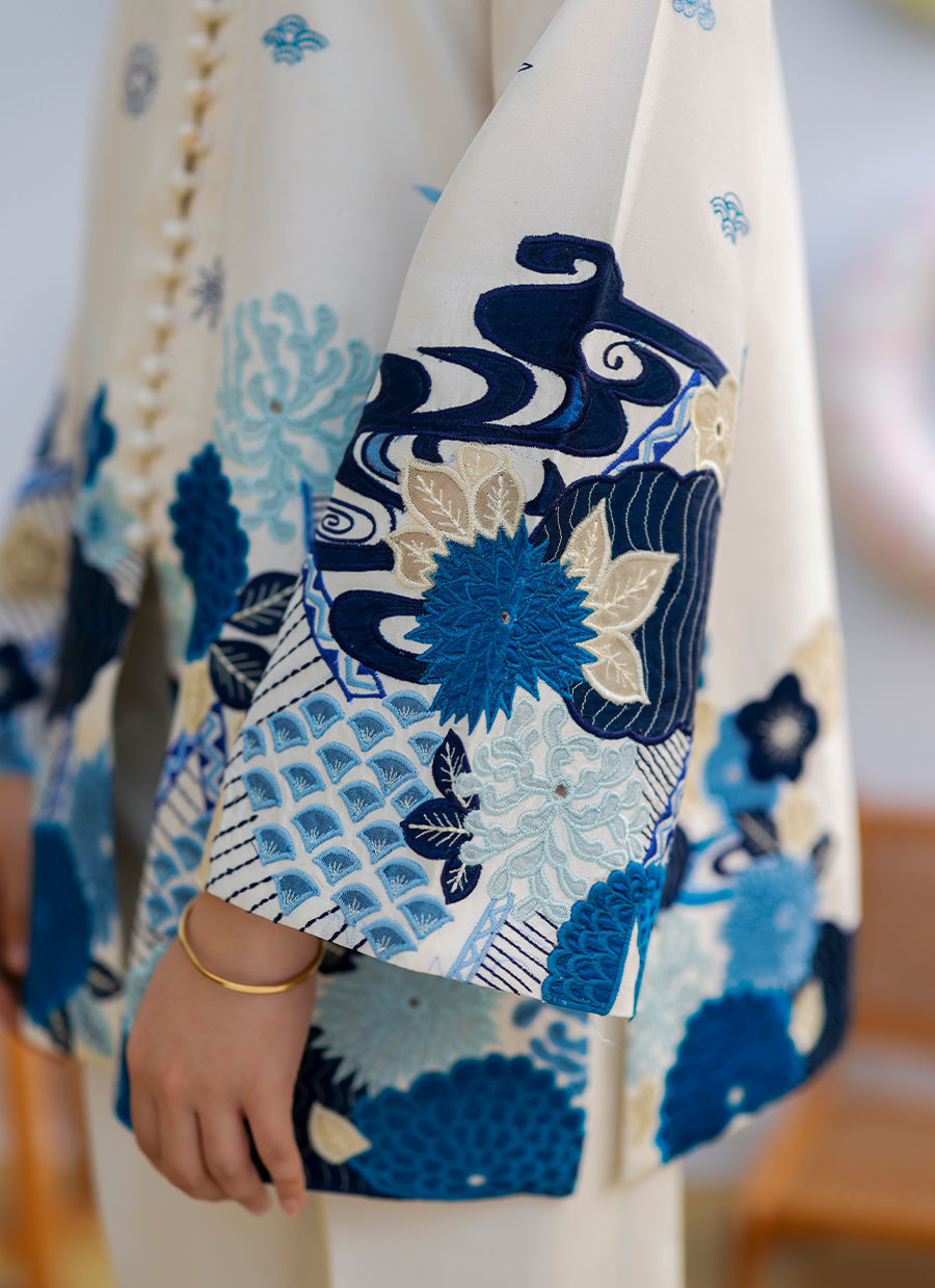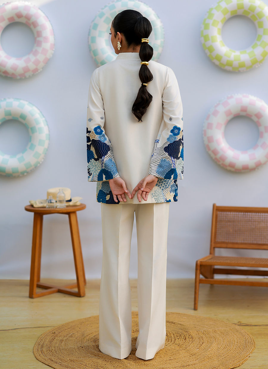 An ivory raw silk collared jacket featuring button detailing, chaak, and bell sleeves, adorned with shades of blue appliqué with subtle hints of cream. The appliqué is crafted in khadi silk and organza, adding depth and texture. Paired with ivory raw silk flared pants, this ensemble blends contemporary tailoring with artisanal elegance.