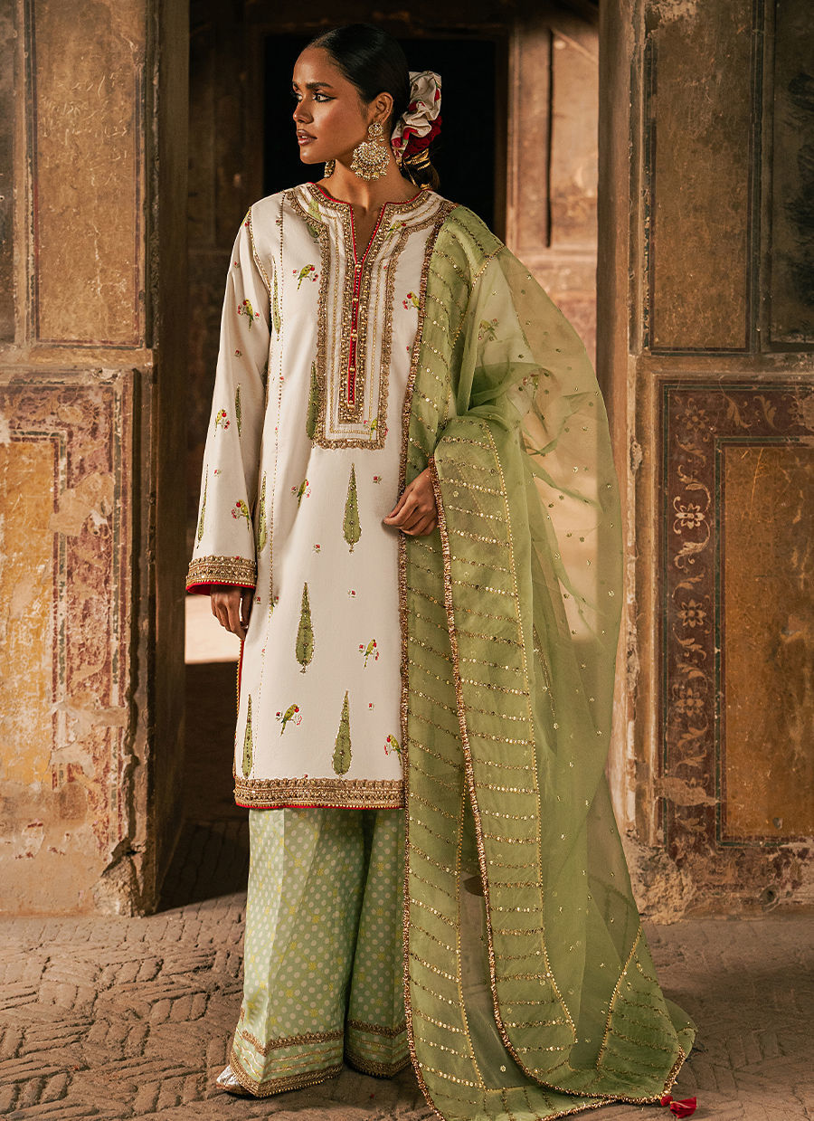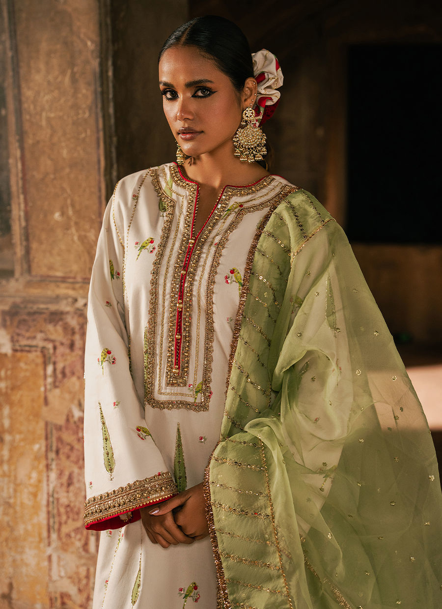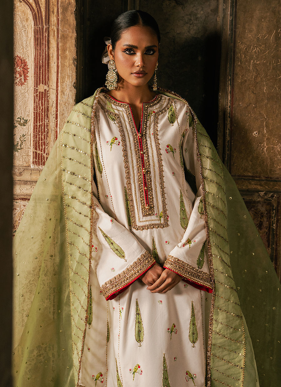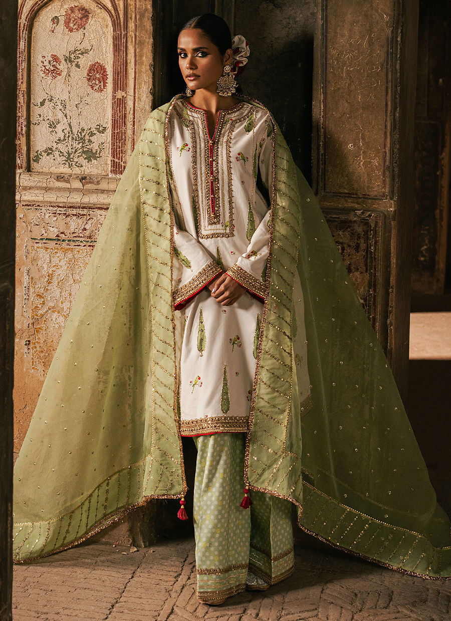 Junoon, An ivory cambric printed shirt, beautifully highlighted with a graceful border and intricate adda work that adds artisanal charm. It is paired with a matching cambric shalwar, detailed with a coordinating border for a balanced and polished look. The ensemble is completed with a single chaan organza dupatta, lending a soft sheen and festive elegance to this timeless creation.
