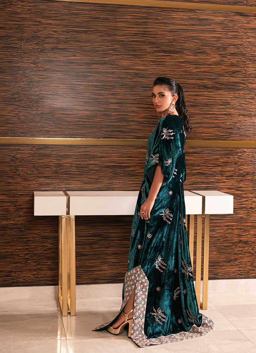This outfit features a flowing kaftan silhouette that drapes elegantly, combining comfort with style along modern embroidery and embellishments that add a touch of sophistication.The intricate designs include charming colors, embroidery and embellishments to enhance design The overall aesthetic is both contemporary and artistic, making it a versatile piece.