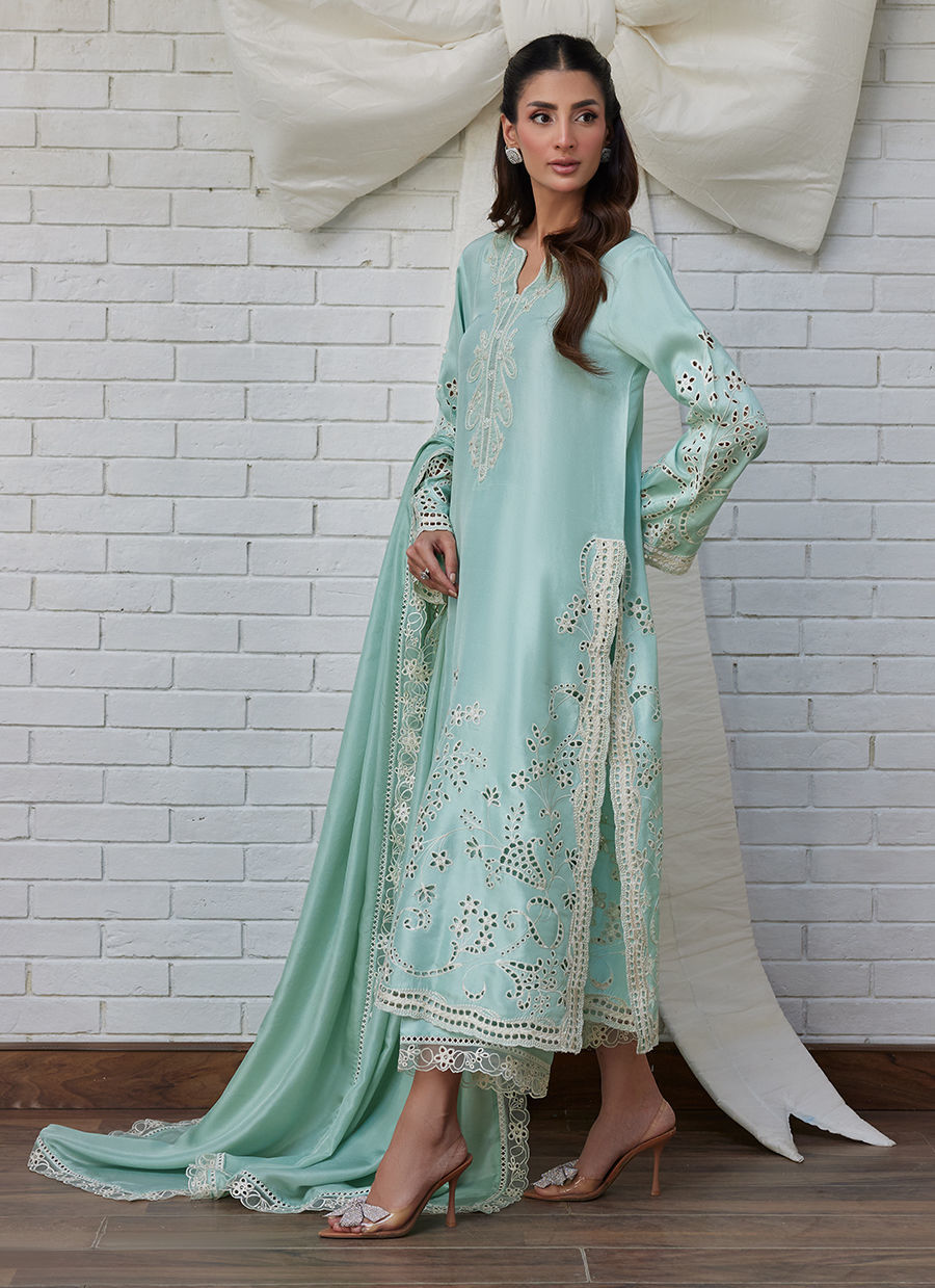 Light, serene, and effortlessly polished — Kalina captures the beauty of soft tones paired with intricate craftsmanship. Rendered in a calming pastel aqua, this look feels refreshing and graceful, perfect for moments that call for subtle elegance.