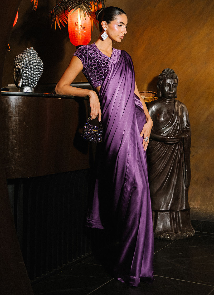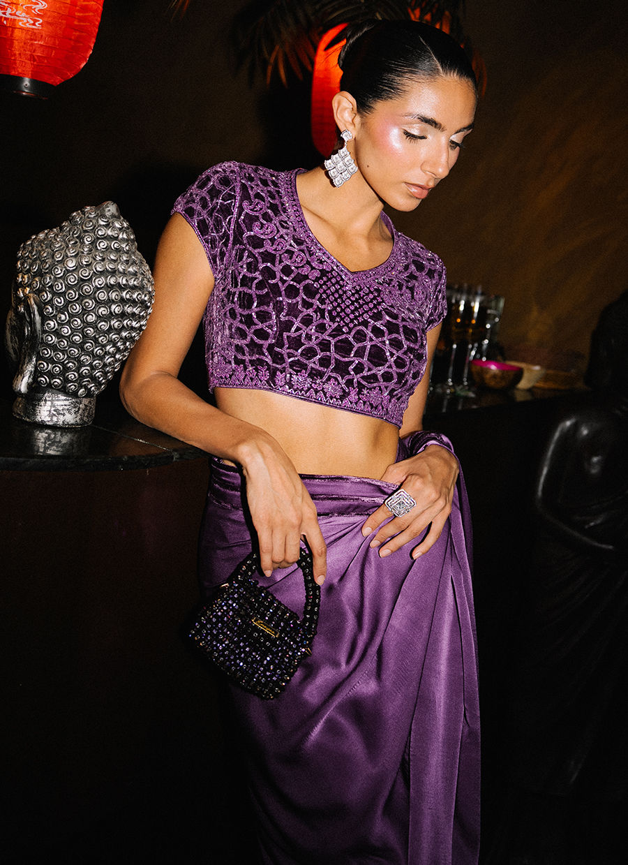A stunning purple Saree featuring a rich velvet blouse adorned with intricate purple beaded handwork throughout, adding depth and luxurious texture. The look is completed with a flowing chamois silk saree detailed with a velvet-edged border, creating a seamless harmony of elegance and opulence—perfect for timeless, sophisticated style.