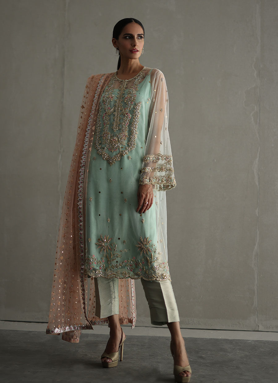 This ensemble features a net shirt and dupatta with zari woven trousers. Delicate threads of gold, silver and vibrant hues are skillfully interwoven to create a breathtaking tapestry of design. Hand embroidered in delicate zardozi, resham, crystal and sequin.
