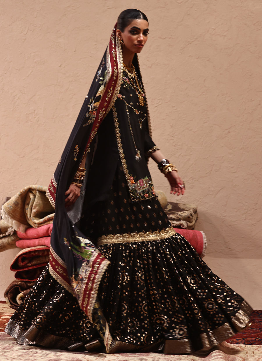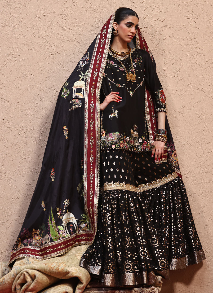 A Mughal-inspired digital motif enriched with colored resham, zari, and zardozi embroidery.The shirt is adorned with pearls, stones, sequins, cutdana, dabka, nakshi, and handmade tassels across the front, sleeves, and back.Paired with two unique lorix designs featuring banarsi borders and elegant dupattas with gold embroidered bails, resham boties, and allover zardozi motifs.A Mughal digital print shawl finished with zari and zardozi detailing completes the look.