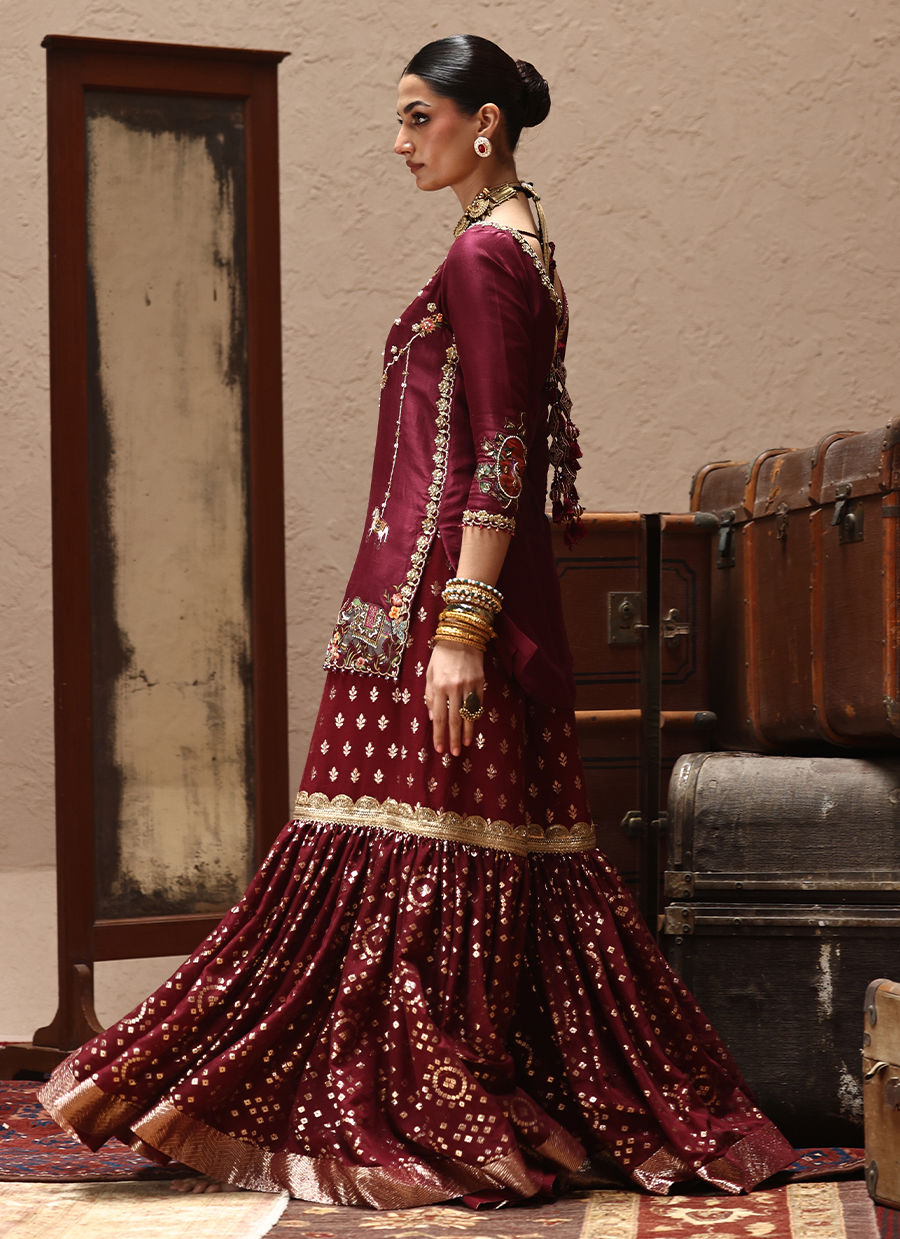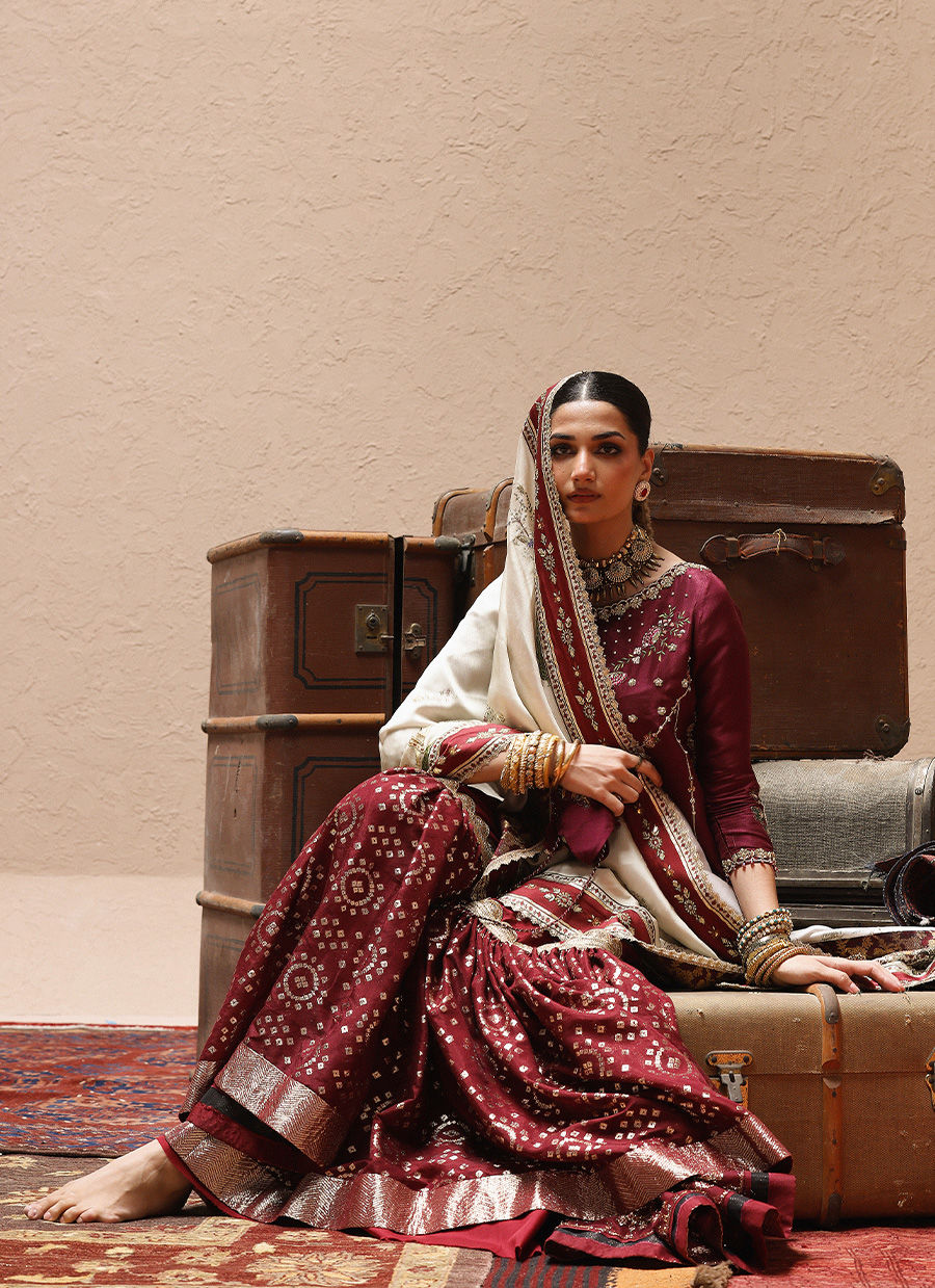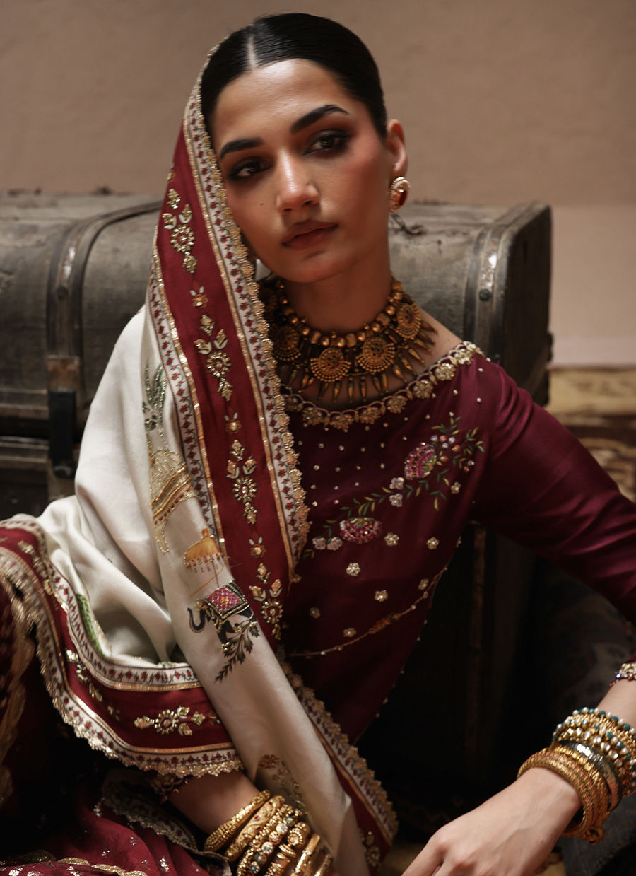 This ensemble blends Mughal digital artistry with resham, zari, and intricate zardozi craftsmanship.Front, sleeves, and back are enriched with pearls, sequins, dabka, cutdana, stones, and handmade tassels.Complemented by lorix pants in two unique banarsi-bordered designs and dupattas featuring gold embroidery, resham boties, and zardozi details.A Mughal-inspired digital print shawl with zari and zardozi completes the ensemble.