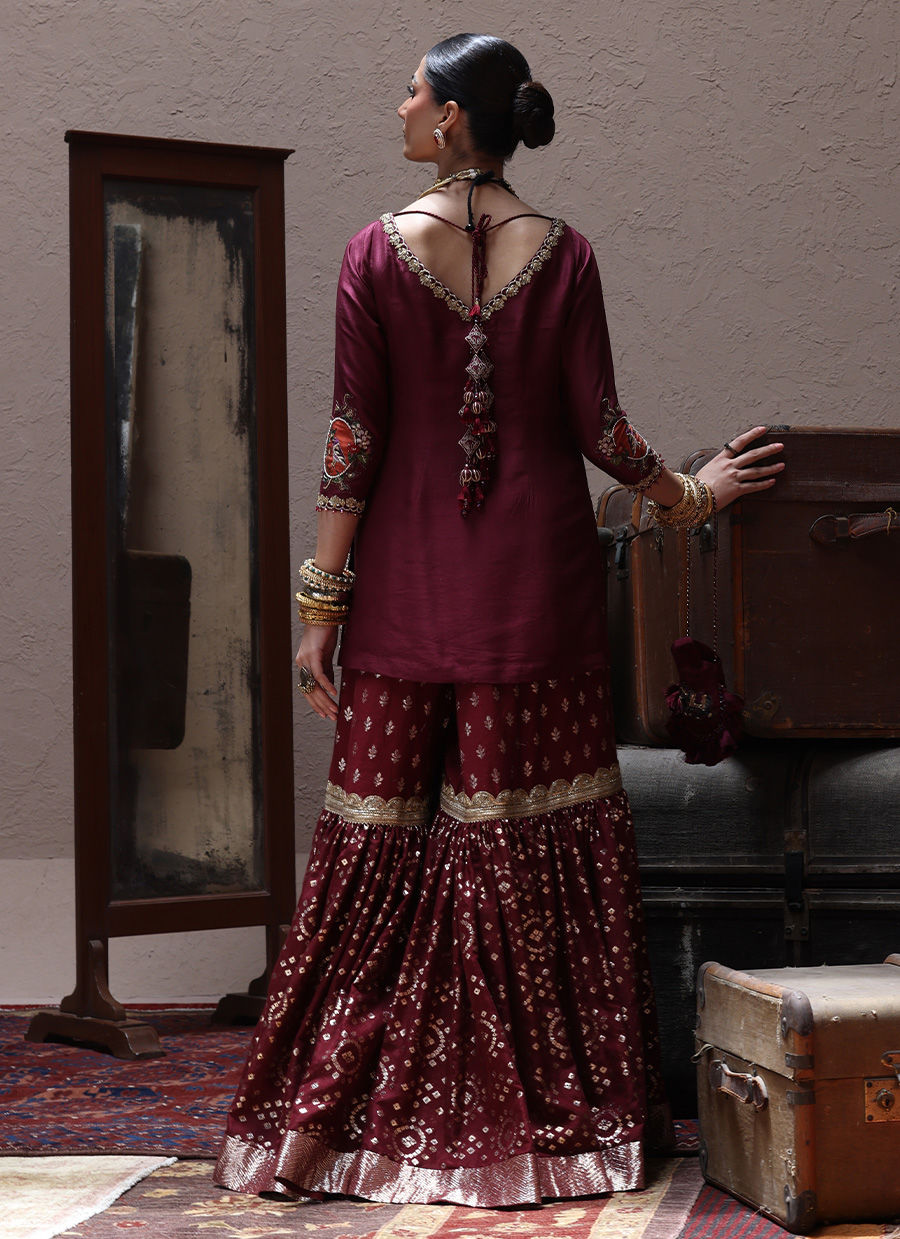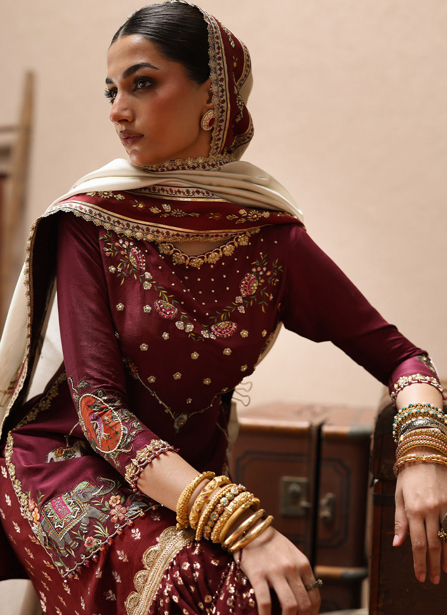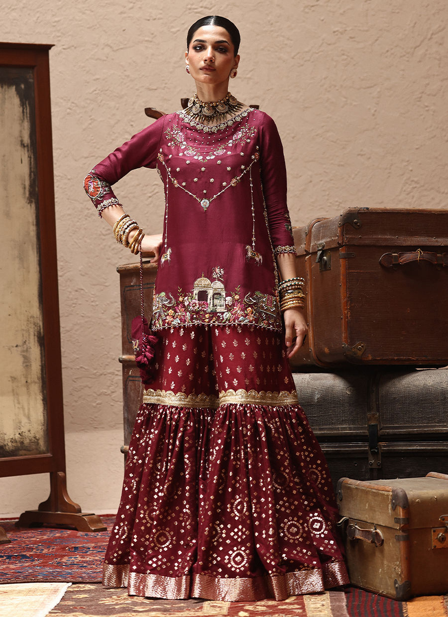 This ensemble blends Mughal digital artistry with resham, zari, and intricate zardozi craftsmanship.Front, sleeves, and back are enriched with pearls, sequins, dabka, cutdana, stones, and handmade tassels.Complemented by lorix pants in two unique banarsi-bordered designs and dupattas featuring gold embroidery, resham boties, and zardozi details.A Mughal-inspired digital print shawl with zari and zardozi completes the ensemble.