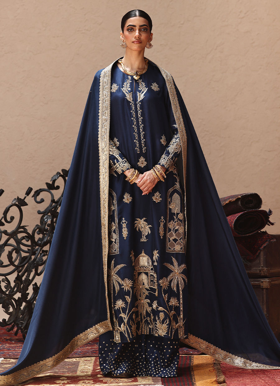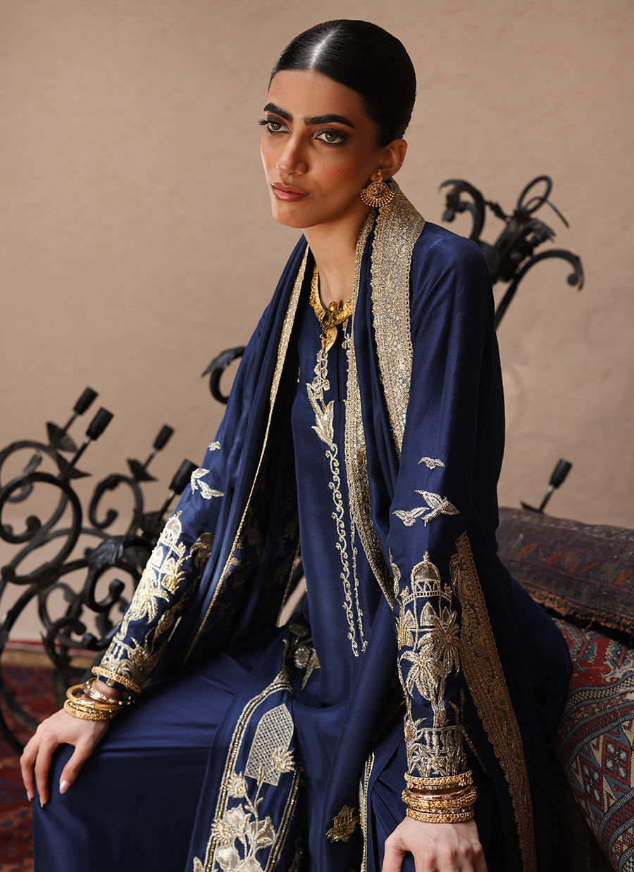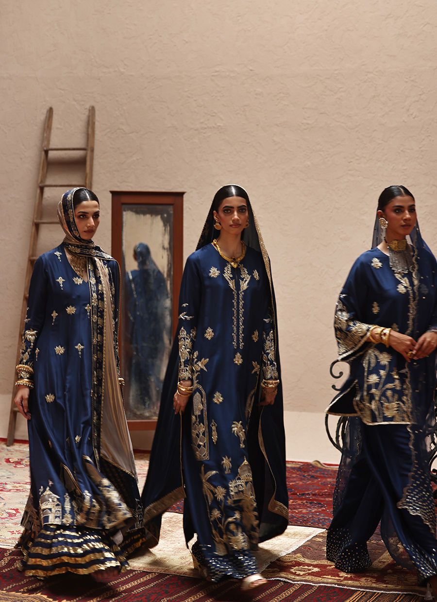 An elegant ensemble featuring antique lame with light and dark gold zari embroidery.Front and sleeves are adorned with zardozi, pearls, dabka, cut dana, stones, sequins, nakshi, and delicate silver bird motifs.Culottes styled with shimmering sequins at the bottom and dupattas finished in zari embroidery, scalloped borders, and gold edging.A timeless design combining rich craftsmanship with regal detailing.