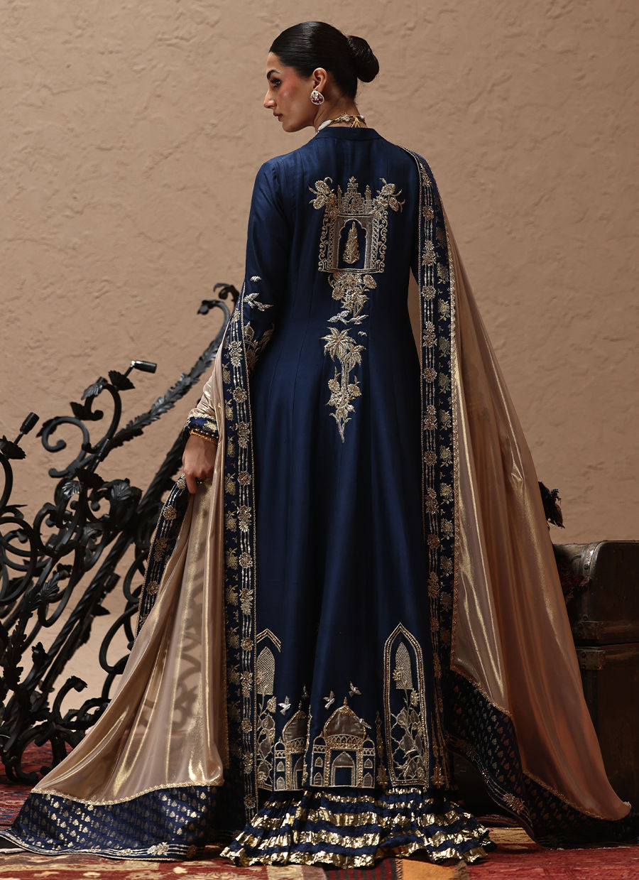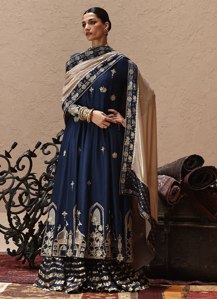 An opulent creation in antique lame with light and dark gold zari embroidery.Front, sleeves, and back are richly decorated with zardozi, pearls, dabka, cut dana, stones, sequins, nakshi, and silver bird motifs.Dupattas feature exquisite finishes with four-sided gold borders, scalloped edges embroidered with zari and sequins, and handwork borders with banarsi trims.