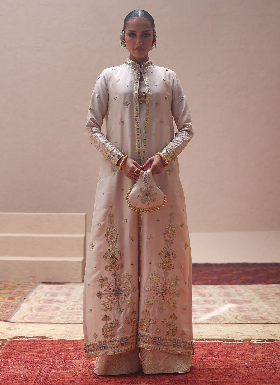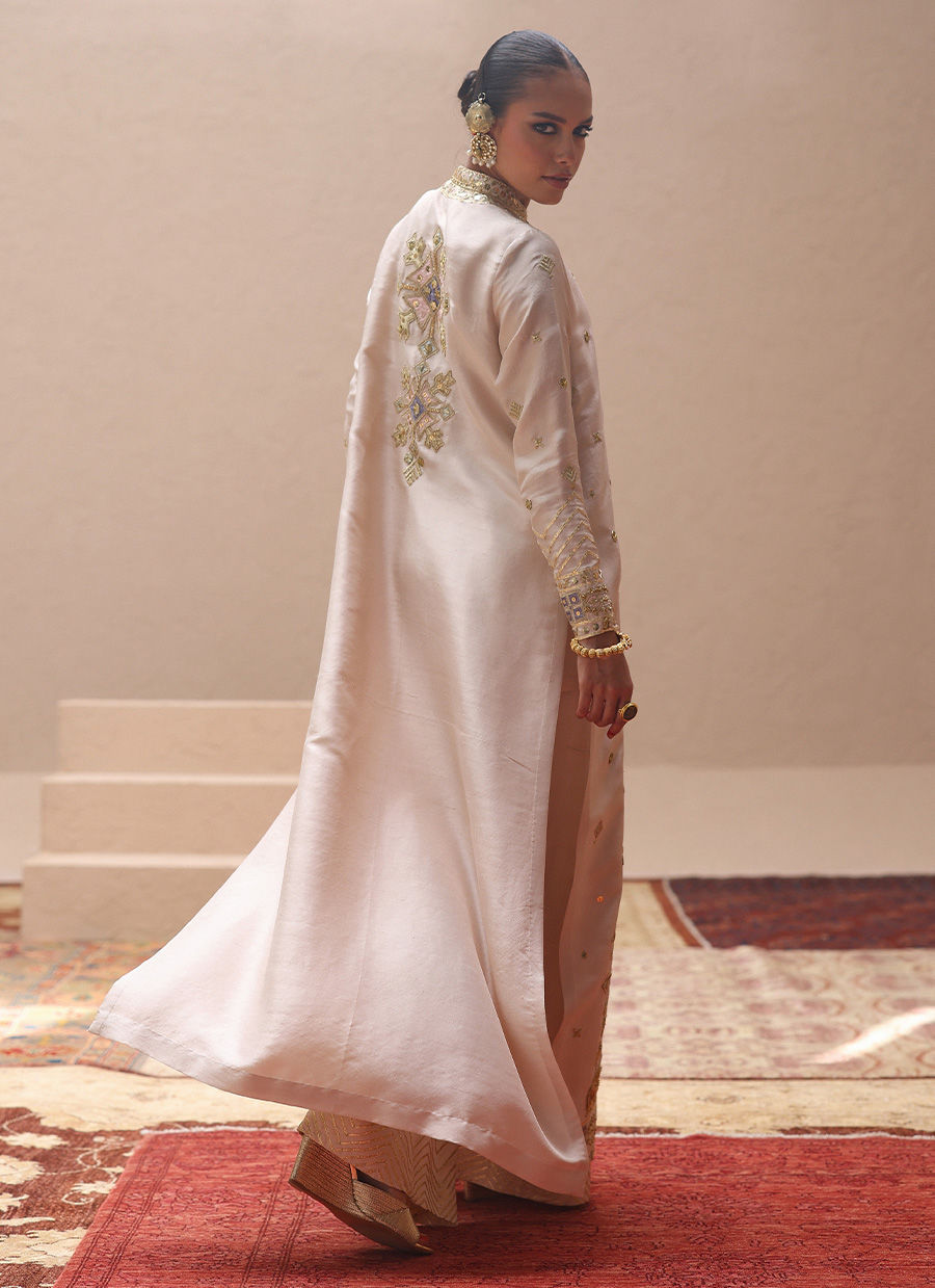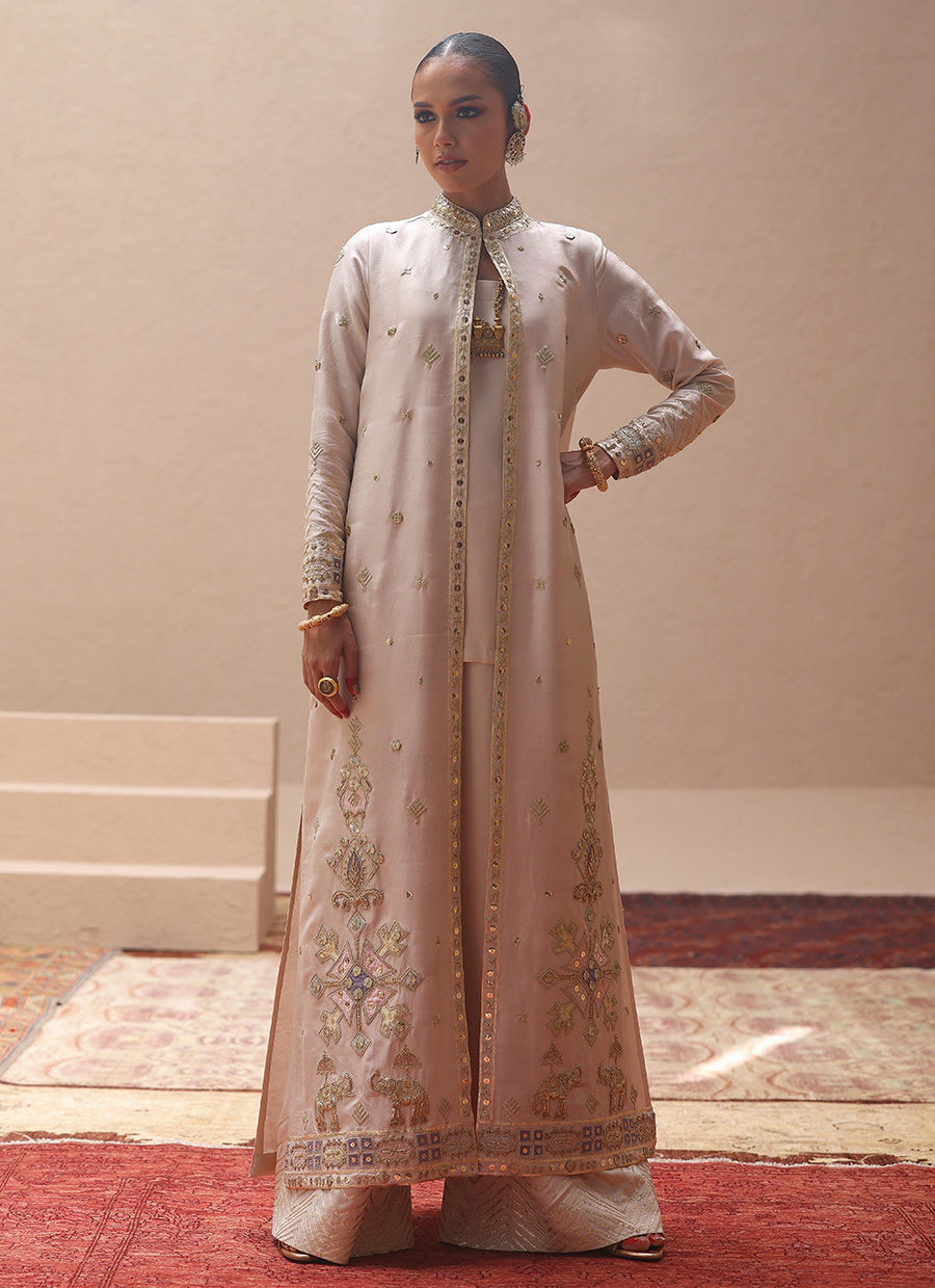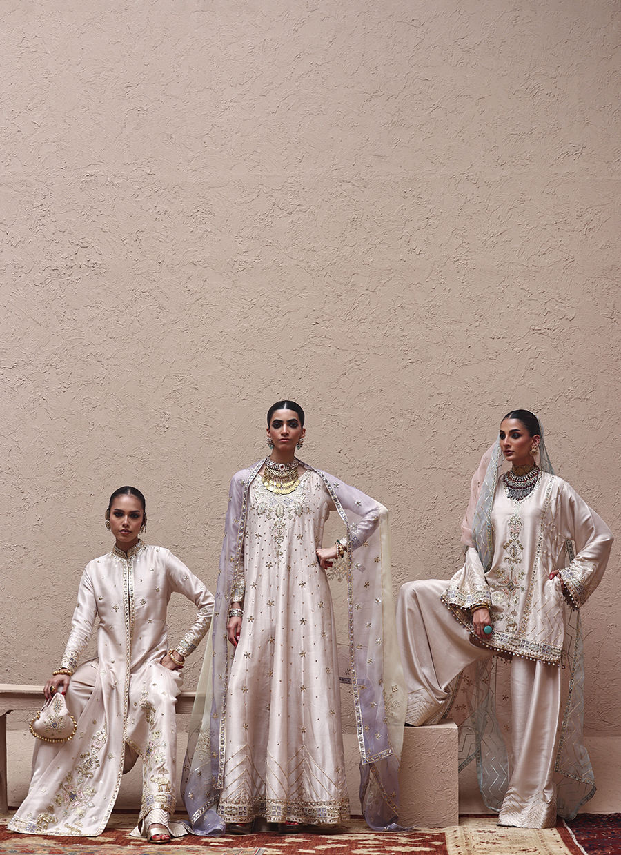 A timeless creation featuring gold gota embroidery, zari detailing, and colorful appliqué.Zardozi artistry enriched with pearls, stones, cut dana, sequins, dabka, and nakshi adorns the front and sleeves.A rich gota border adds elegance to the overall design.
