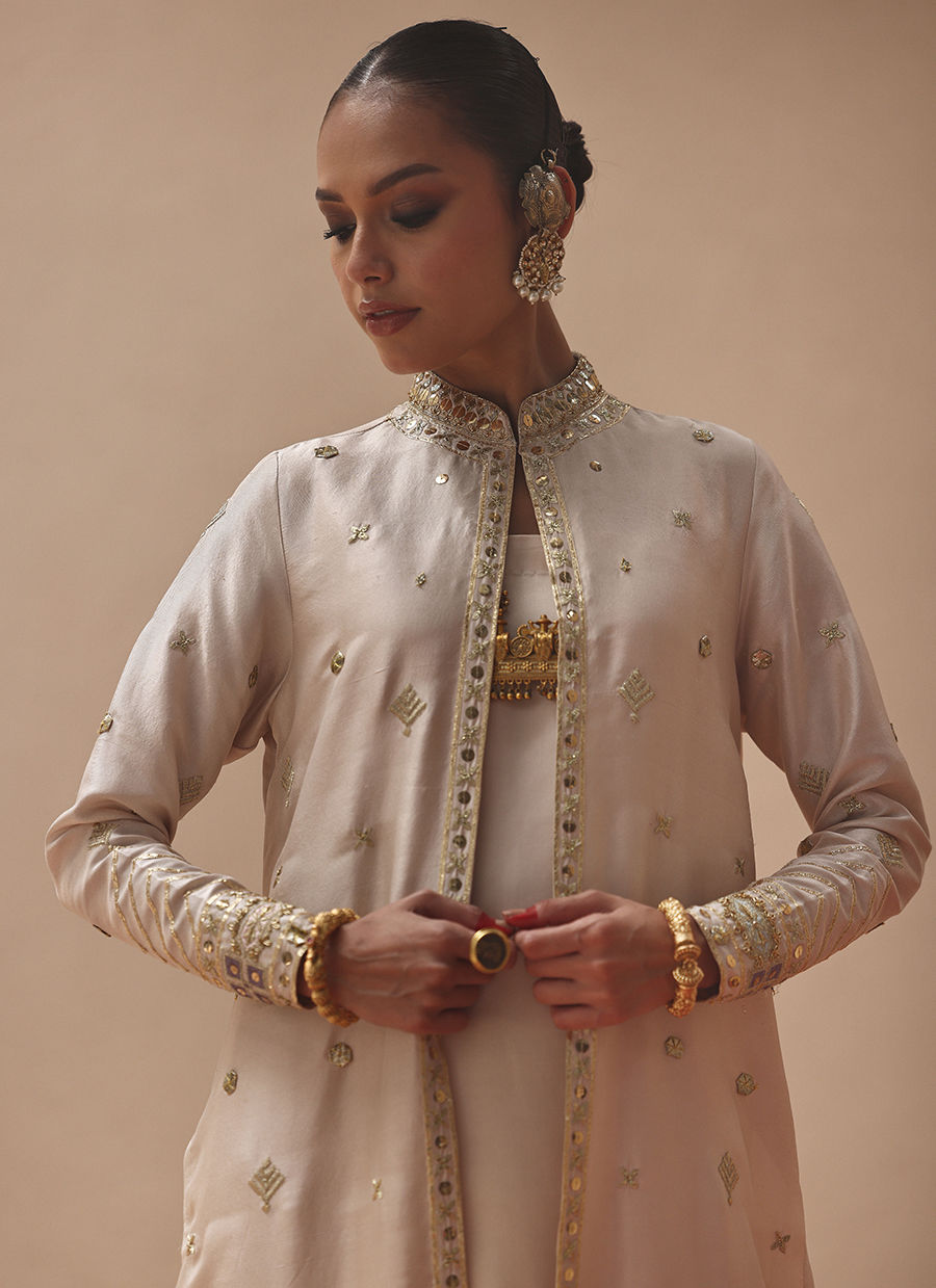 Color: Seed Peals Fabric: Pure Raw Silk Work Details: Embellished And Embroidered