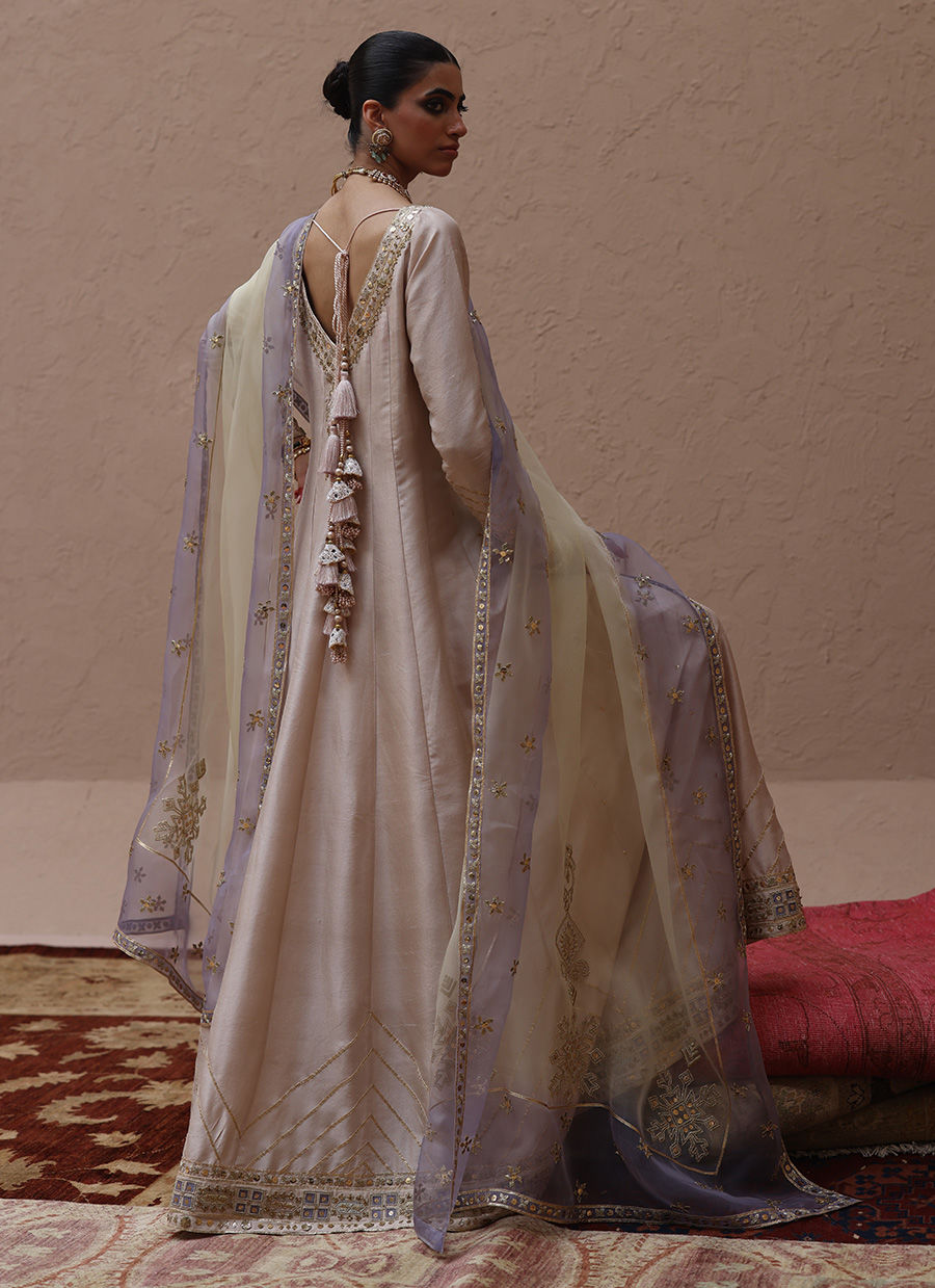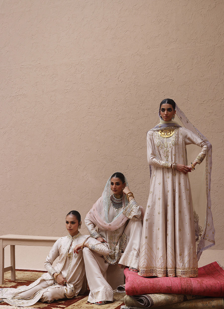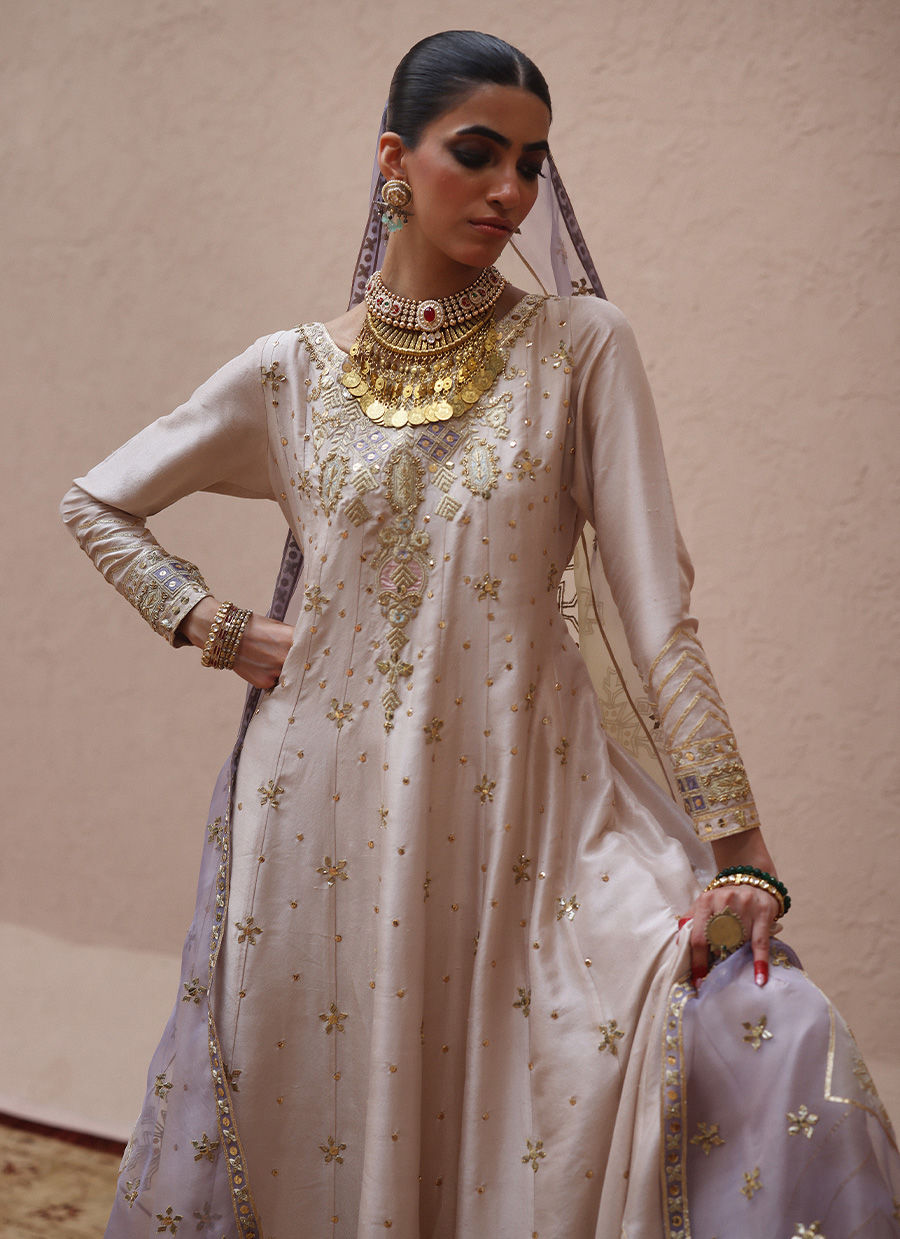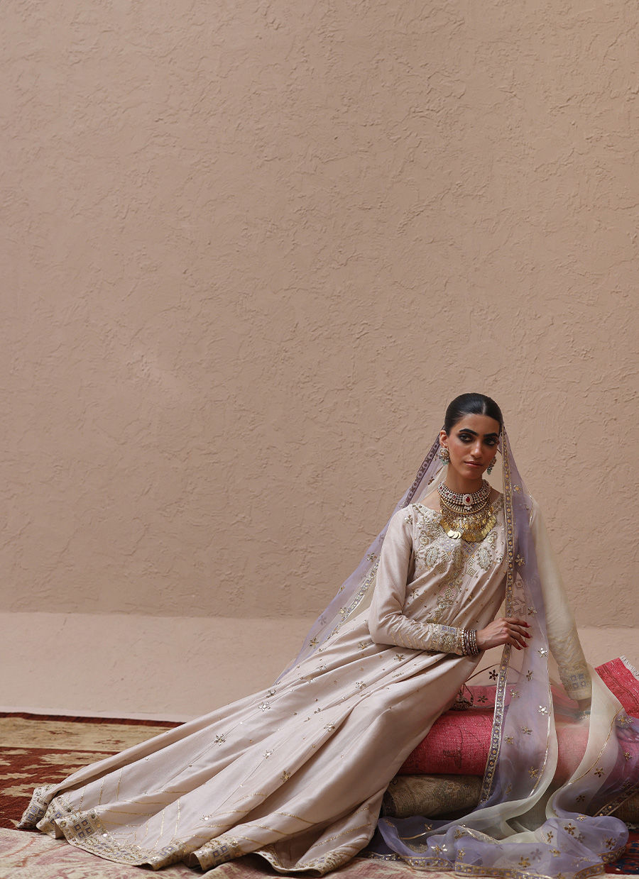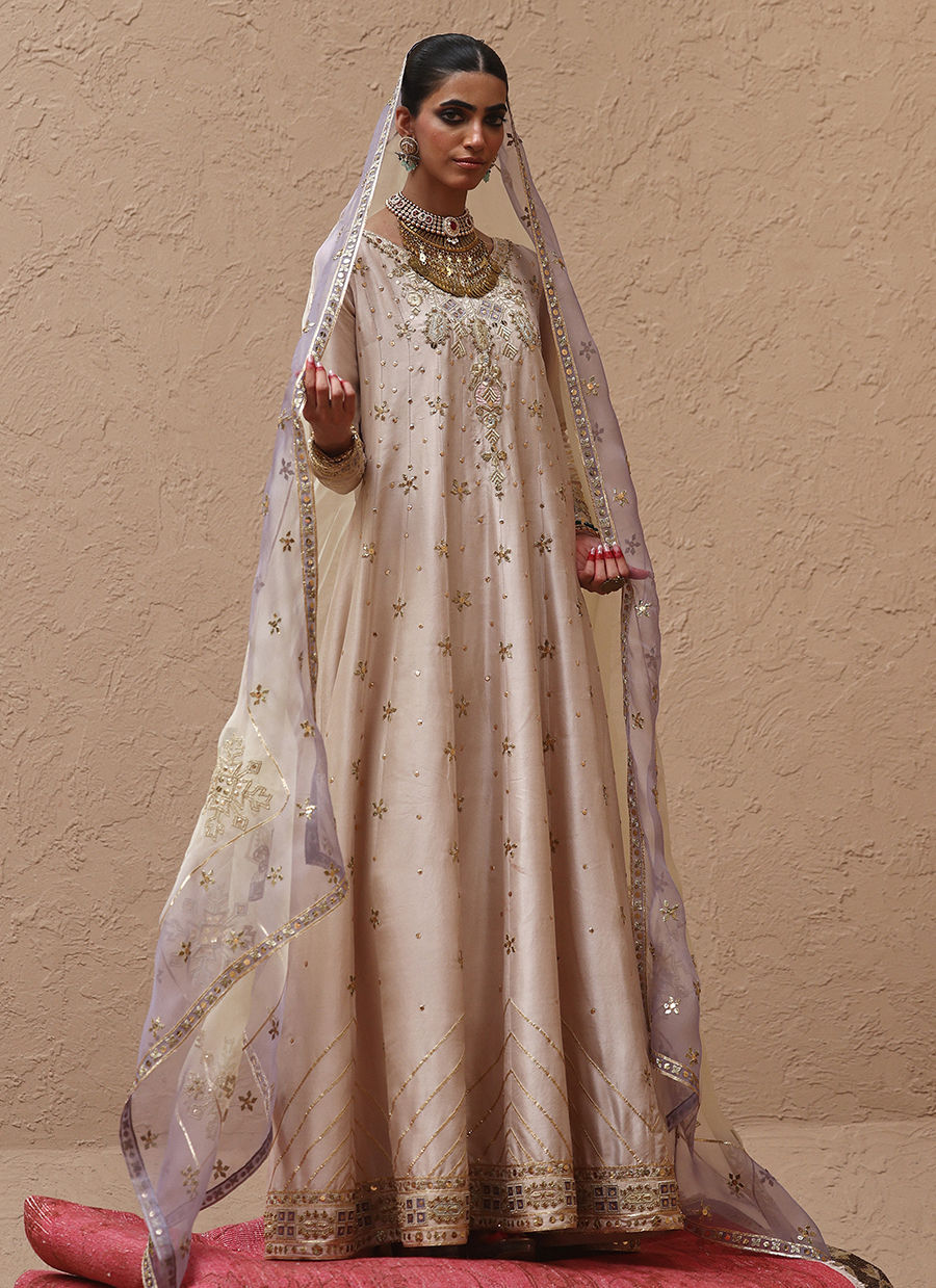 This luxurious design blends gold gota, zari embroidery, and appliqué artistry with fine zardozi craftsmanship.Front, sleeves, and back shimmer with pearls, cut dana, dabka, sequins, stones, nakshi, and handmade tassels.The dupatta is adorned with rich borders on all four sides and all-over embroidery of gota, zari, and sequins.