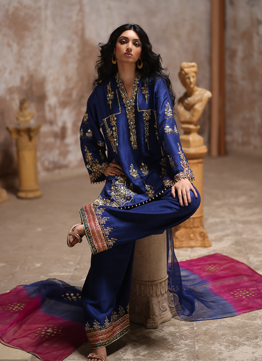 A true blue short kurta in pure raw silk (80 gms), featuring intricate zari embroidery with hand worked antique gold gota, dabka, sequins, pearls, and colorful appliqué. The matching shalwar has detailed handwork on the bottom, and the pure organza dupatta is finished with lace and gota bunches. Perfectly blending tradition with a modern edge.