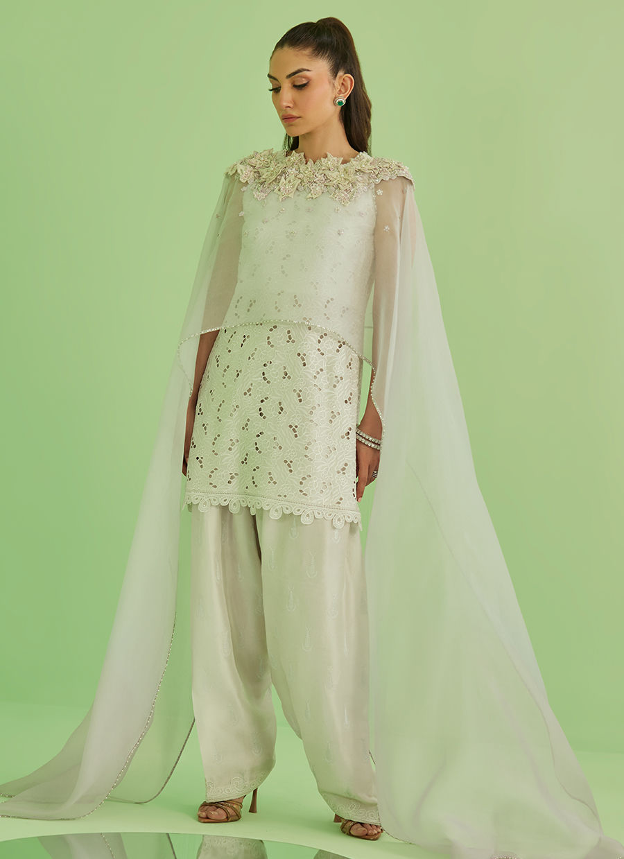 This refined ensemble features a structured shirt paired with a fluid shalwar and a dramatic sheer cape-style dupatta, creating a silhouette that is both graceful and striking. The shirt is intricately adorned with tonal embroidery, complemented by a beautifully detailed neckline featuring 3D floral appliqué work, adding depth and couture charm.