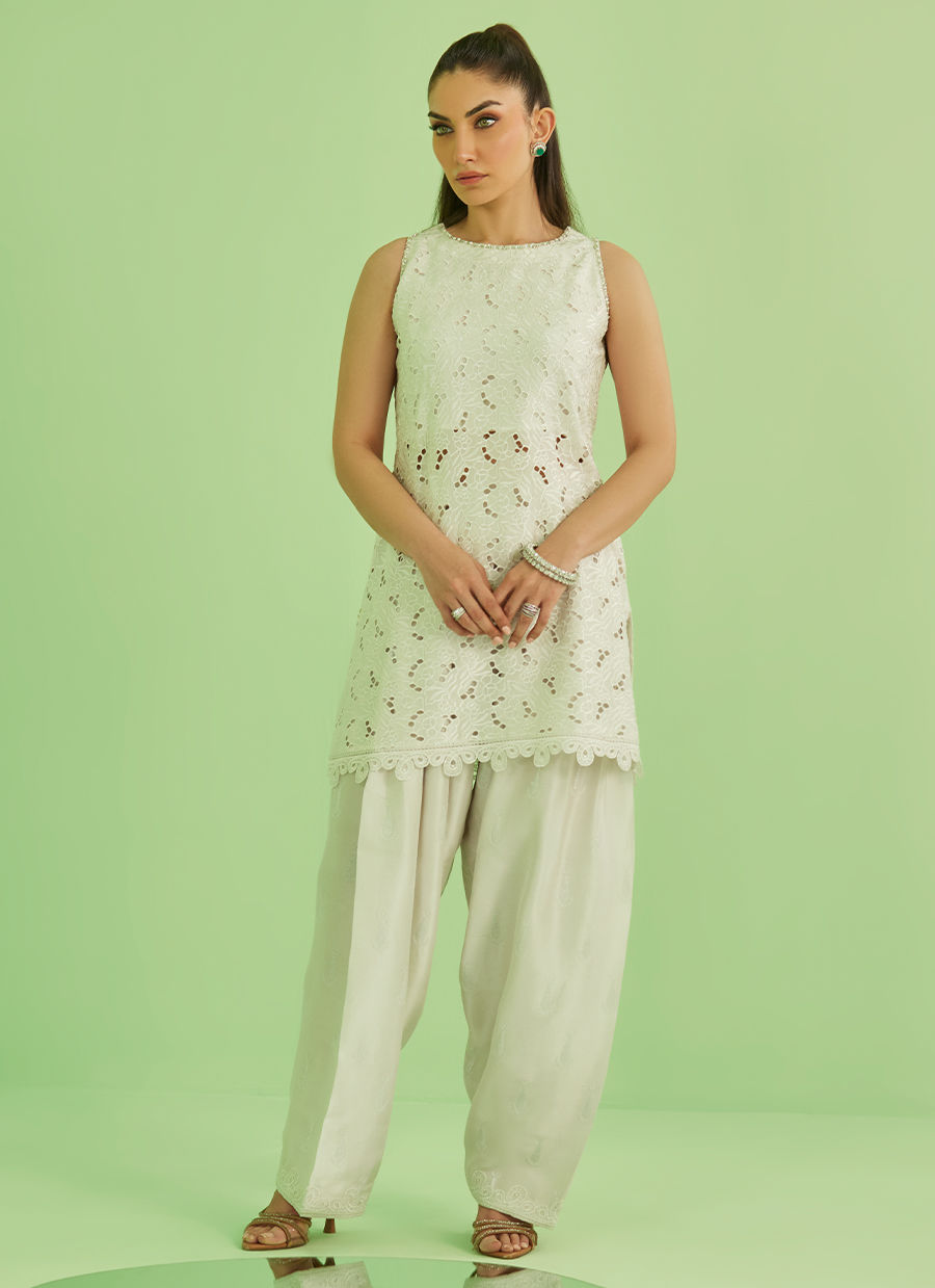 The look is elevated with a flowing sheer dupatta that cascades like a cape, bringing movement and a sense of effortless drama. Paired with a softly tailored shalwar, the ensemble balances structure with fluidity.