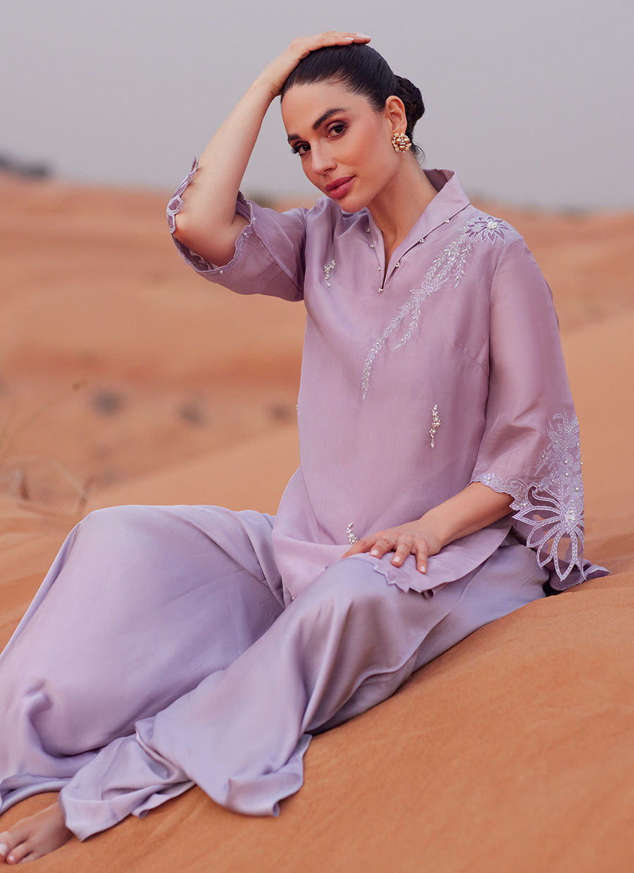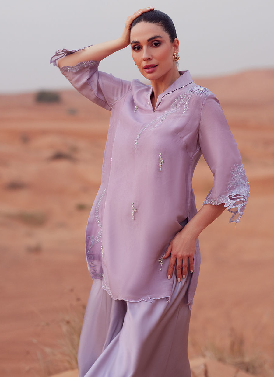 A short shirt crafted in tassel silk, featuring delicate embroidery and hand embellishments throughout in a soft lavender hue. Paired with cotton silk Bambi pants for a relaxed yet refined silhouette. Completed with a gradient-dyed scarf, adding fluid movement and tonal depth to the ensemble.