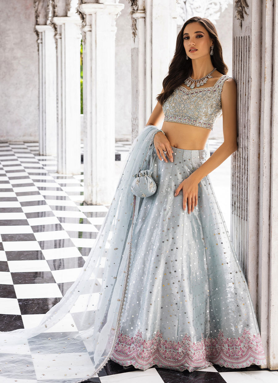 Explore this delightful ensemble featuring a choli and sharara, beautifully adorned with a harmonious blend of ice blue hues. The opulent allure of tilla, sequin, and zardozi detailing adds a touch of romance. Set against moto tone dupatta, this outfit creates a subtle and nuanced charm.