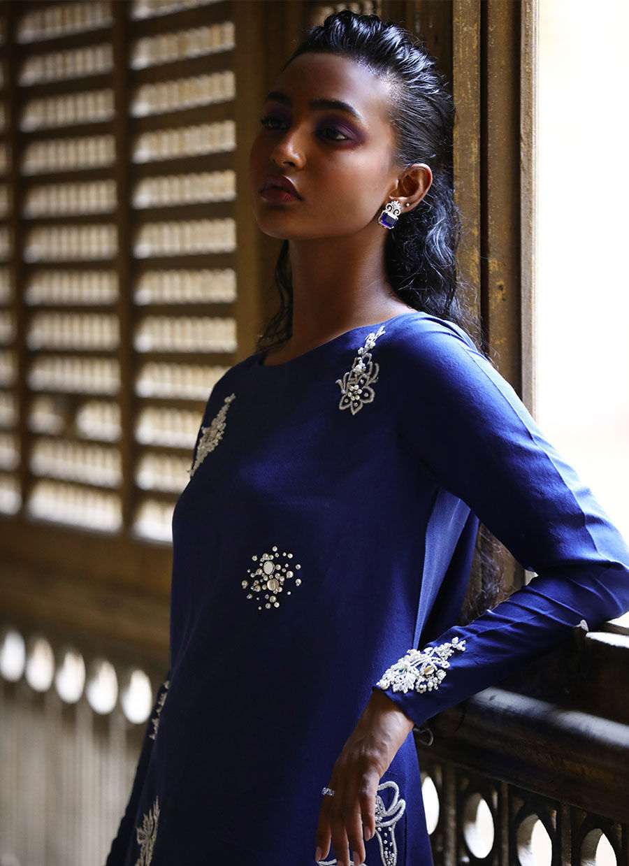 Introducing stunning Kaftan and Dupatta set, designed to elevate your style and add a touch of luxury to your wardrobe. The Kaftan is made from pure raw silk, and comes in a beautiful true blue shade that is perfect for any occasion. The intricate work of resham beads, mirrors, sequence, and pearls make it a true work of art.