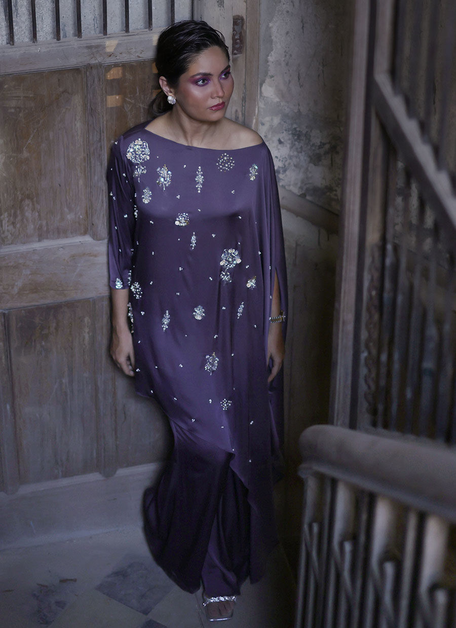 The set is made from sweet touch silk. The ash violet shade adds a subtle and classy touch to the outfit. The intricate detailing on the shirt is a work of art, featuring beads, crystals, sequence, stones, and pearls, which add a touch of sparkle and glamour to the overall look. The set comes with bell-bottom pants, adding a trendy and stylish element to the outfit.