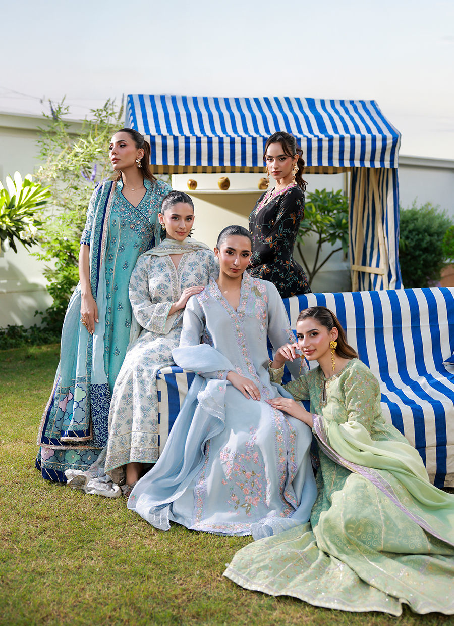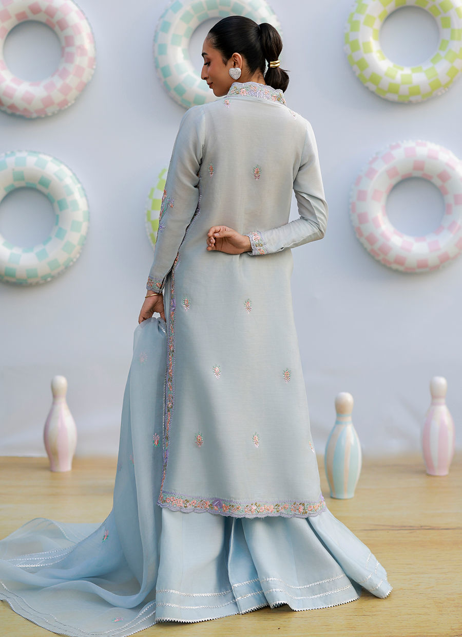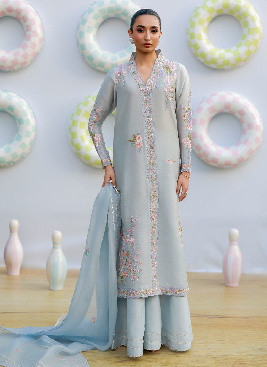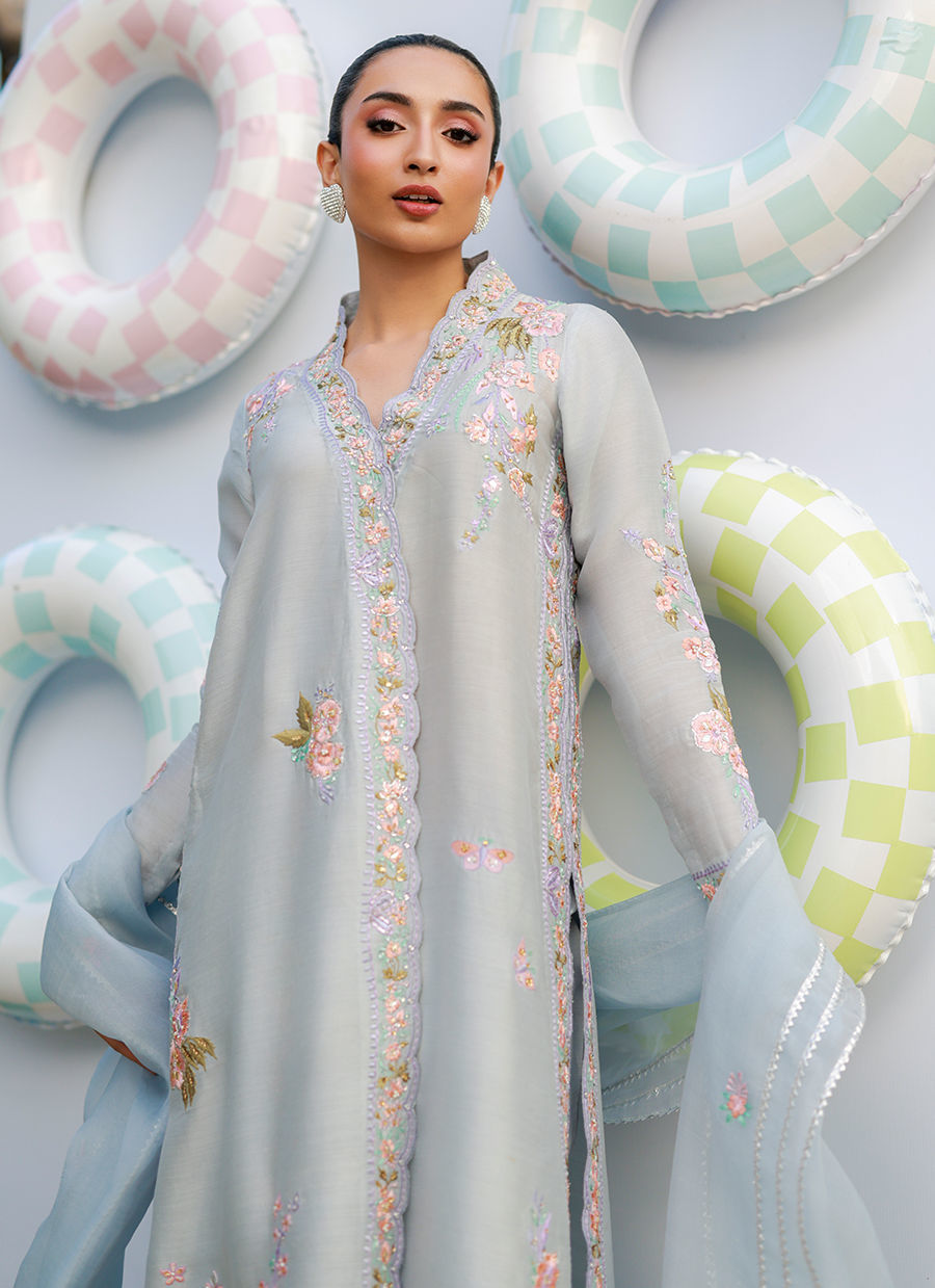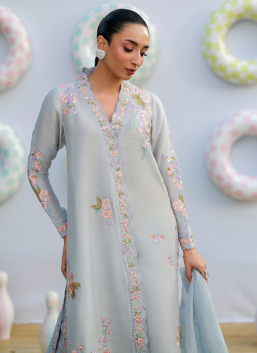 A periwinkle khaddi silk shirt with fitted sleeves and a scalloped neckline, adorned with floral embroidery in coral, lilac, and sage. Paired with dhaka pants featuring lace detailing, and completed with an organza dupatta with floral motifs and lace for a graceful, refined look.