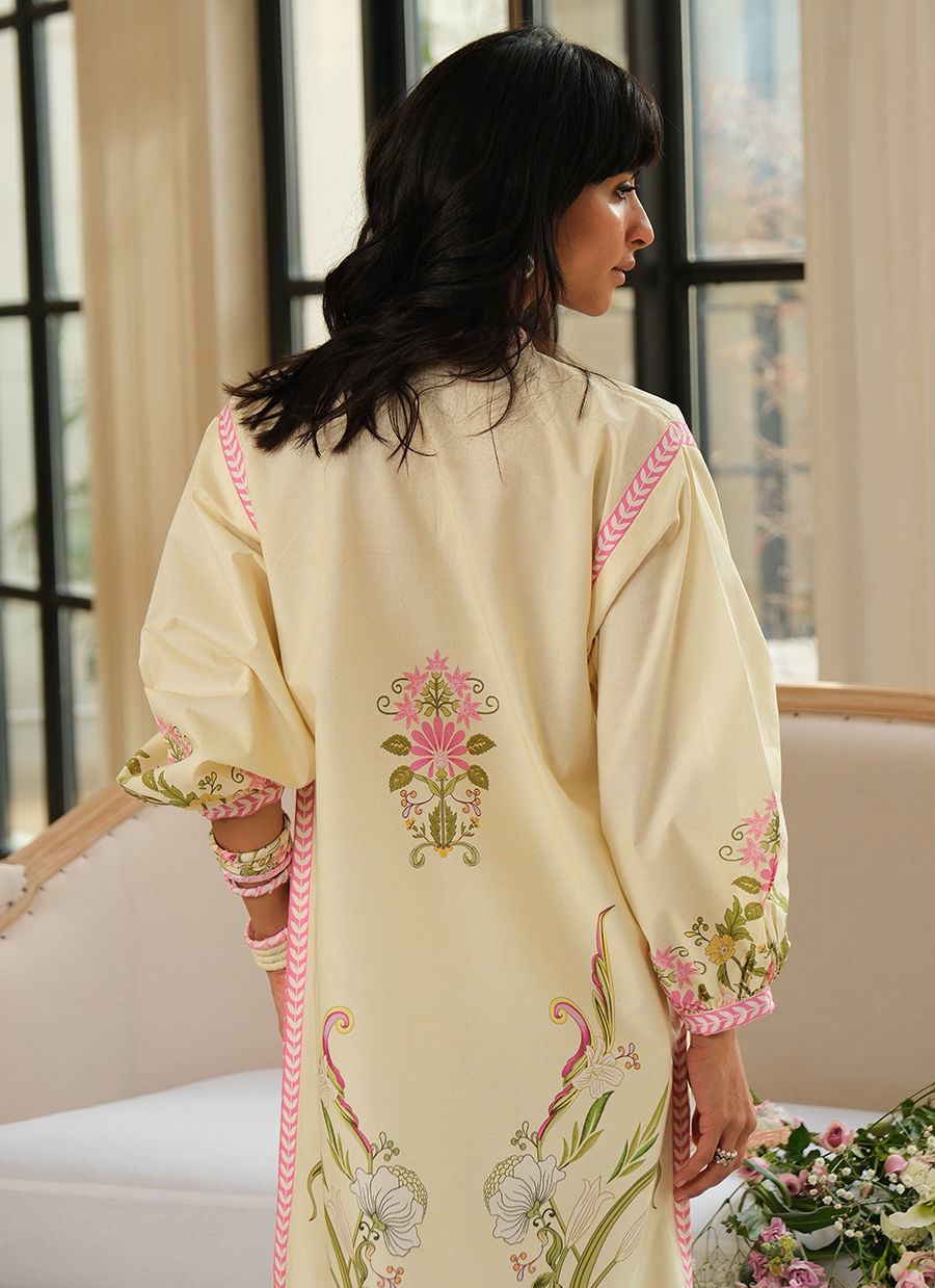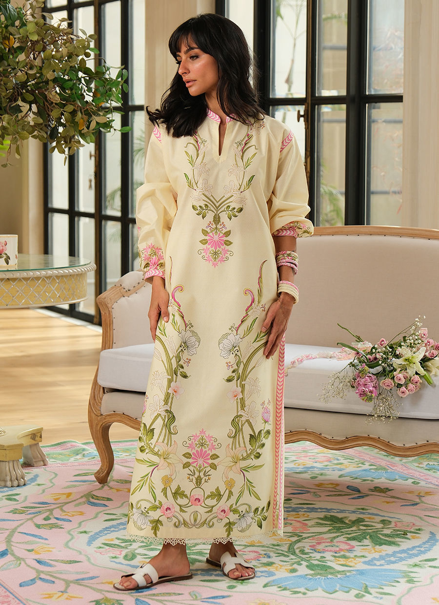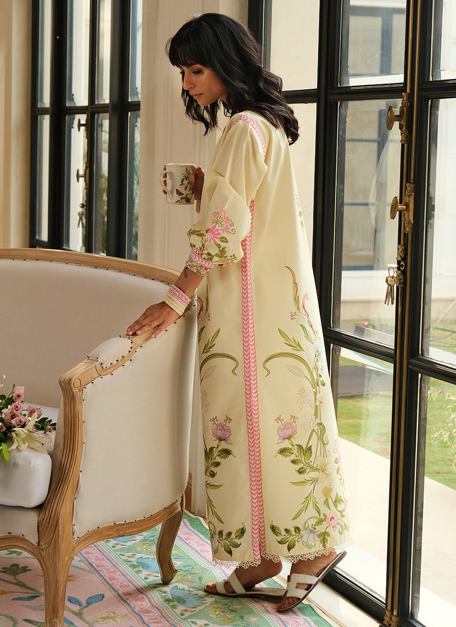 “Cool yet feminine, this pure cotton printed ensemble features a soft lemon base enhanced with delicate floral motifs and vibrant pink accents. Designed for comfort and ease, the relaxed silhouette and refined detailing make the Lemon Bloom Set perfect for effortless Ramadan days and breezy spring moments.”