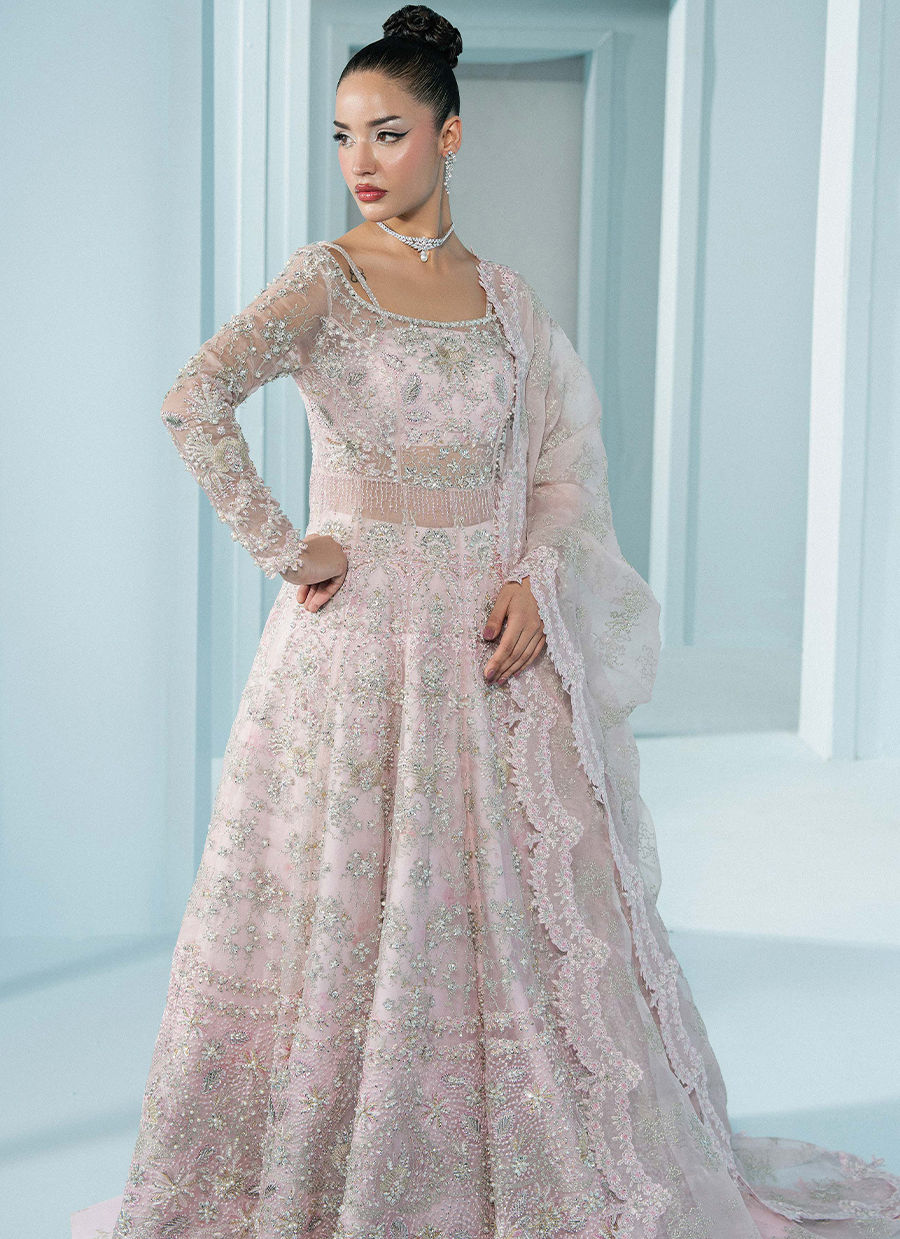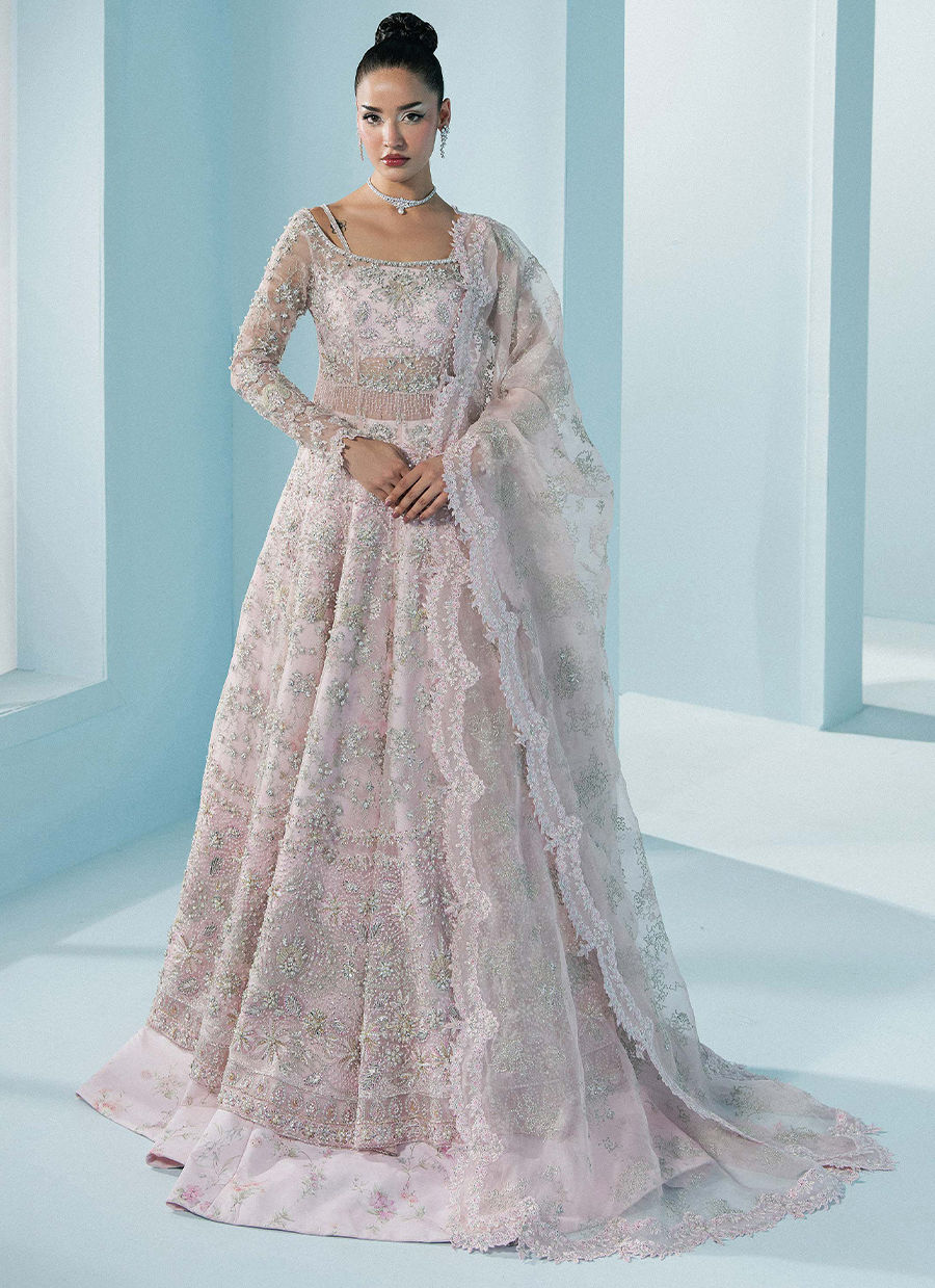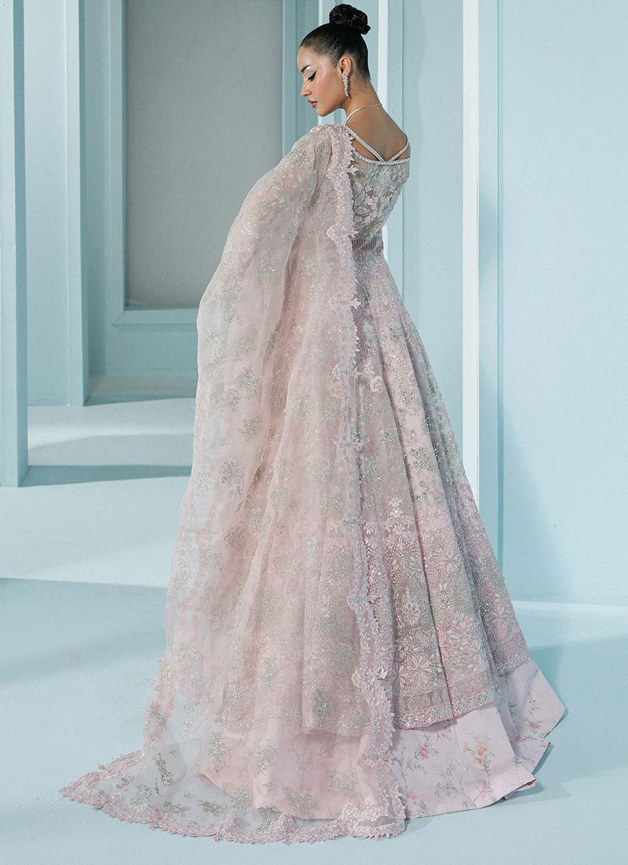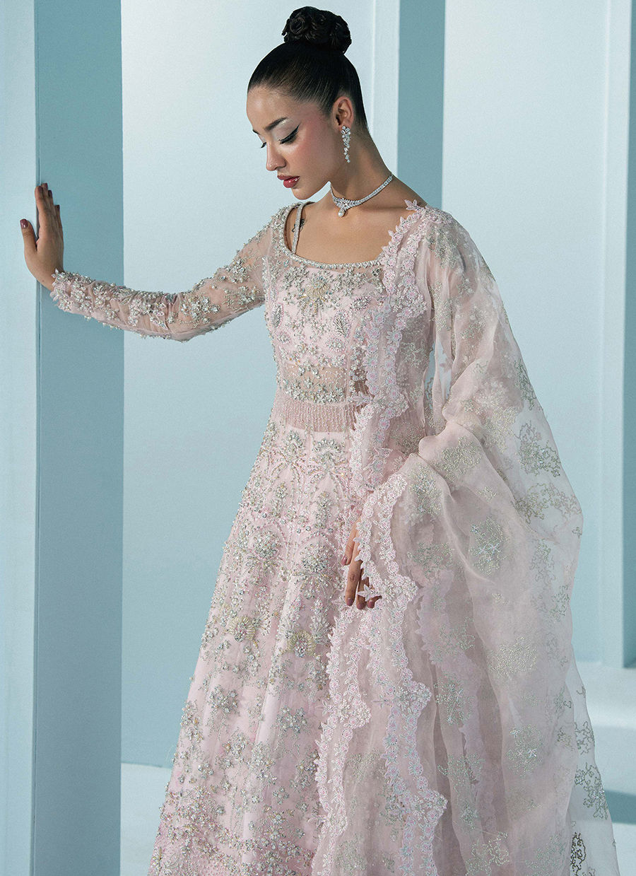 A vision of delicacy in soft powder pink, this 16-panel pishwas design with full sleeves is lavishly adorned with intricate tilla and shimmering sequins, radiating ethereal charm. Paired with printed Raw silk lehenga pants that enhance its flowing silhouette, the look is perfected with an Oganza dupatta edged with a scalloped border, embodying timeless elegance and grace for cherished festive occasions.