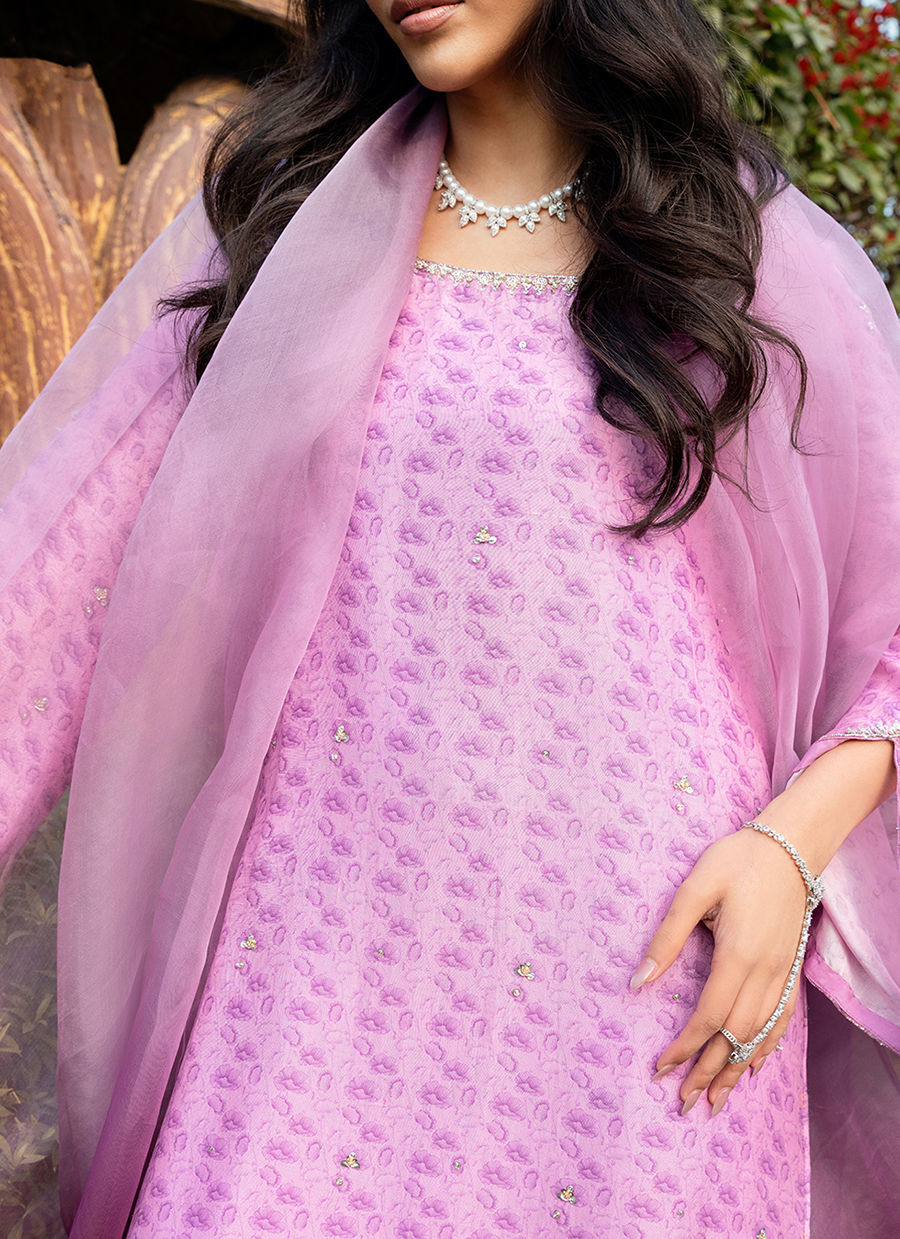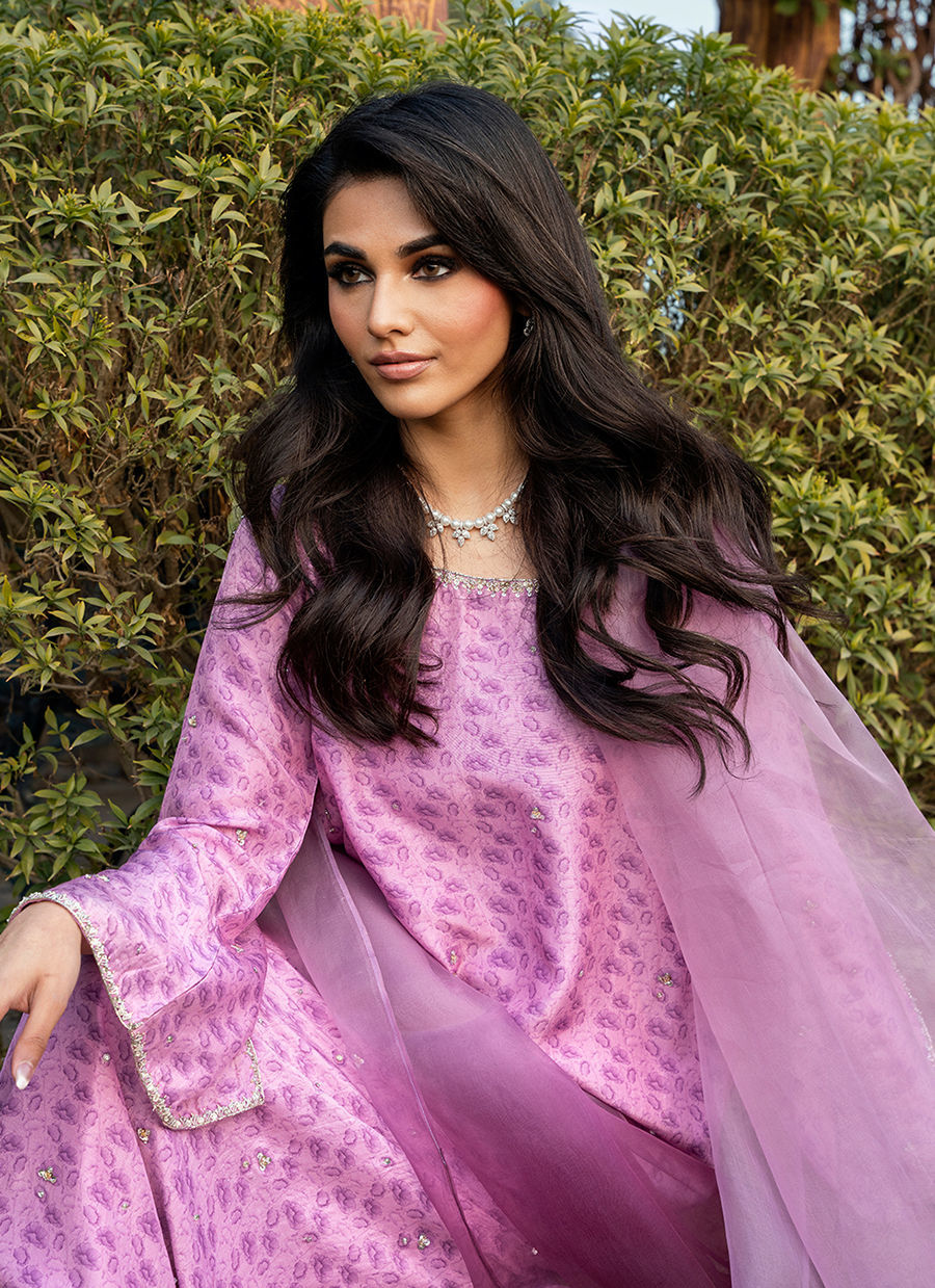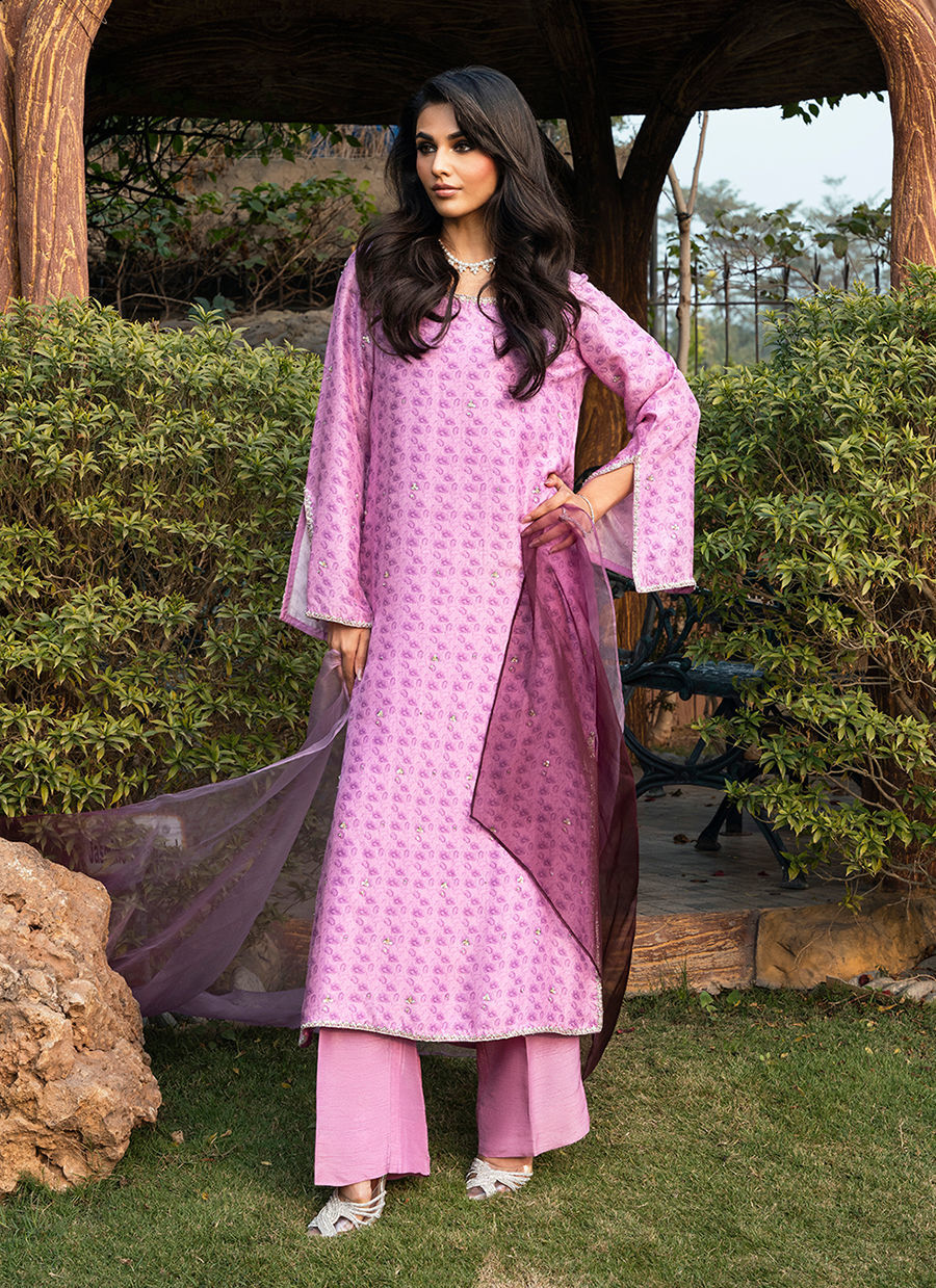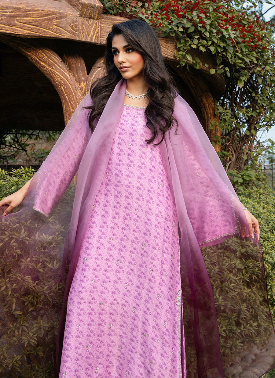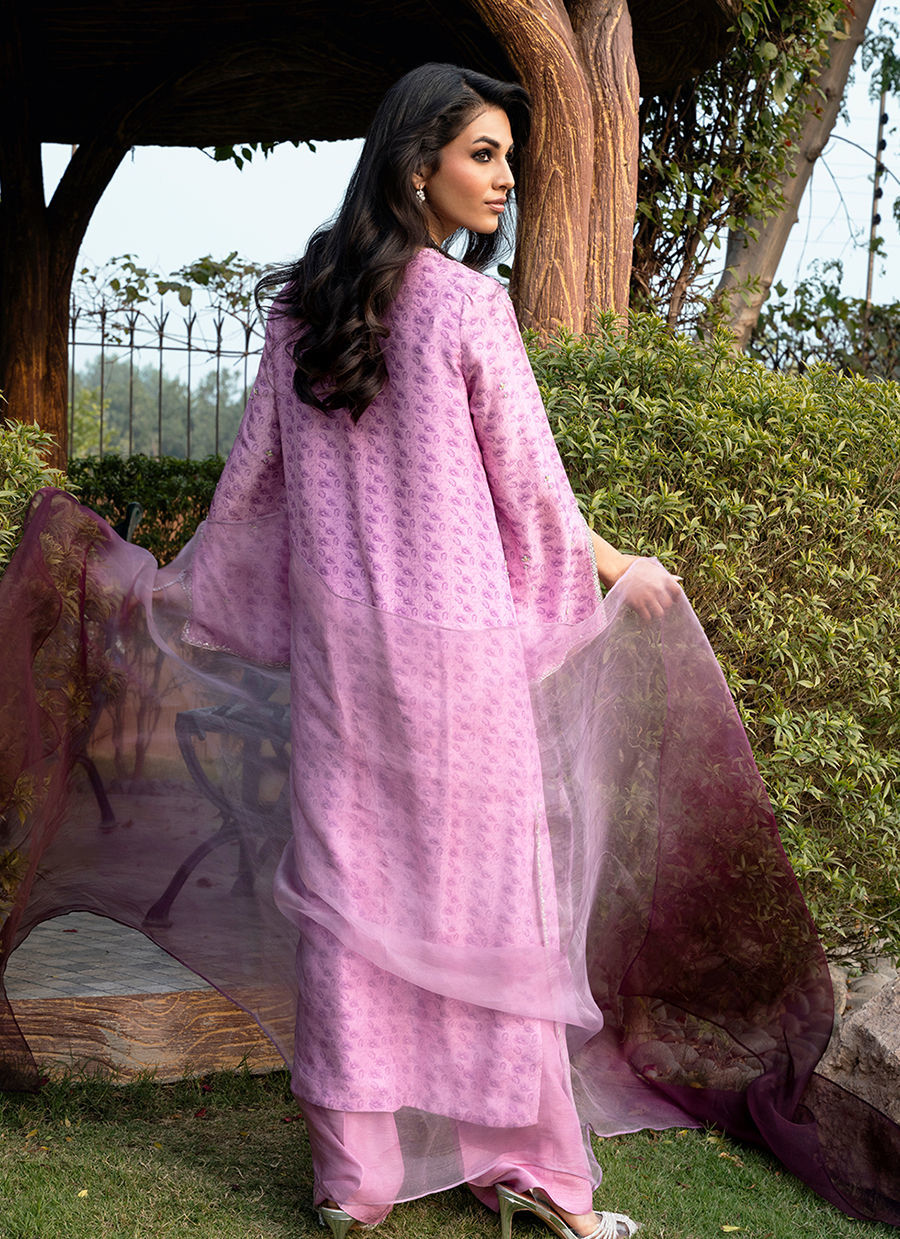 Digitally printed Shirt manufactured from pure raw silk, adorned with a delicate print. The shirt is further enhanced with subtle hand embellishments, adding a touch of artisanal detail while maintaining a soft, graceful aesthetic. It is paired with Korean raw silk pants, designed to complement the look with their structured silhouette. Completing the ensemble is an Ombre dupatta in Organza, draped effortlessly to add lightness and movement, beautifully balancing the richness of the silk textures.