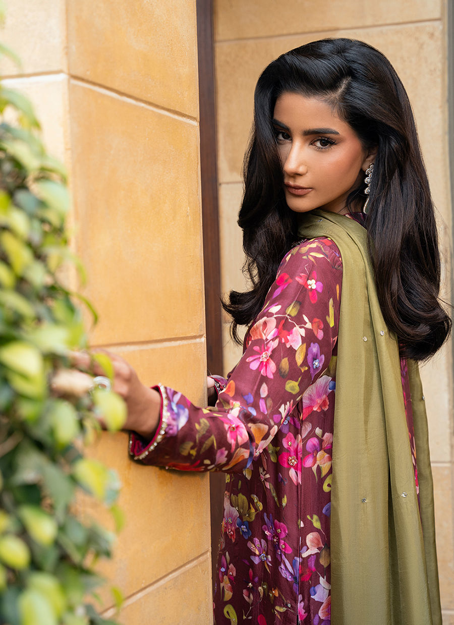 Digitally printed Shirt manufactured in pure raw silk. The shirt features intricate prints and detailed hand embellishments over the the shirt. Paired with it is a Matching pant, in premium pk raw silk fabric, offering comfort while maintaining a regal silhouette. Completing the look is a delicate Kp silk dupatta, light and airy, adorned with a subtle sequin spray.