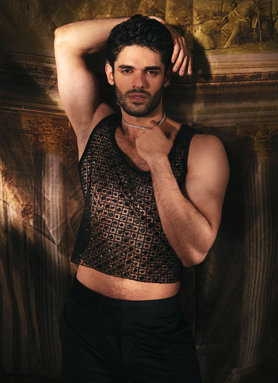 This chic ensemble is the epitome of sophistication and charm. In a deep, lustrous black, it exudes an understated yet powerful allure. The edgy silhouette adds an ethereal touch, giving a distinct and commanding presence. The shimmering sequence and intricate threadwork elevate its elegance, glistening in the light and exuding a magnetic charm. This ensemble encapsulates a perfect balance of sophistication and edge, tailored for the modern man who exudes charisma and confidence with every step.