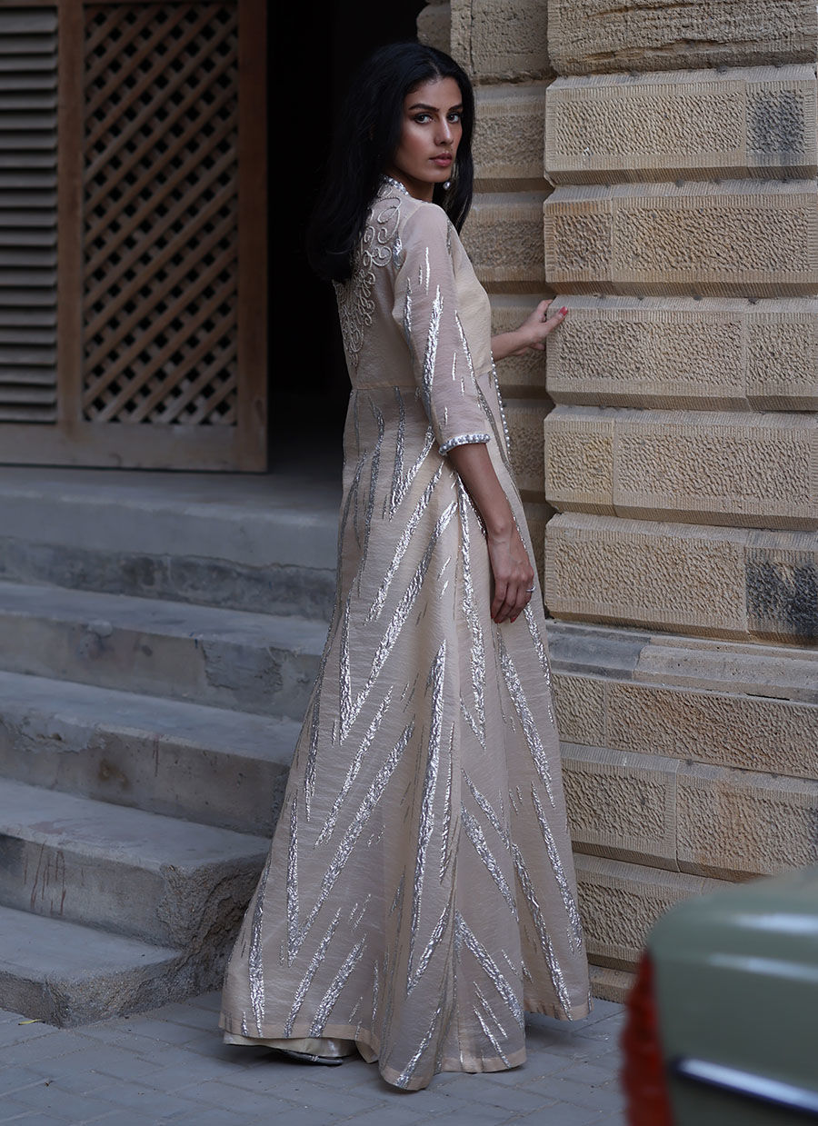 Cut from intricately fancy organza and further embellished with pearls and beaded lace on the front and sleeves. The short blouse layered over a Long shirt with bodice and flare with center slits makes it an undeniably classy ensemble. The outfit is further elevated by handmade dori motif at the back. Complete your look with shimmer silk flare pants.