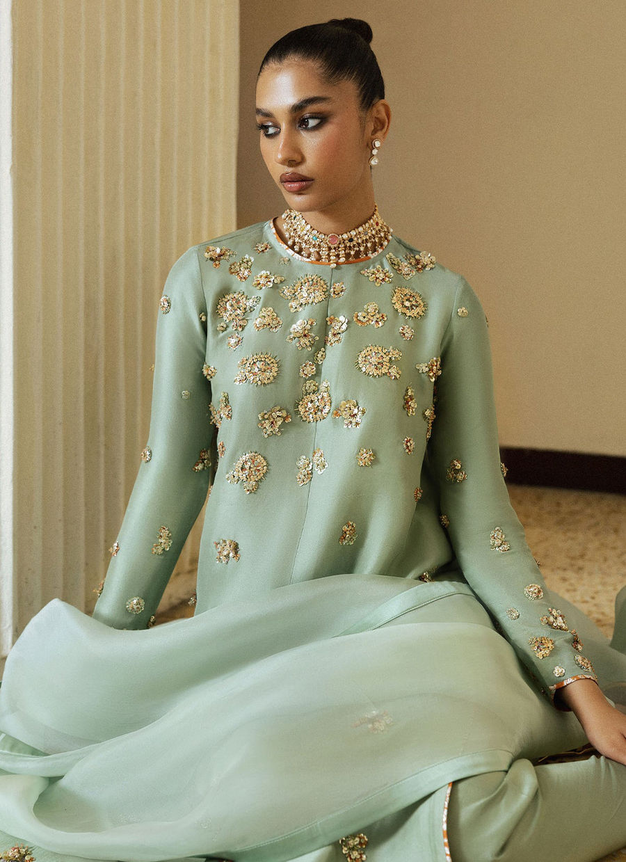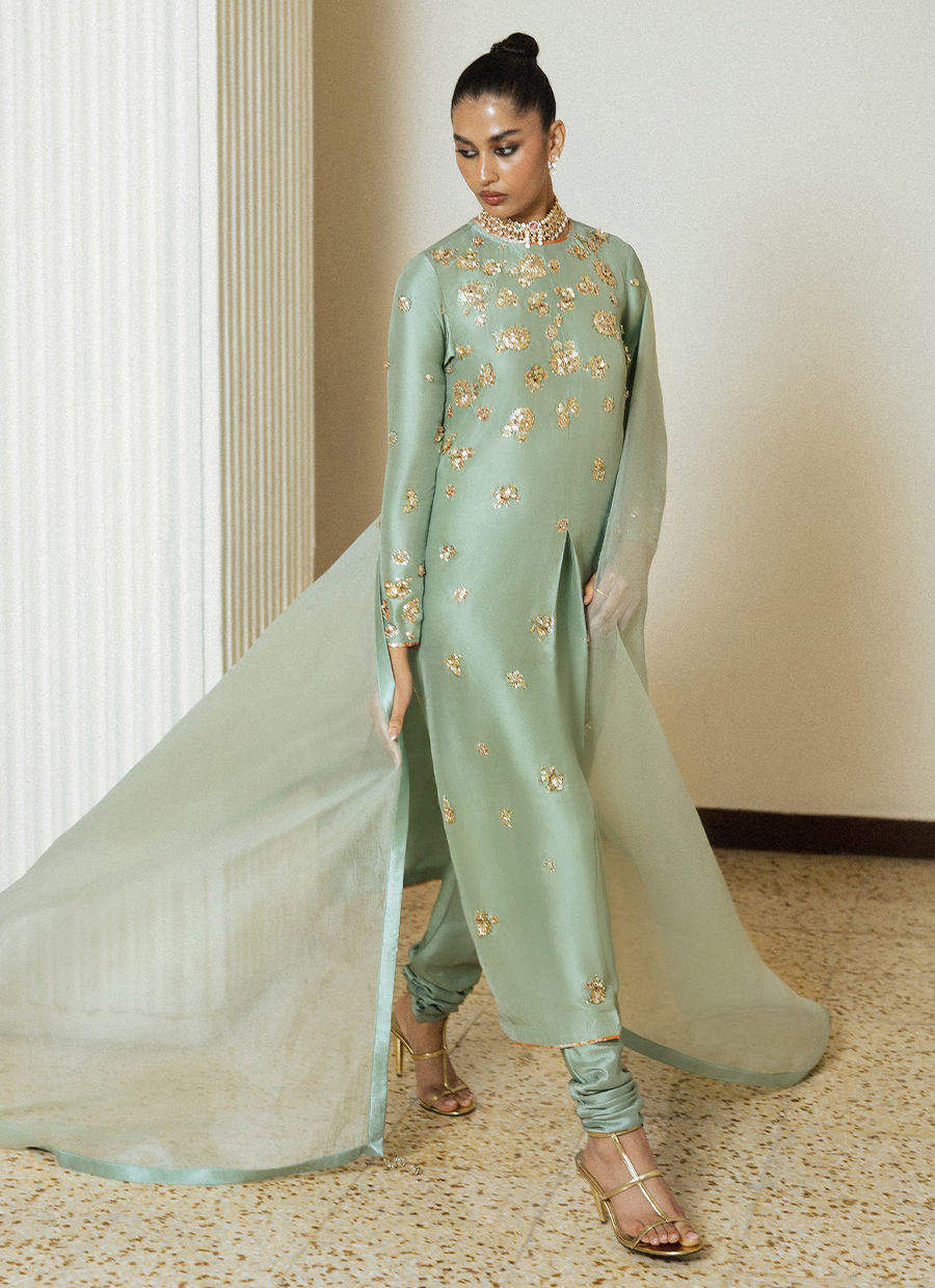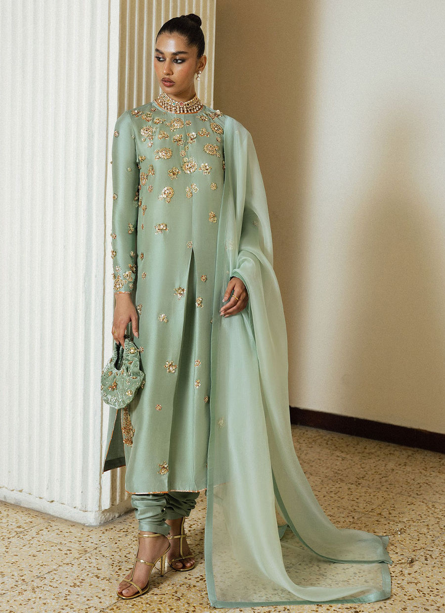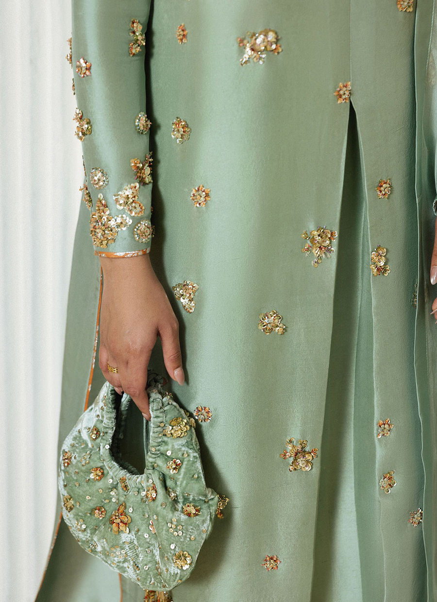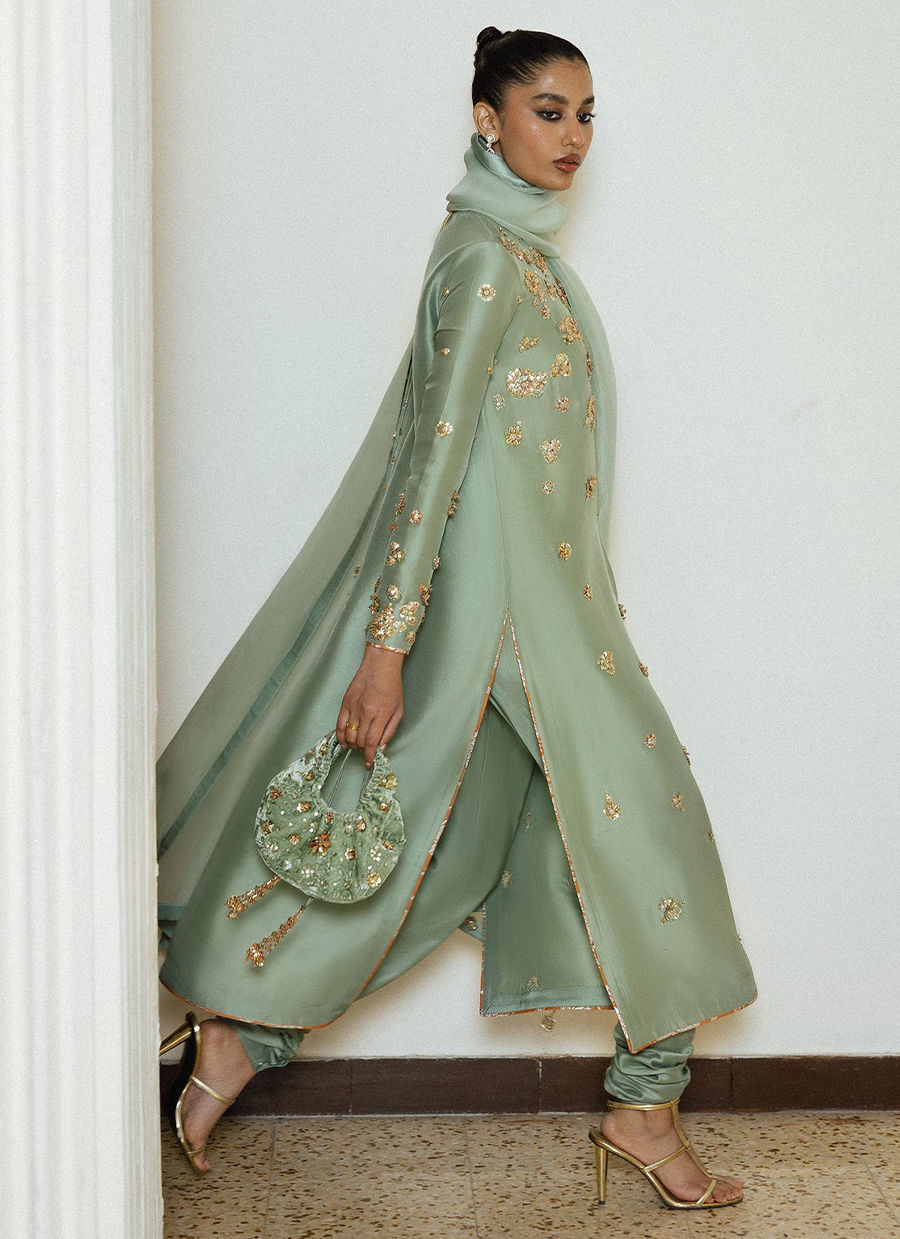 A refreshing mint green outfit adorned with exquisite hand embellishments that radiate refined luxury. The long raw silk kameez features an inverted pleat at the centre front. The outfit is intricately detailed with delicate gold motifs across the bodice and sleeves, creating a soft, luminous texture. Paired with matching raw silk choridaar trousers and a sheer organza flowing dupatta, to elevate the look, pair it with a coordinating embellished potli bag, perfect for festive soirees and elegant formal occasions.