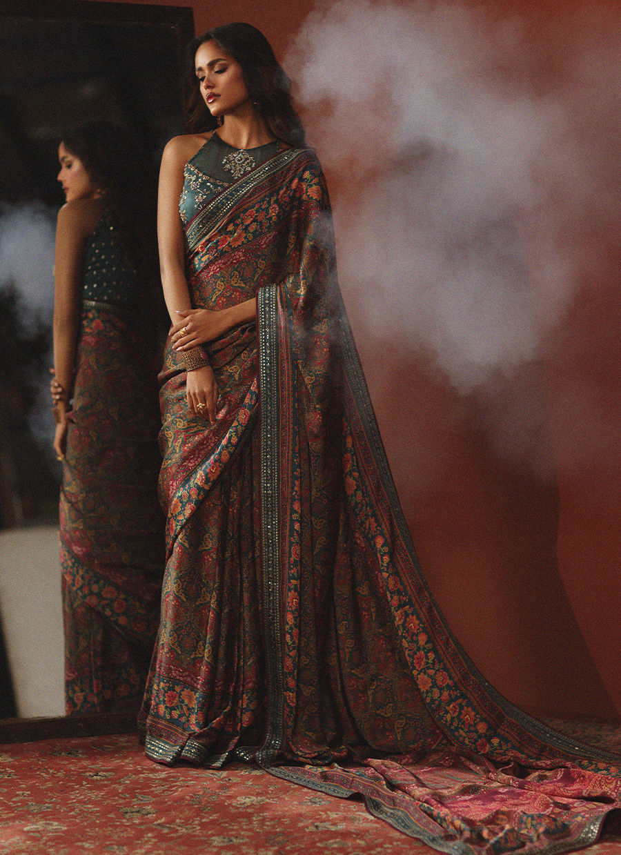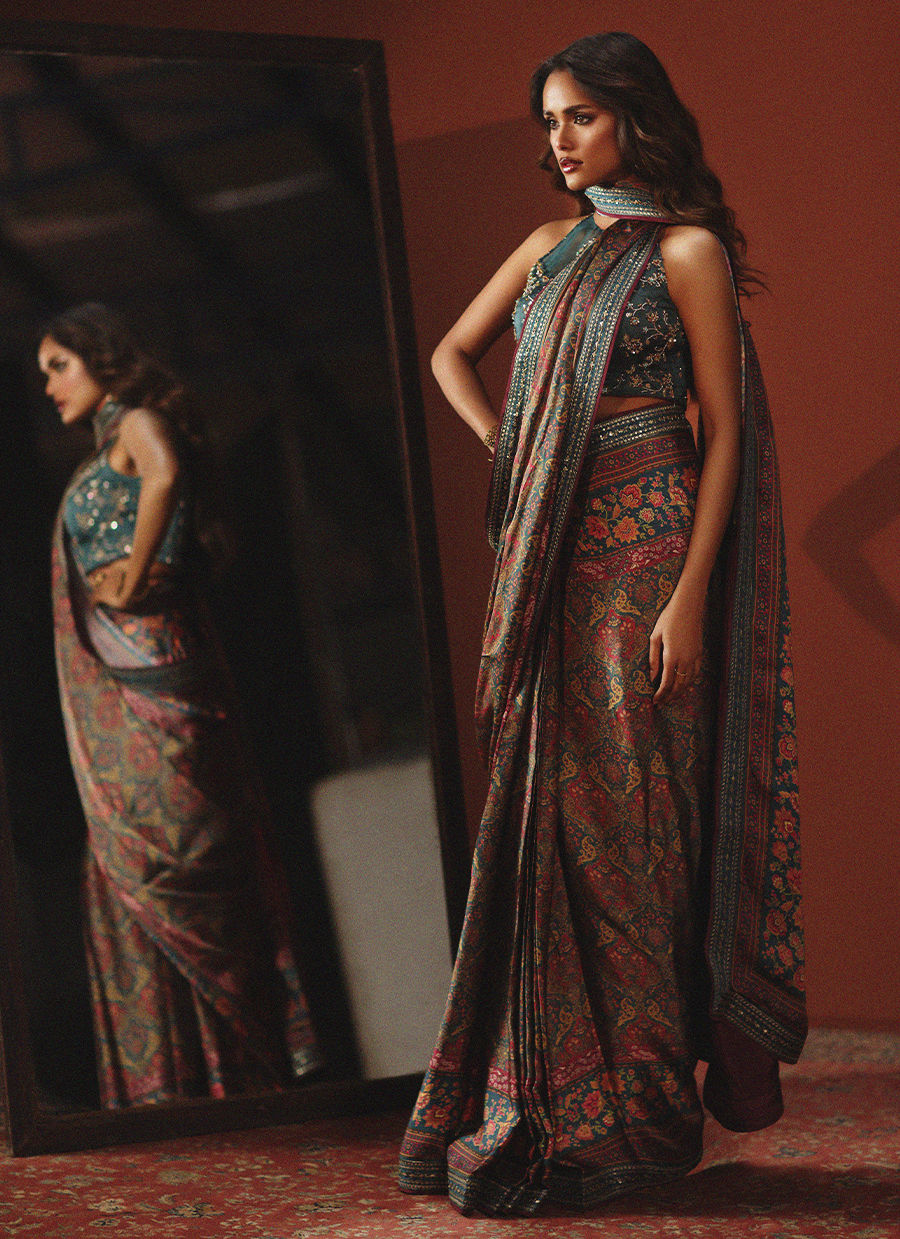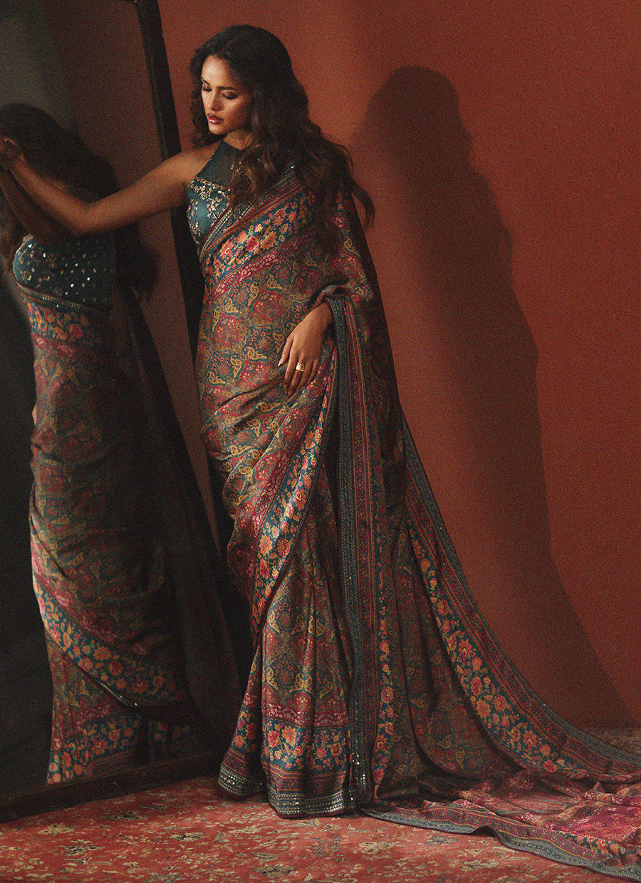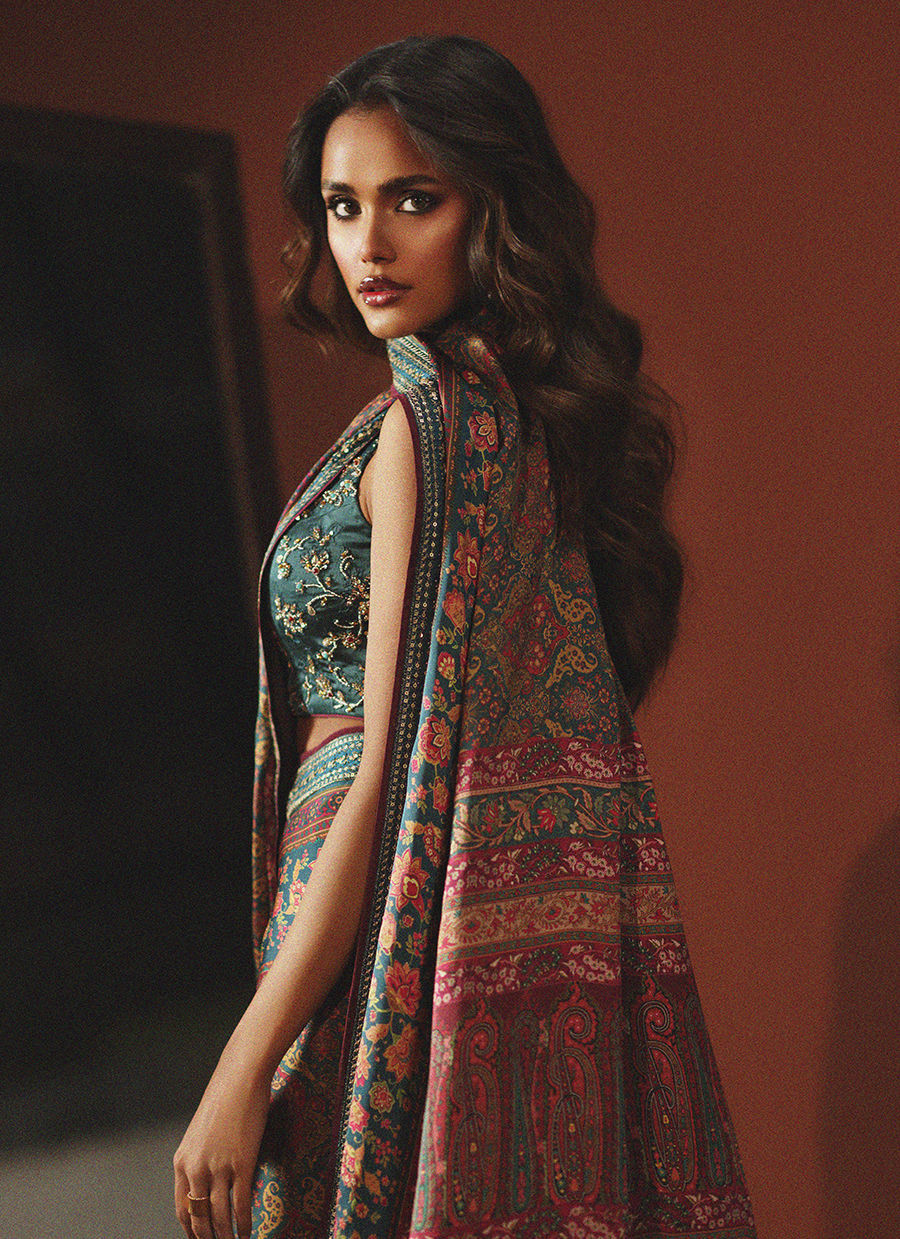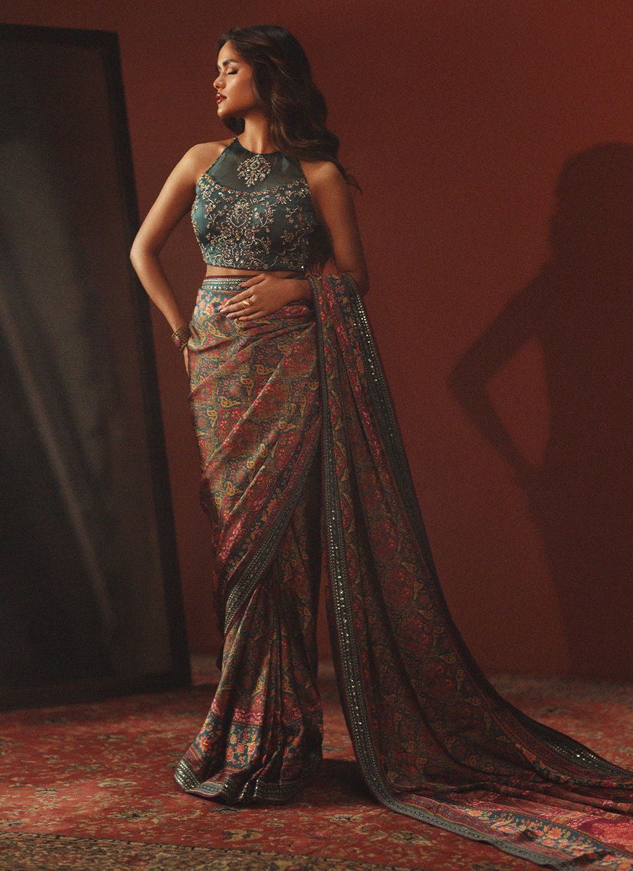 A refined blend of artistry and elegance — this printed silk sari unfolds in rich, intricate patterns, framed with delicately embroidered borders. Paired with a teal blue sleeveless blouse, adorned with meticulous handwork, the look exudes understated glamour and modern sophistication. Effortlessly graceful, it’s a timeless statement for elevated occasions.