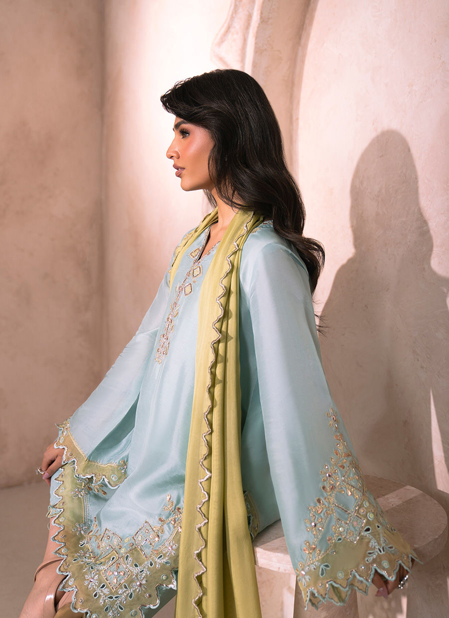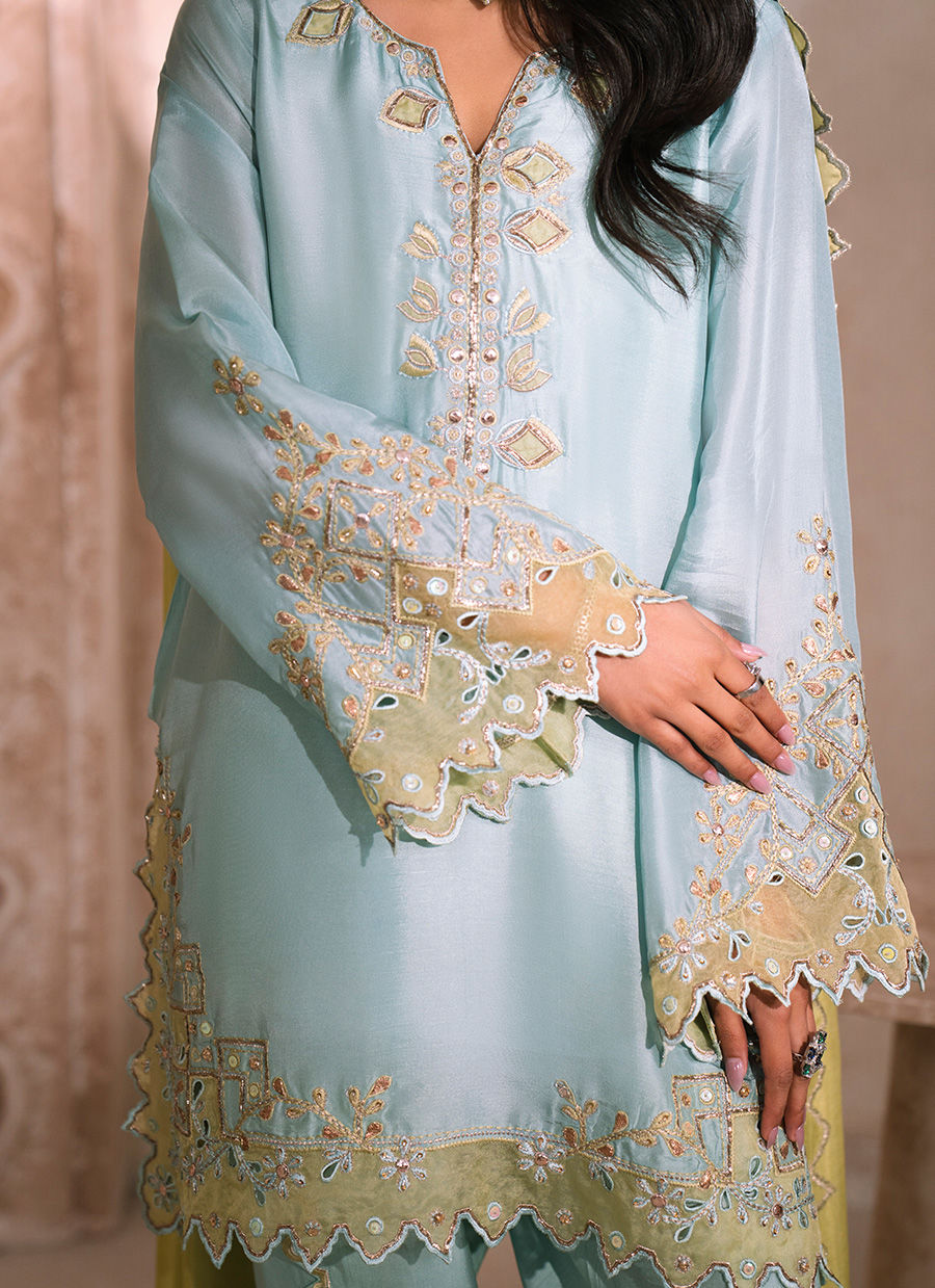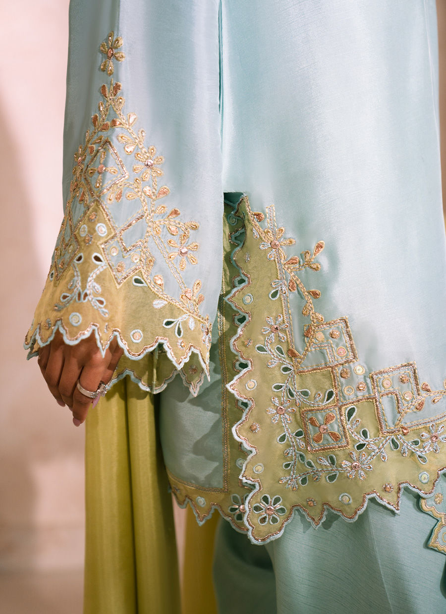 A refined mint blue tissue silk short shirt, gracefully crafted with an intricately detailed neckline, adorned with delicate sequin embellishments and refined outlines of golden pitta work. The sleeves and shirt hem are enriched with pistachio resham embroidery, beautifully complemented by pure organza appliqué and intricate cutwork, meticulously finished with resham and golden pitta accents. Paired with a silk Tulip shalwar, thoughtfully designed with ornate detailing along the hem and signature cut, the ensemble exudes effortless elegance. The look is completed with an optional pistachio silk dupatta, finished with subtle silver-edged detailing, adding a soft yet luxurious finishing touch.