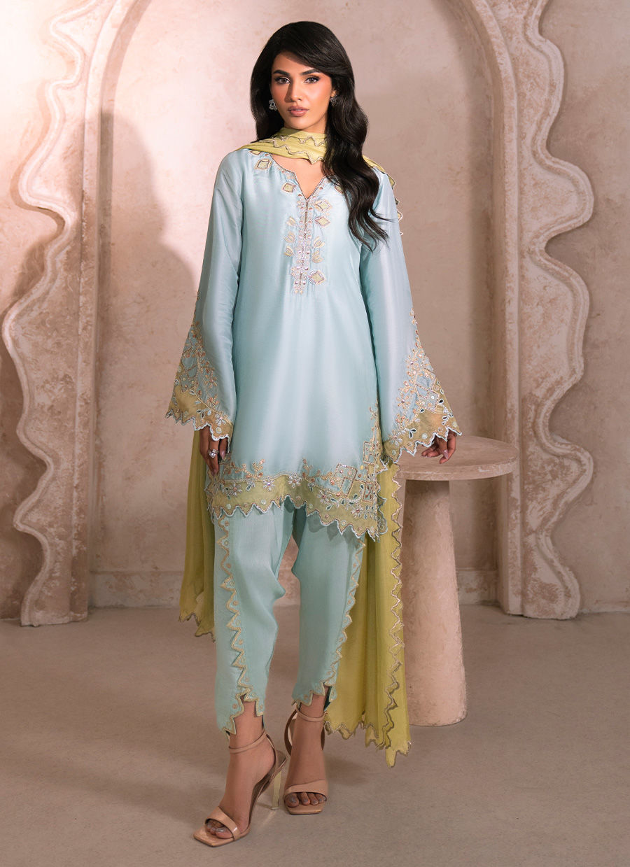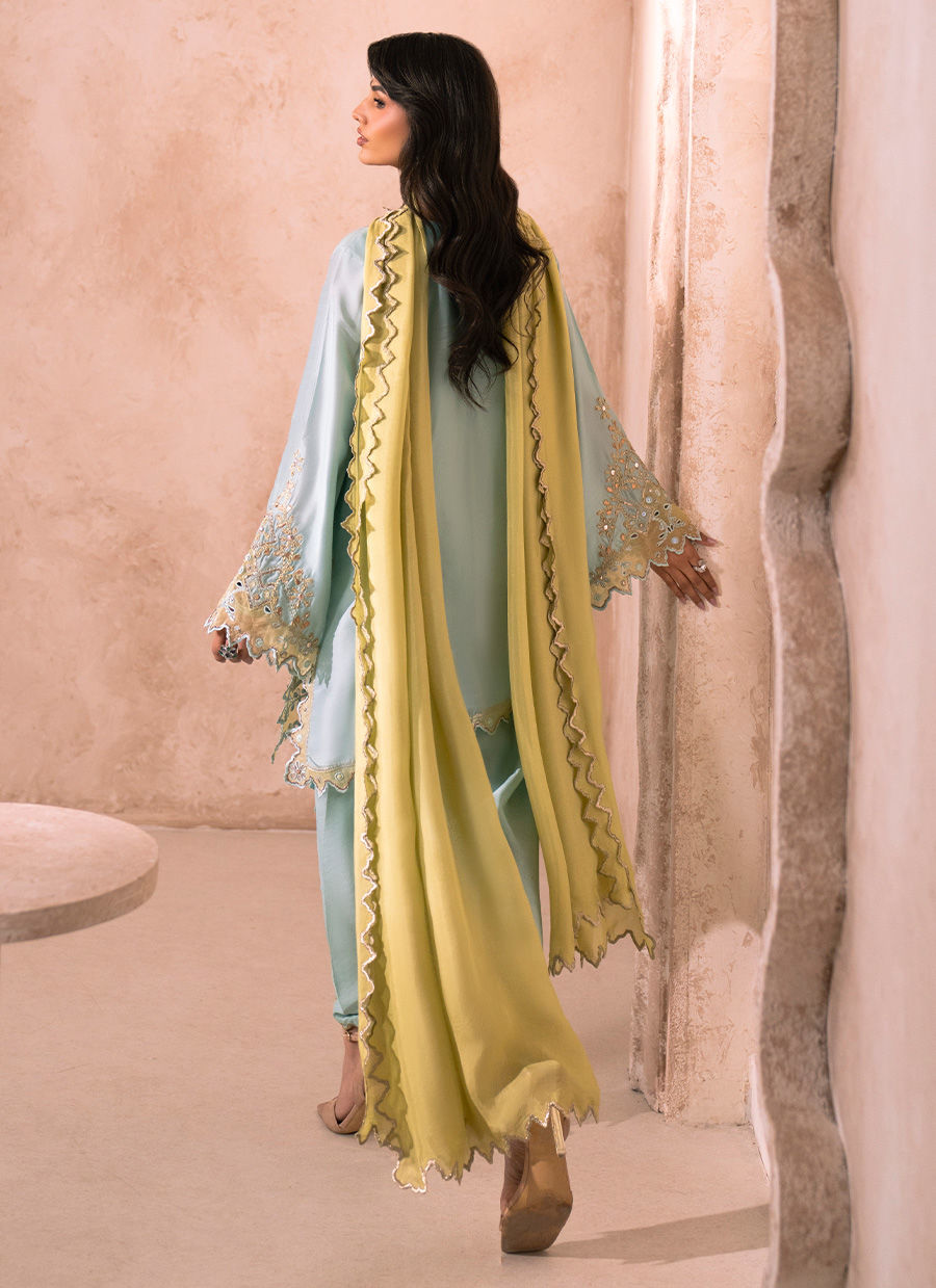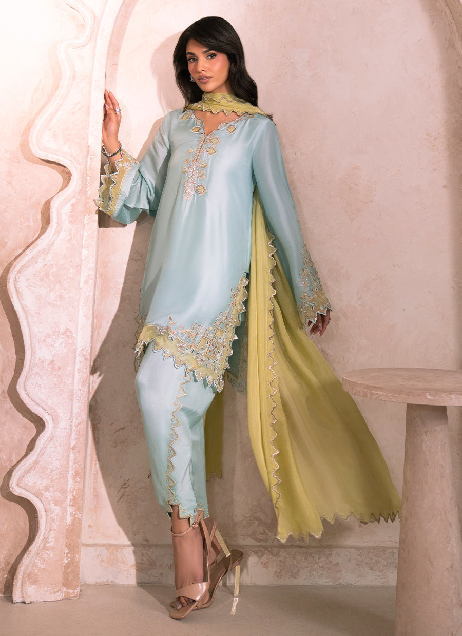 A refined mint blue tissue silk short shirt, gracefully crafted with an intricately detailed neckline, adorned with delicate sequin embellishments and refined outlines of golden pitta work. The sleeves and shirt hem are enriched with pistachio resham embroidery, beautifully complemented by pure organza appliqué and intricate cutwork, meticulously finished with resham and golden pitta accents. Paired with a silk Tulip shalwar, thoughtfully designed with ornate detailing along the hem and signature cut, the ensemble exudes effortless elegance. The look is completed with an optional pistachio silk dupatta, finished with subtle silver-edged detailing, adding a soft yet luxurious finishing touch.
