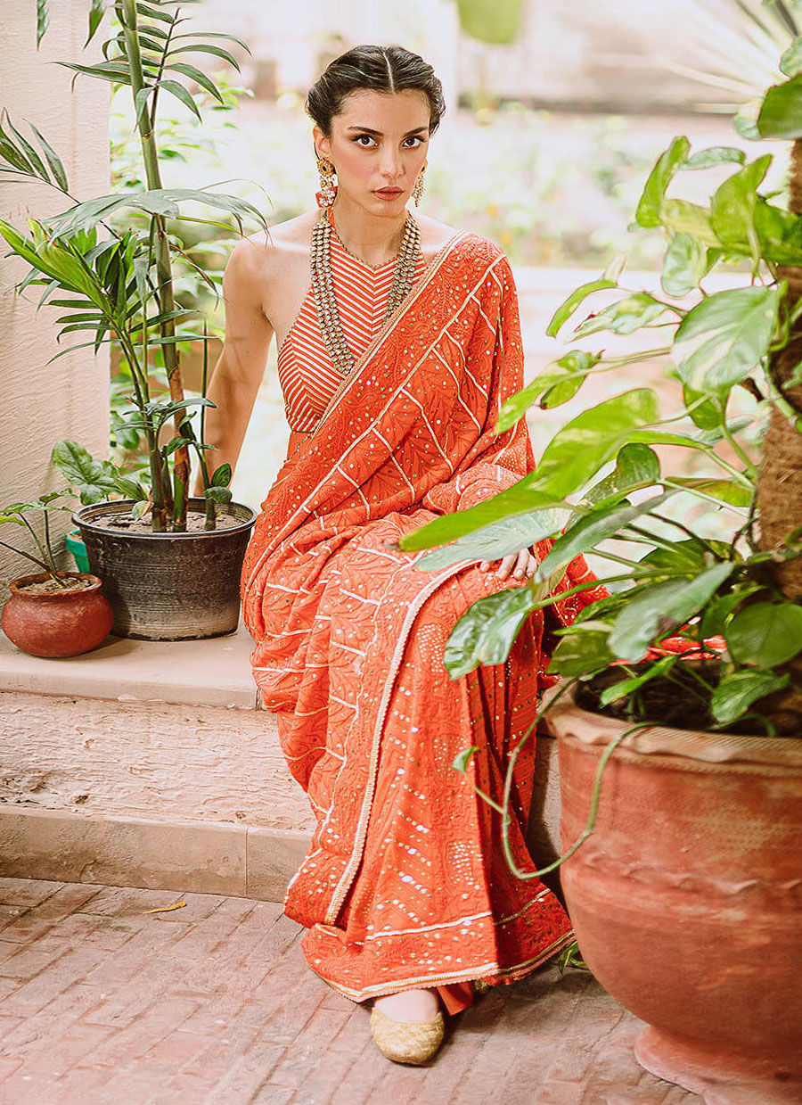 Tehreem wears Maala, immaculate hand rendered chikankari saari in a fresh coral tangerine hue. It is highlighted with a generous spray of hand stitched Mukesh and worn with a rawsilk blouse with gotta chevron pattern.