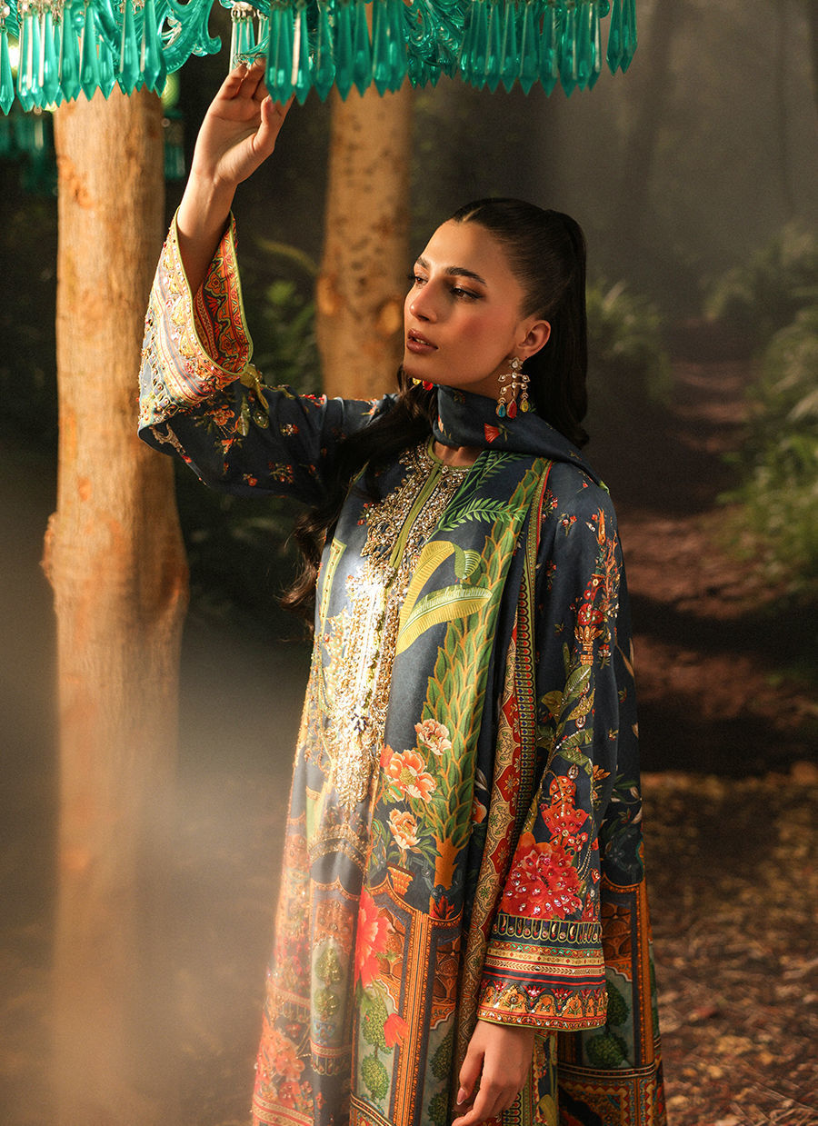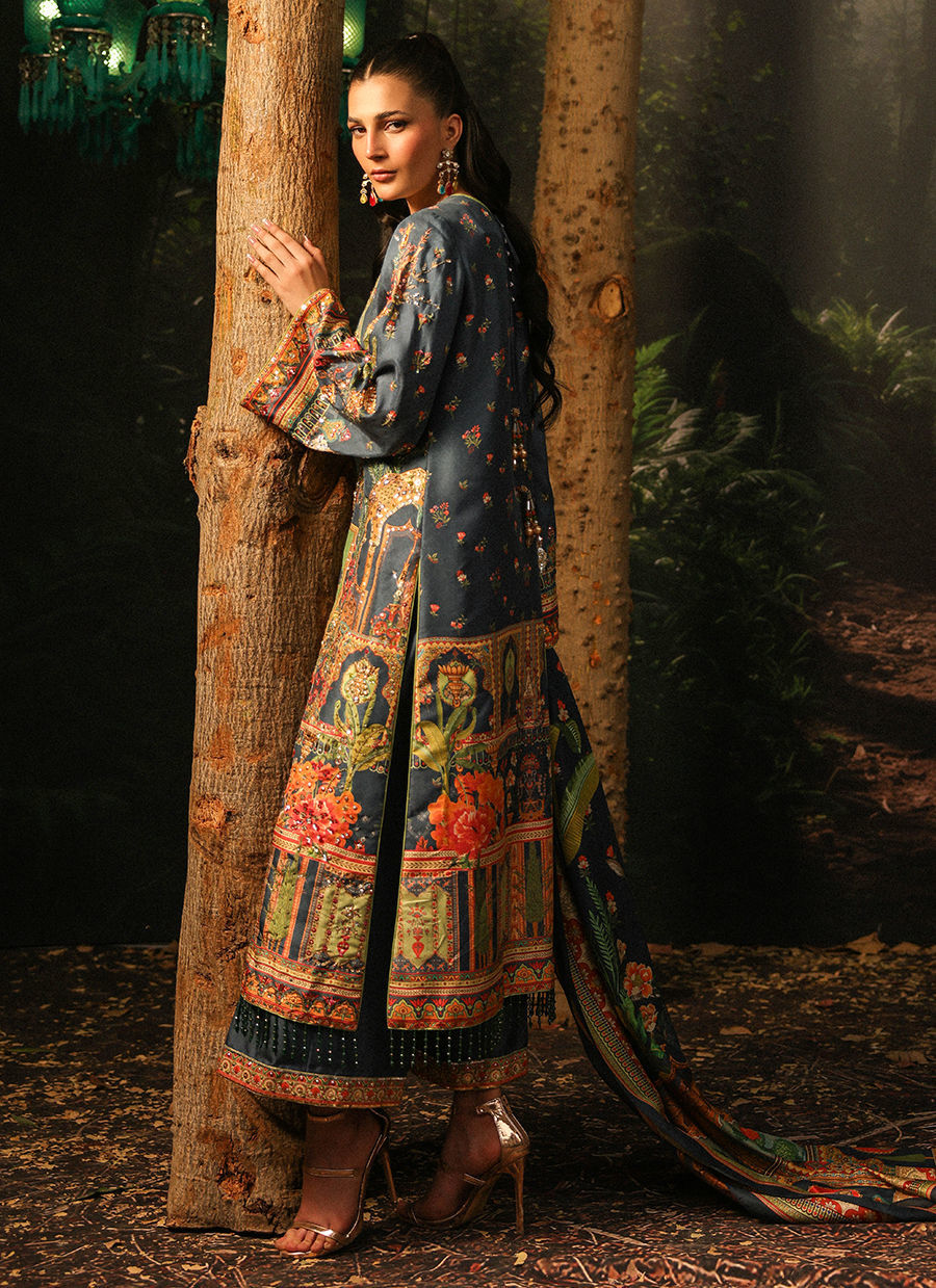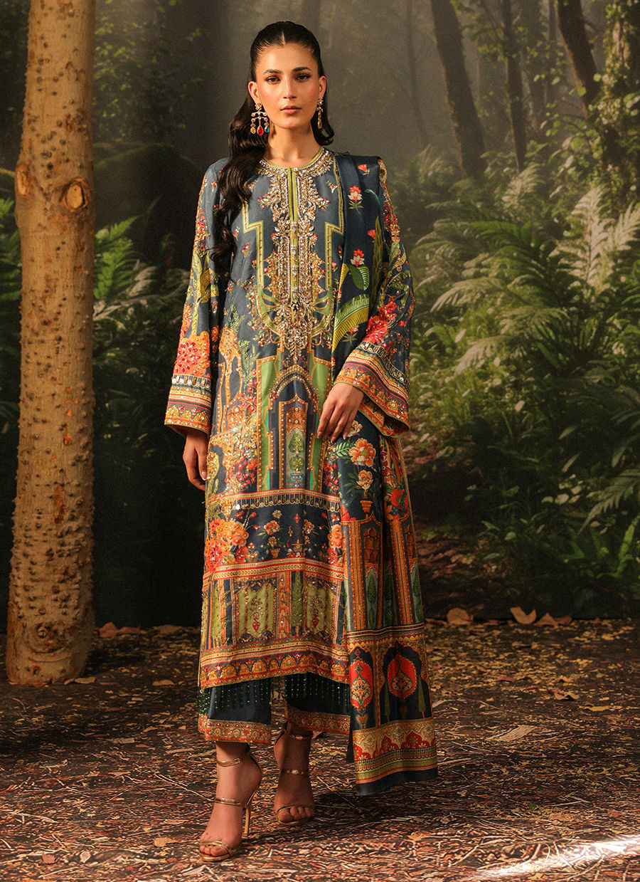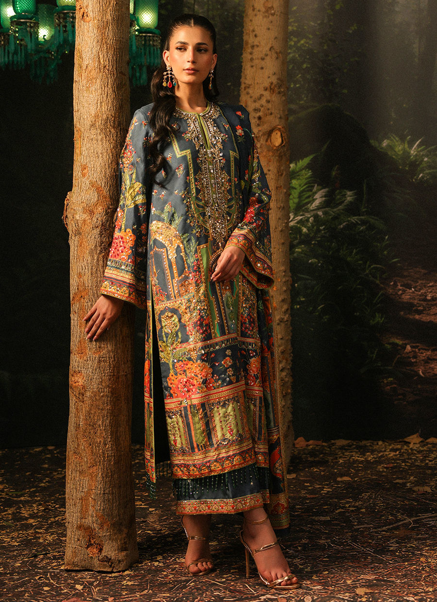 Bold dark colours paint a pretty picture with a Mughal theme and a rich bedazzled neckline, and gold silver detailing all over.