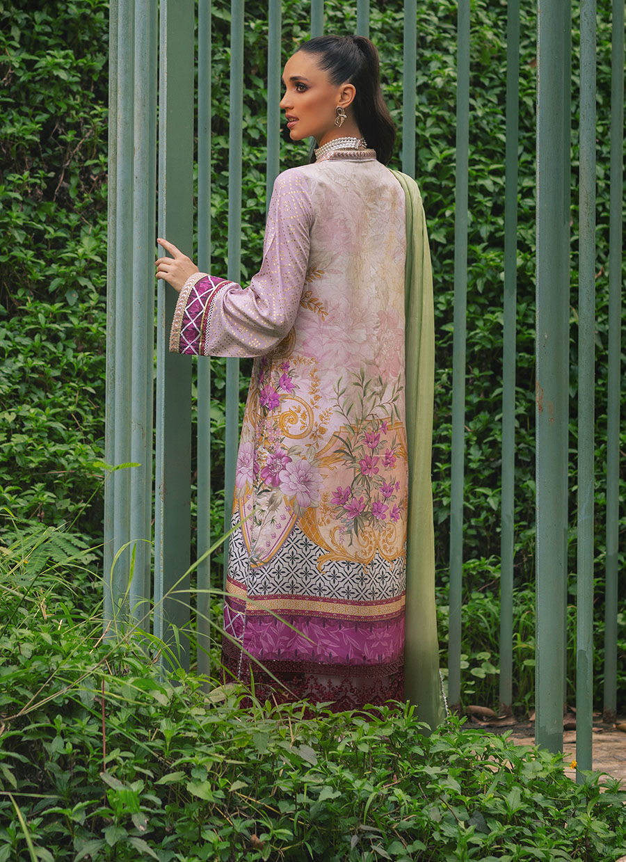 Cut on pristine pure raw silk 'Maia' features floral and geometrical self-printed details, the neckline is adorned with shimmering lorex which is further decorated with hand crafted embellishments. The hem is enhanced with light catching embroidered organza panel and criss cross gota details. The shirt comes with pure silk ombre dupatta with gota finishing’s. The outfit can be paired with matching raw silk pants.